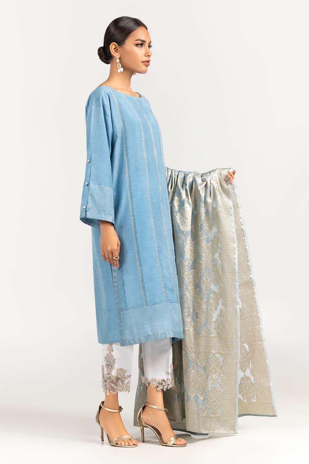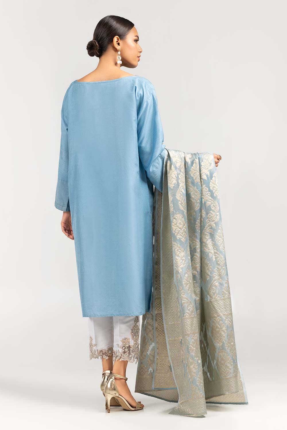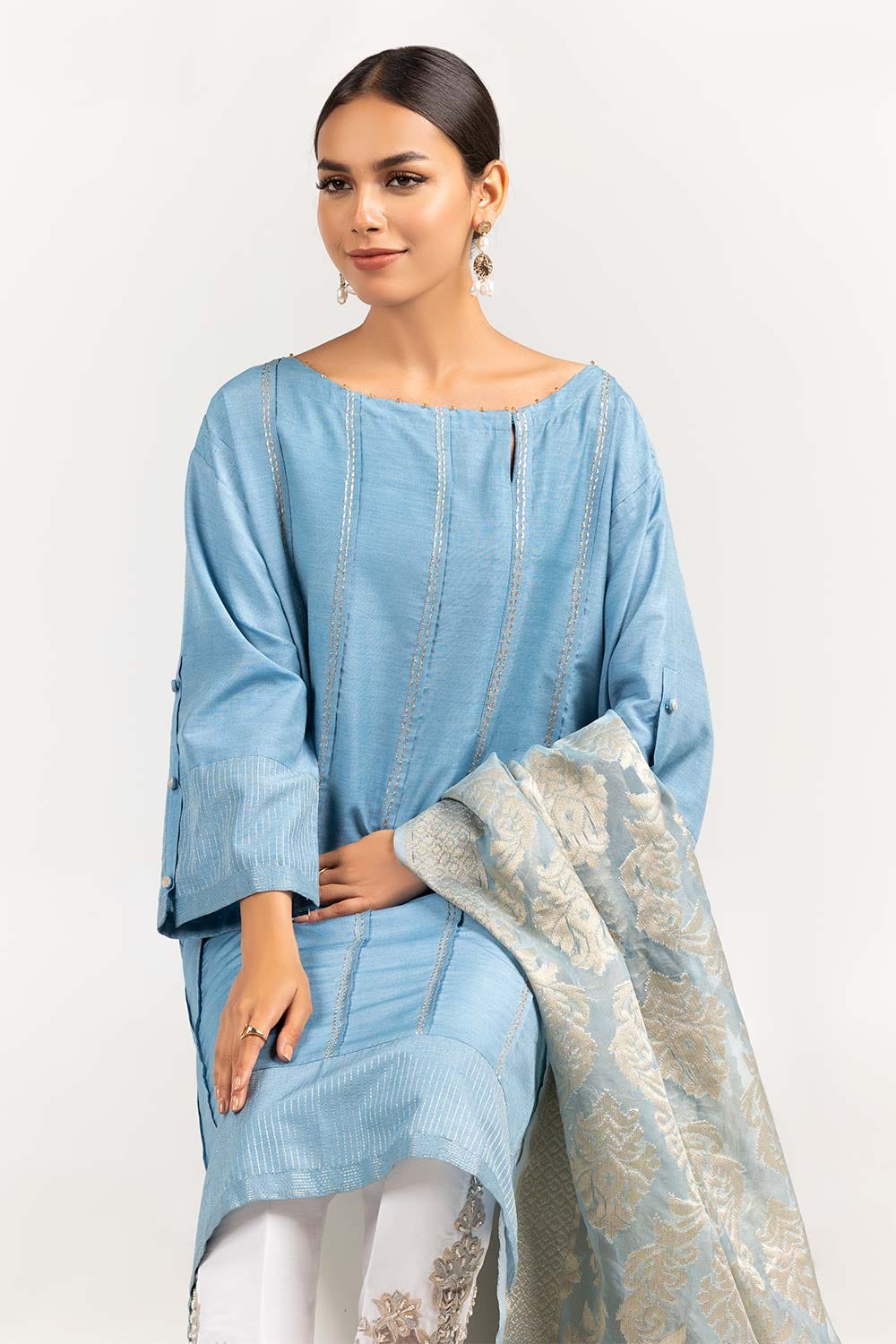 Ready to wear Shirt: Sky blue kathan silk kurta with fine embroidery work on the front, boat-shaped neckline with beads, and flowing sleeves with button detailing