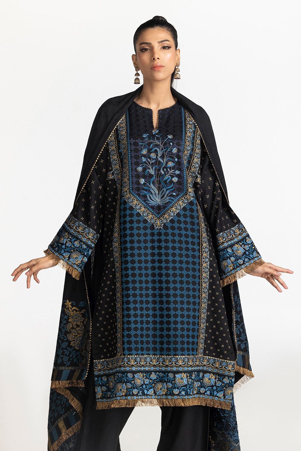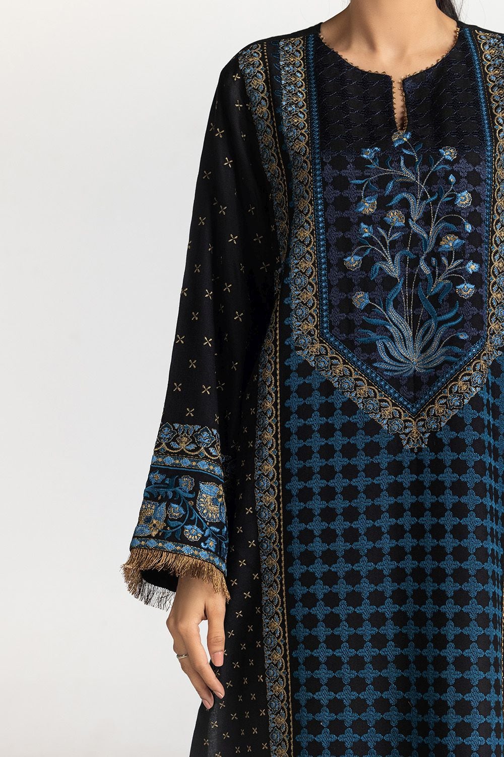Ready to wear Enhance your wardrobe with our 3Pc Jacquard Suit, featuring wide-leg trousers with a printed hem for added style. The shirt is adorned with embellishments on the button patti, while the dupatta offers a blend of modern and timeless elegance, making this ensemble perfect for any occasion.