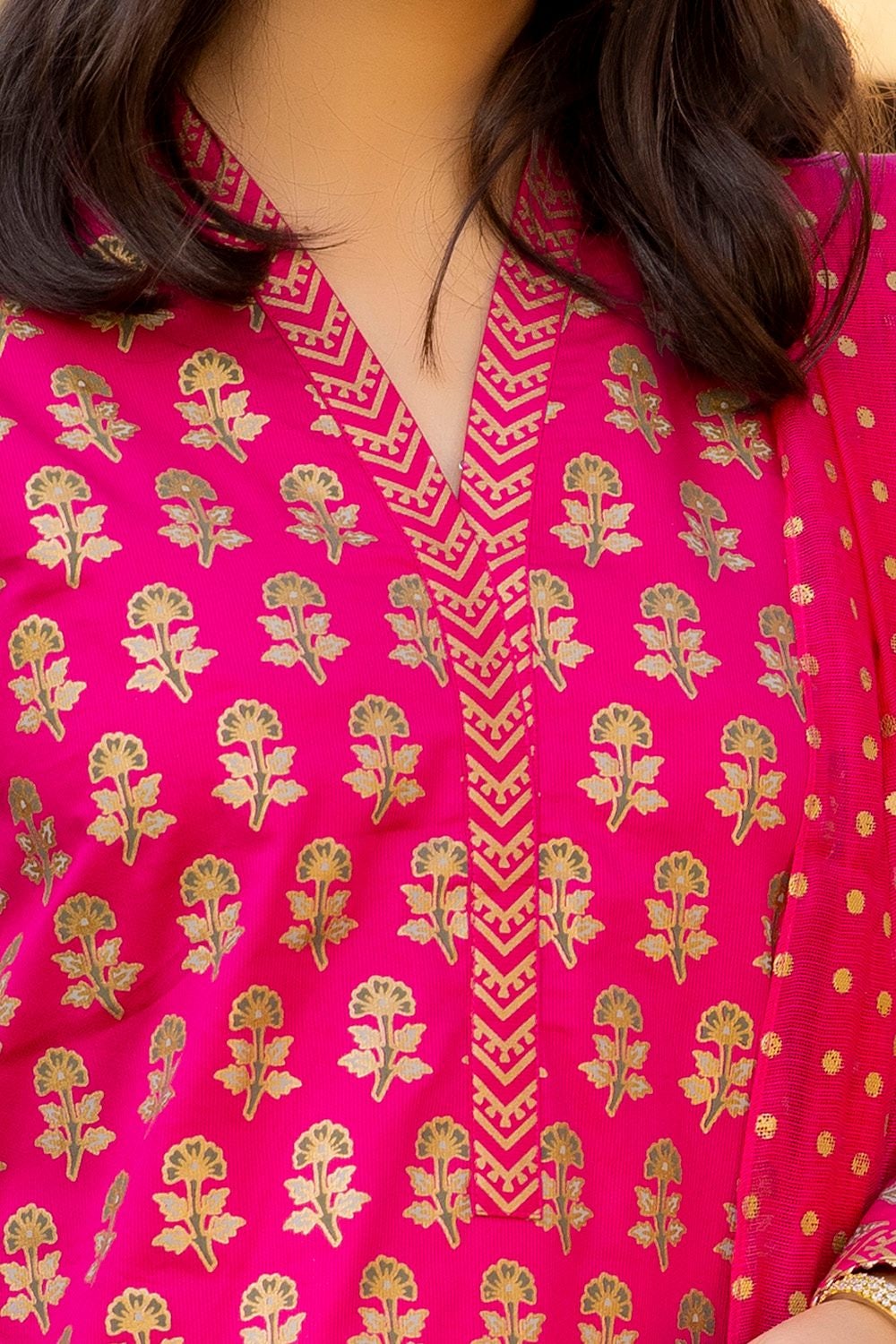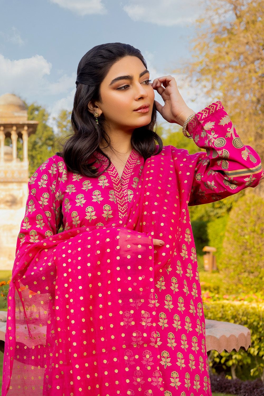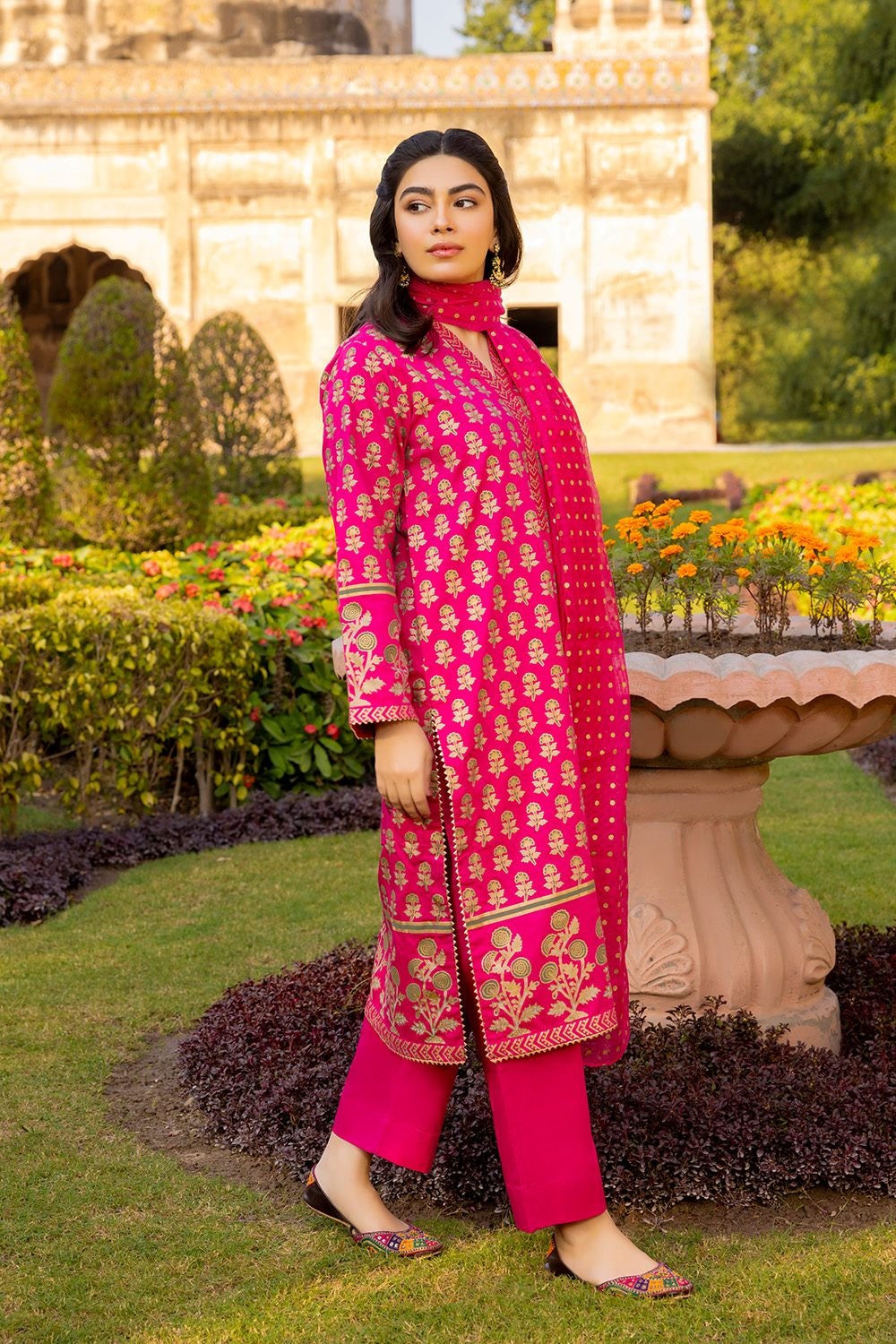 Make a bold statement with this stunning 3Pc Red Corduroy Block Printed Suit. Featuring a luxurious corduroy shirt and straight pants, paired with an exquisite block-printed khaddi net dupatta, this ensemble is designed for those who embrace elegance with a touch of drama