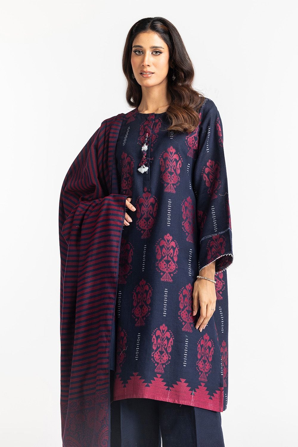 Ready to wear Enhance your wardrobe with our 3Pc Jacquard Suit, featuring wide-leg trousers with a printed hem for added style. The shirt is adorned with embellishments on the button patti, while the dupatta offers a blend of modern and timeless elegance, making this ensemble perfect for any occasion.