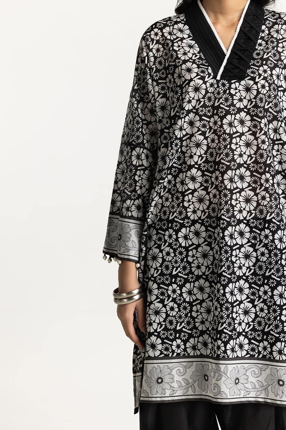 Ready to wear Captivating and stylish, this beautiful 3PC black outfit is adorned with intricate white floral motifs. The sleeves feature border detailing that matches the patterned border on the straight hem. The V-shaped neckline is trimmed with black, adding a striking contrast to the outfit's overall aesthetic.