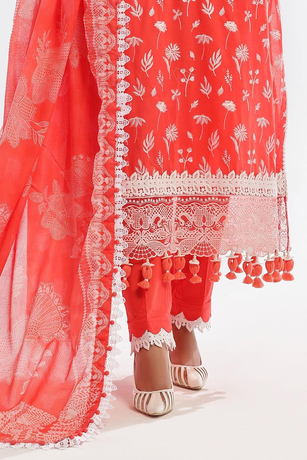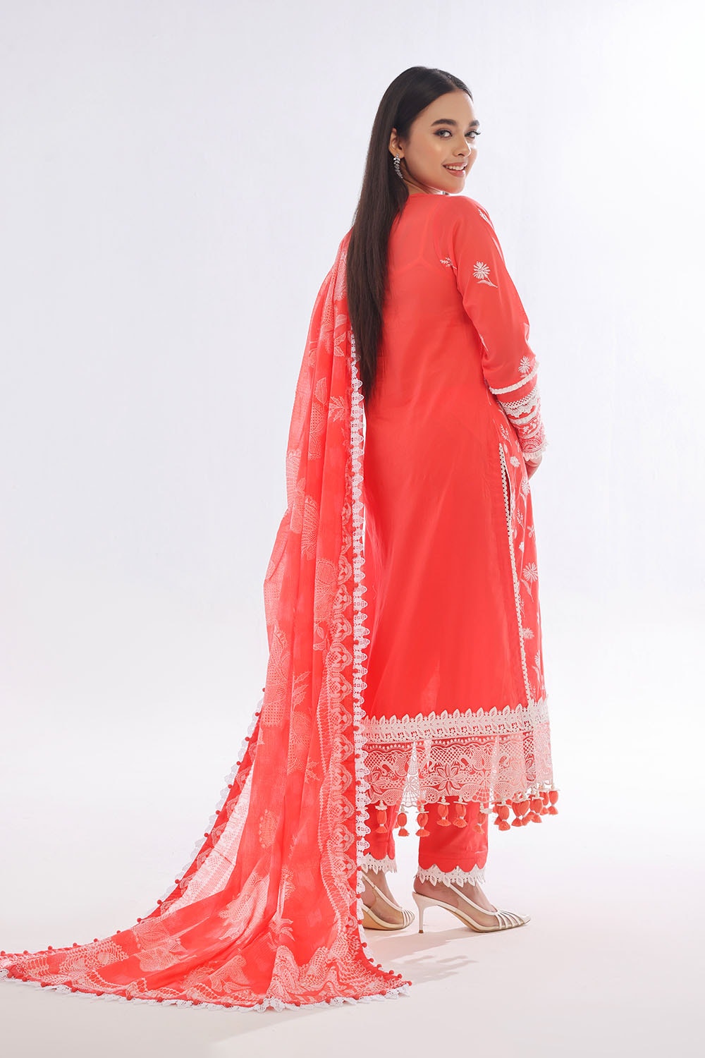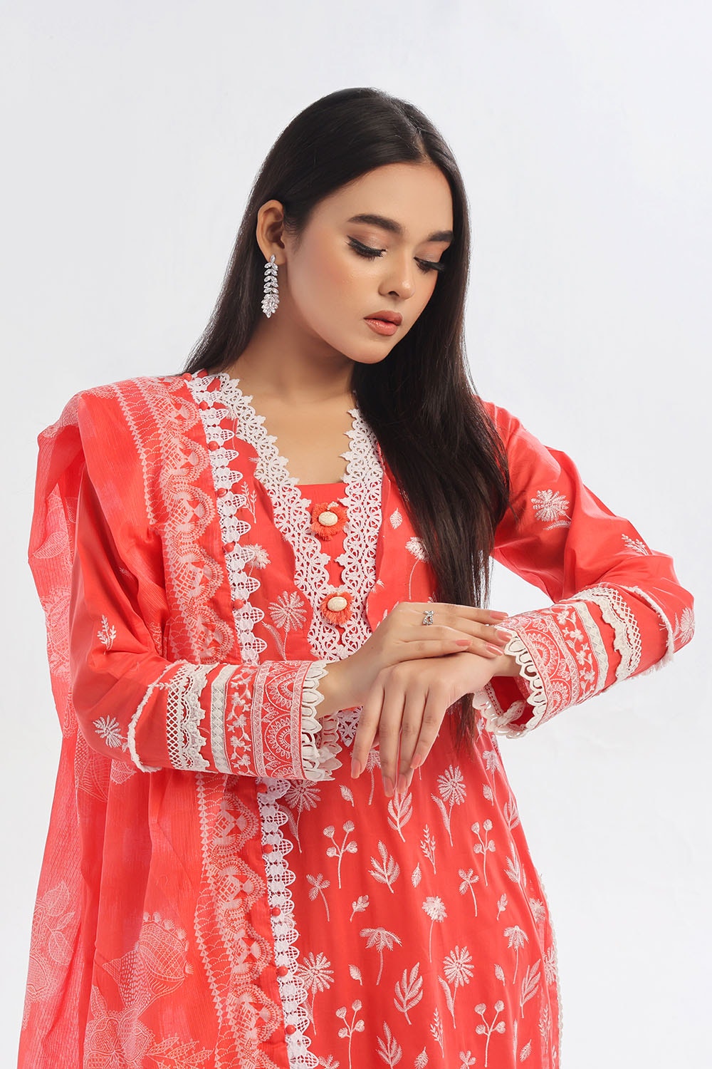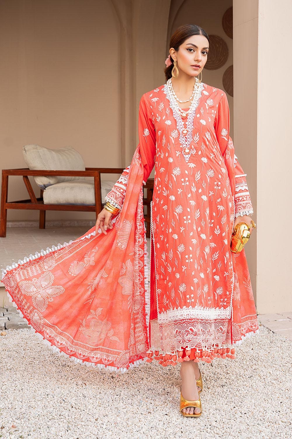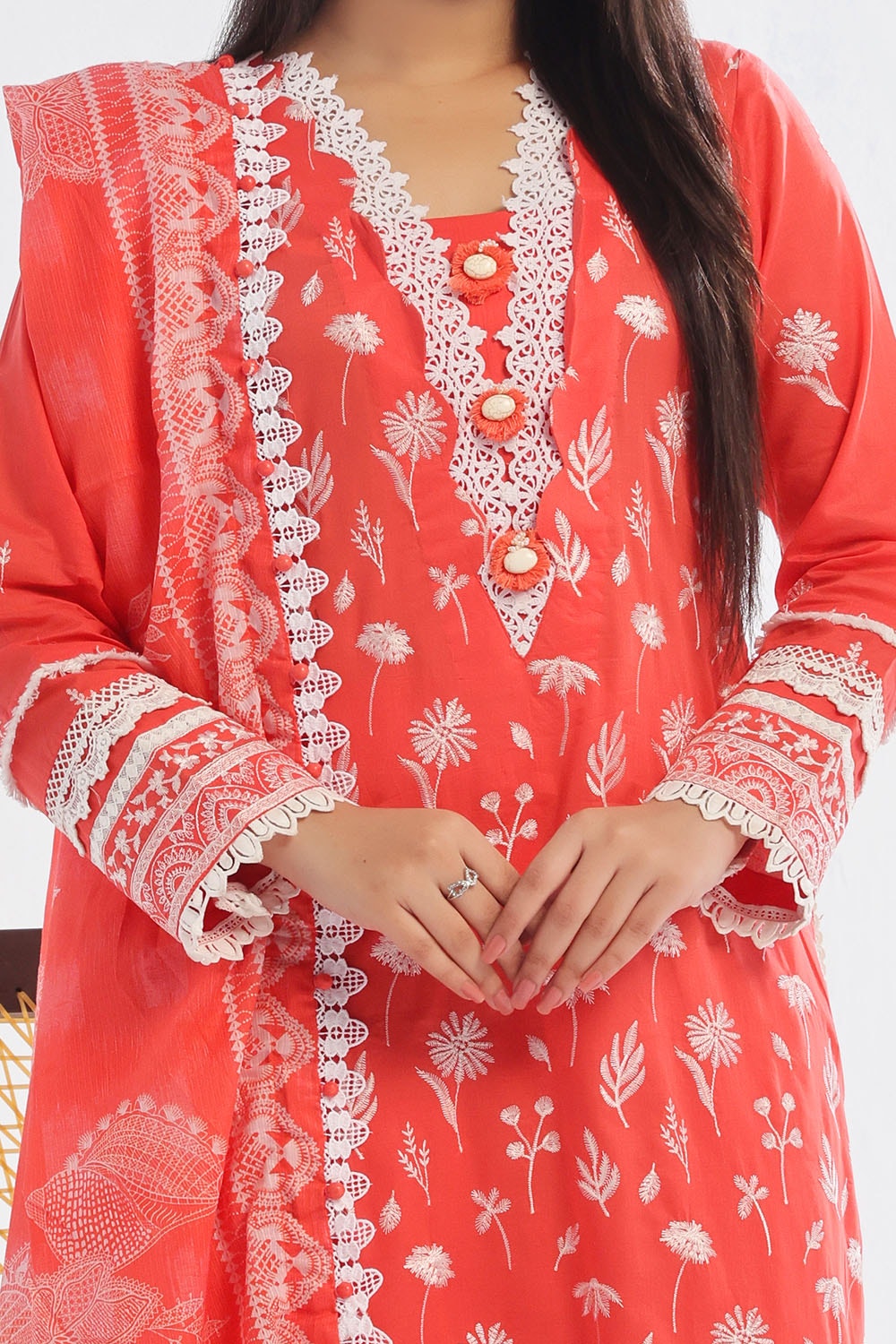 • Embroidered Lawn Shirt Front & Sleeves. Embroidered Borders for Front & Back on Organa. Dyed Lawn Back - 3.15 Meters