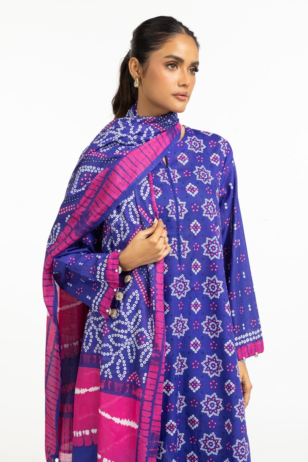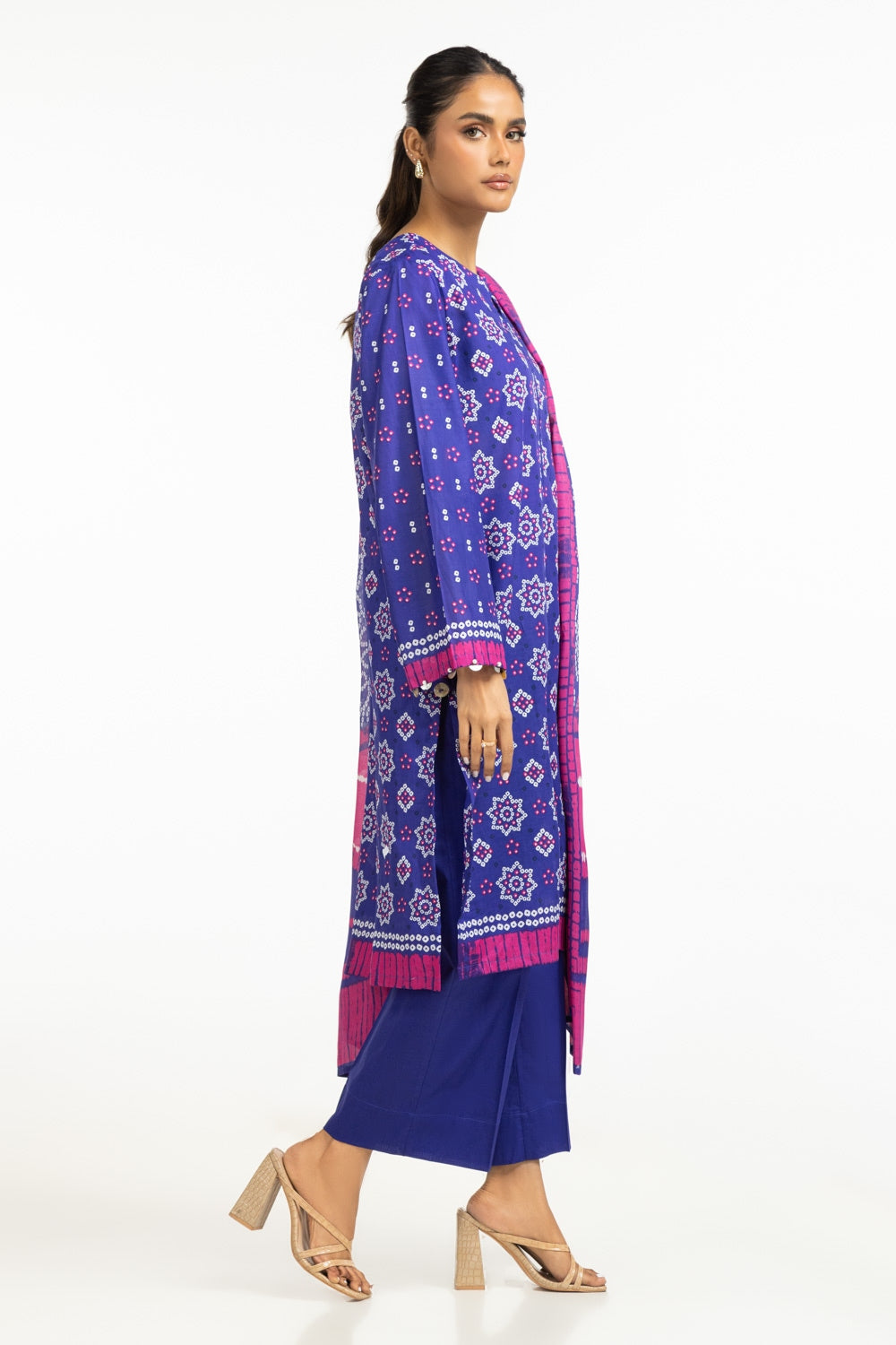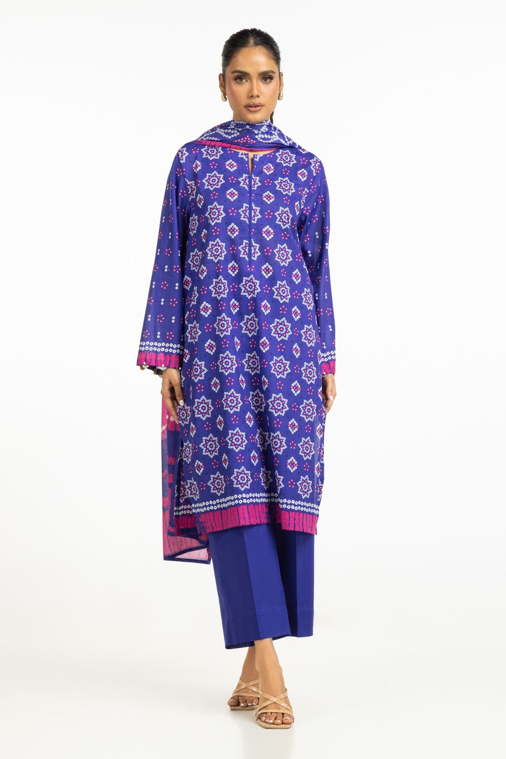 Stay cool and stylish in this delightful lawn outfit. The cheerful printed shirt, paired with graceful dupatta and beautifully dyed trousers, offers a fresh and trendy option for your everyday summer wardrobe.