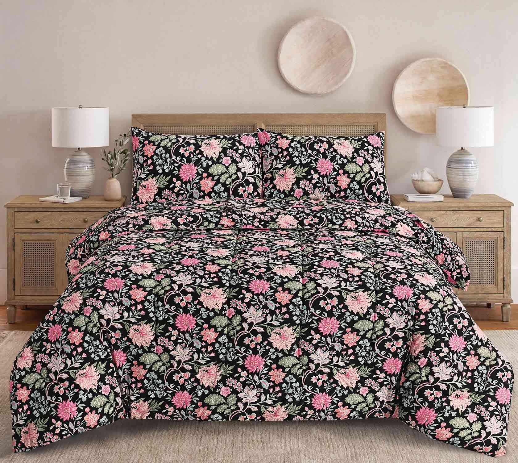 A full Bed Set Includes a comforter with pillow covers and a bed sheet. Available in beautiful and elegant prints. Pick your favorite.