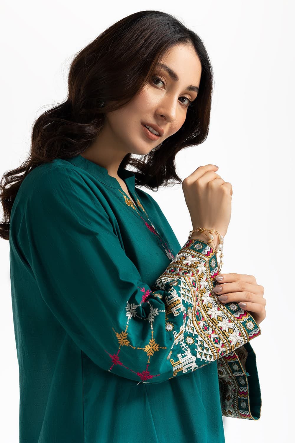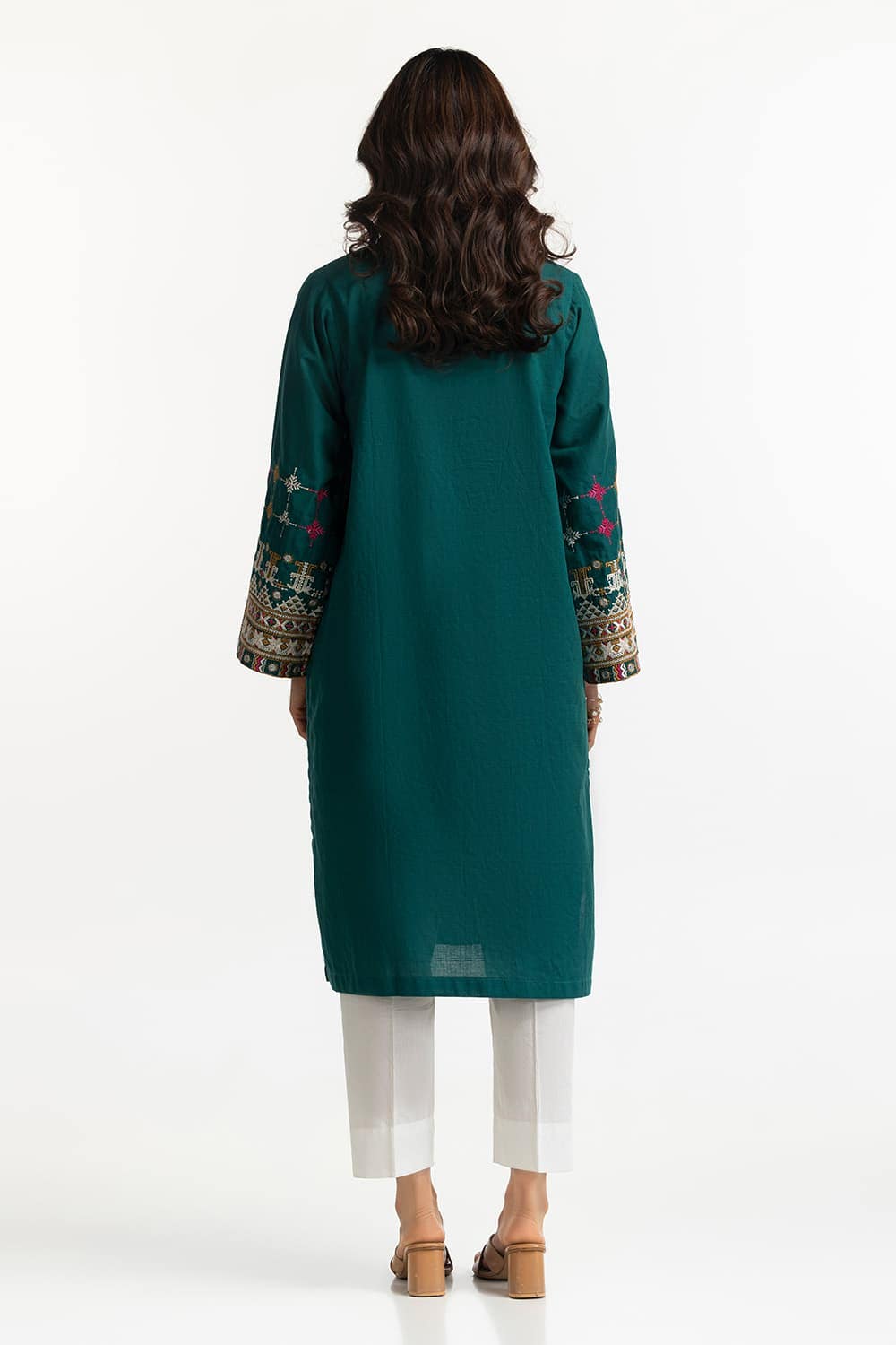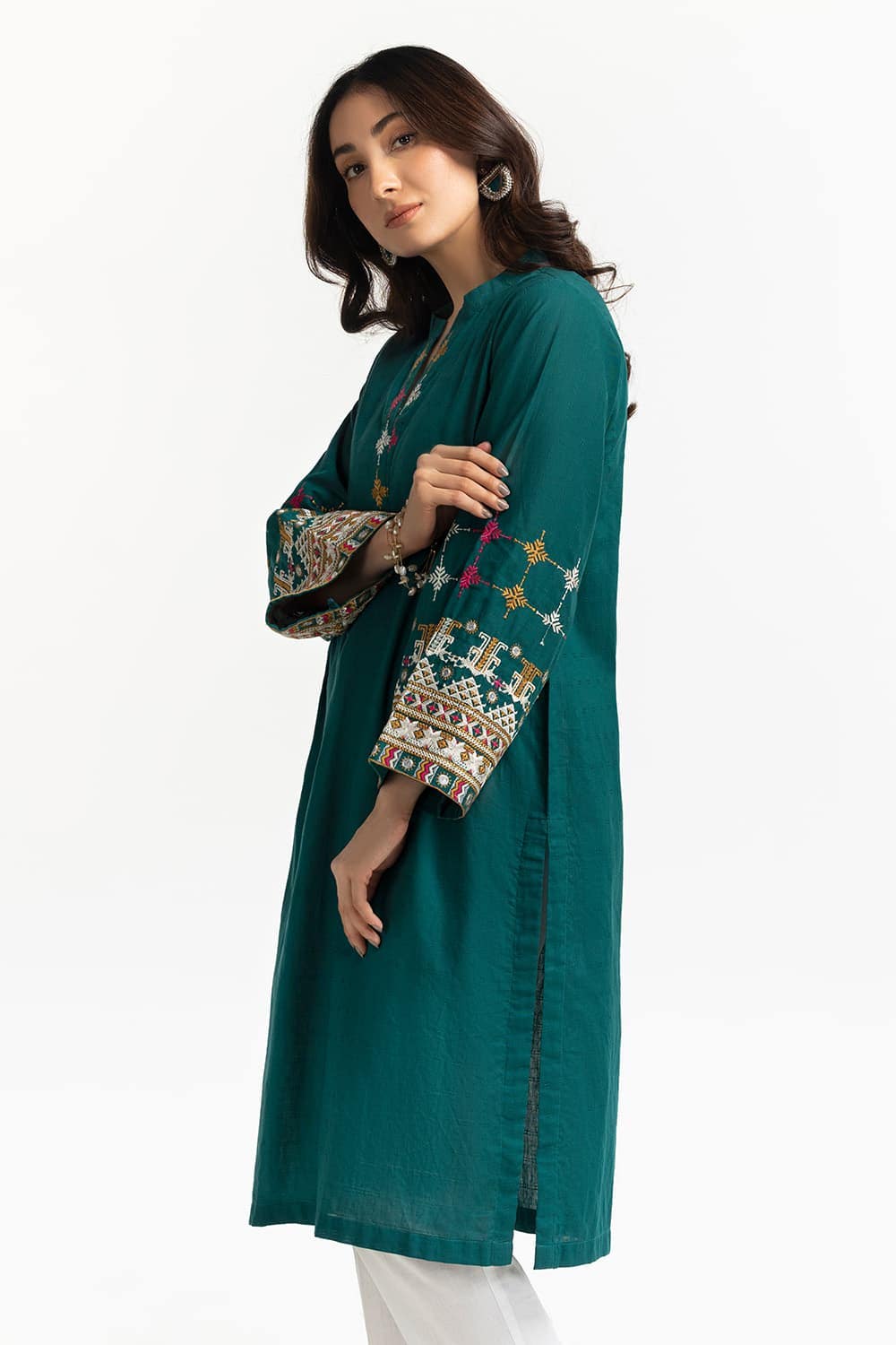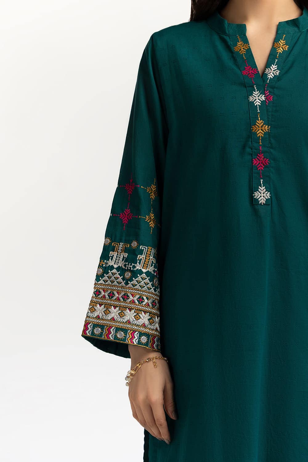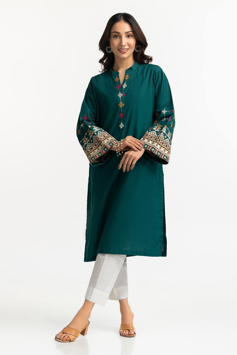 Ready to wear This dark green kurta features elaborate embroidery on the neckline and cuffs, offering a sophisticated, elegant look. Perfect for both formal and casual occasions.
