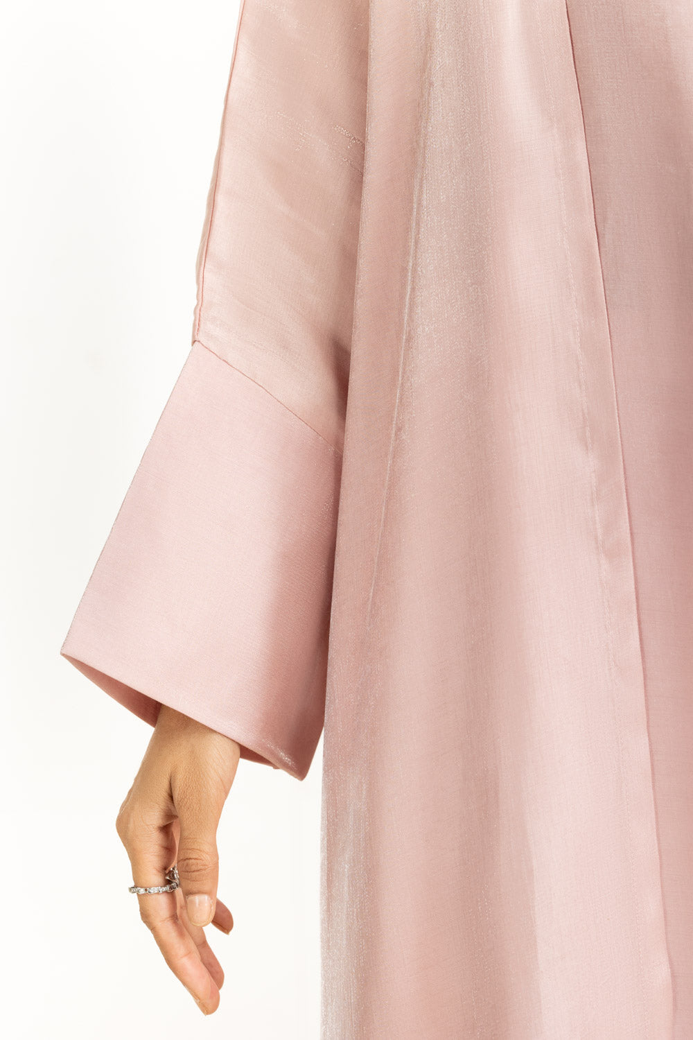 Soft peach tone with a hint of shimmer define this elegant three-piece Abaya set. The fluid outer layer in shimmer georgette drapes beautifully over an embellished inner, creating subtle festive flair. Finished with a matching scarf, it balances ease and refinement for winter gatherings.