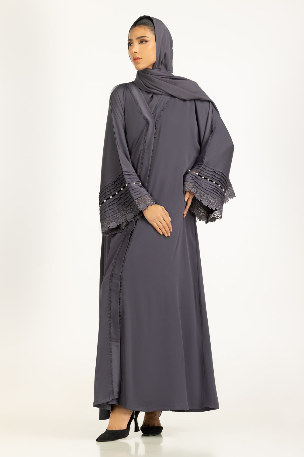 A graceful Abaya in grey, tailored in viscose georgette that drapes with fluid ease, offering modest coverage and winter comfort. The delicate embroidery along the front and sleeves adds quiet sophistication. Paired with a matching scarf, it’s a timeless ensemble perfect for day-to-evening wear.