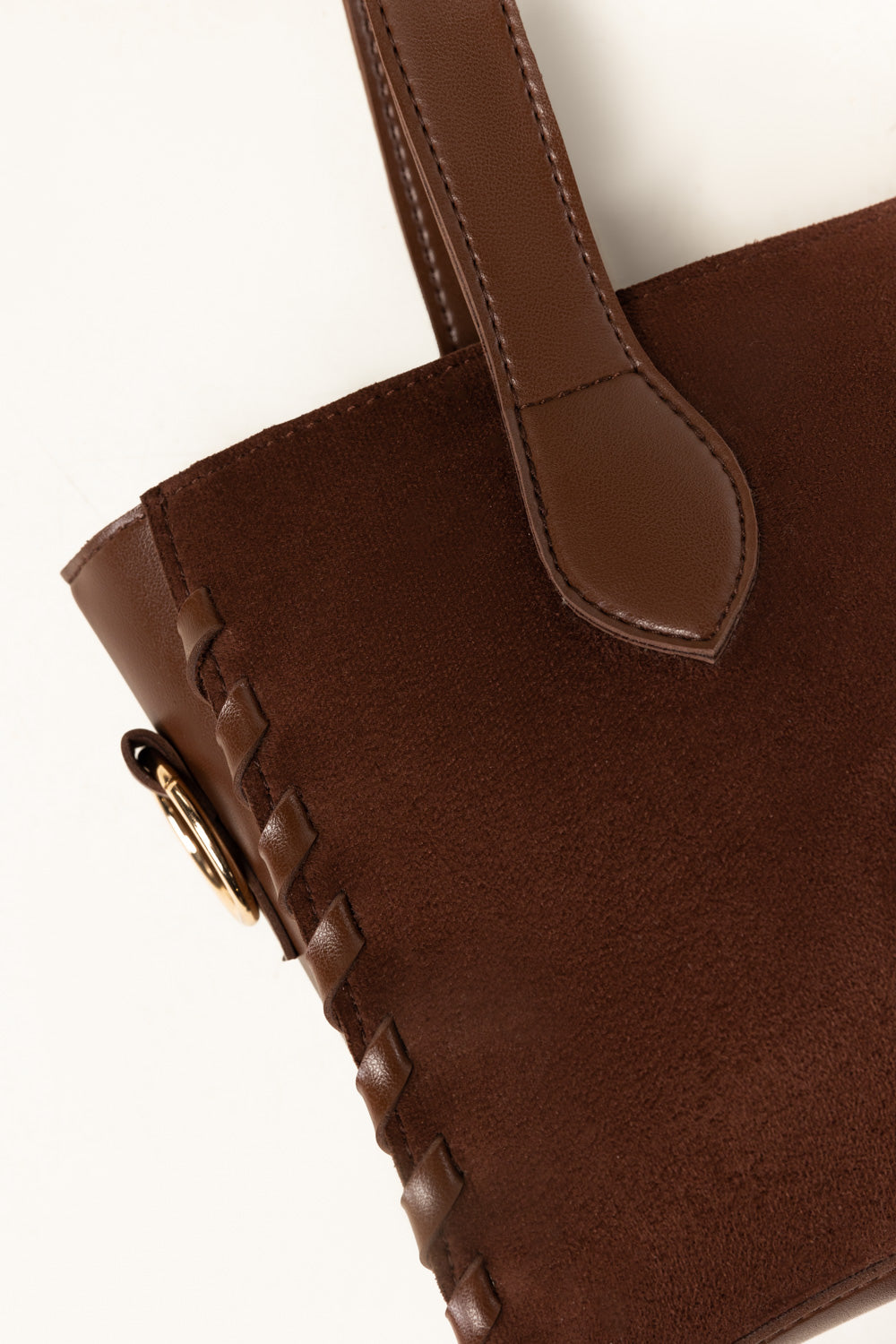 This bag features a soft faux suede body with smooth faux leather handles for a polished look. Decorative side whipstitch adds a handcrafted detail, complemented by durable metal ring hardware. Its structured design makes it ideal for everyday essentials.