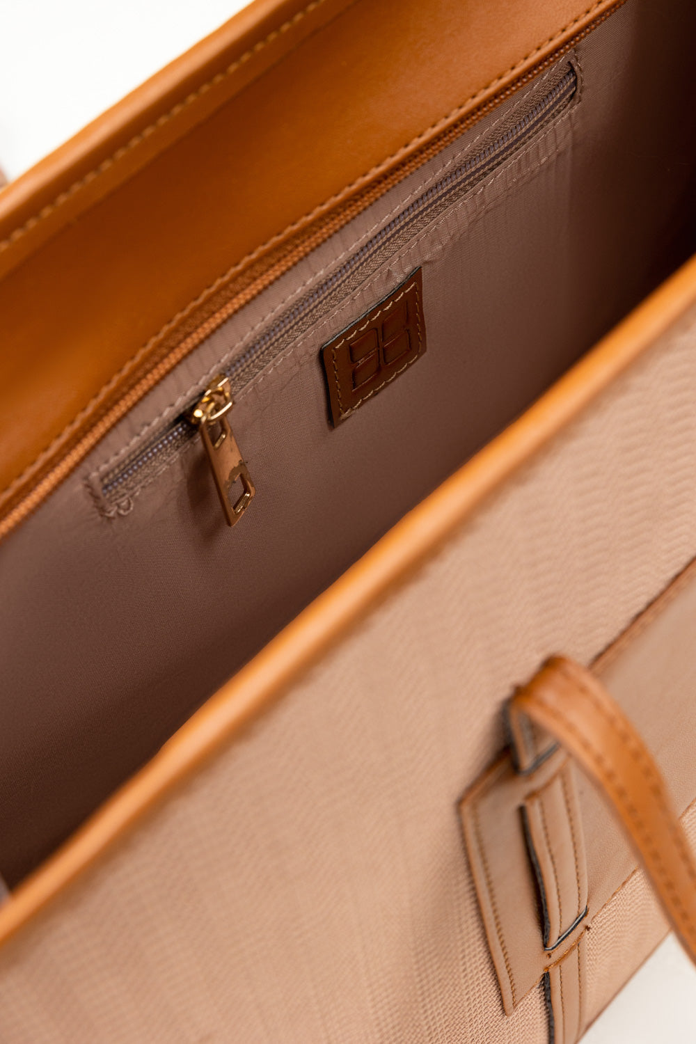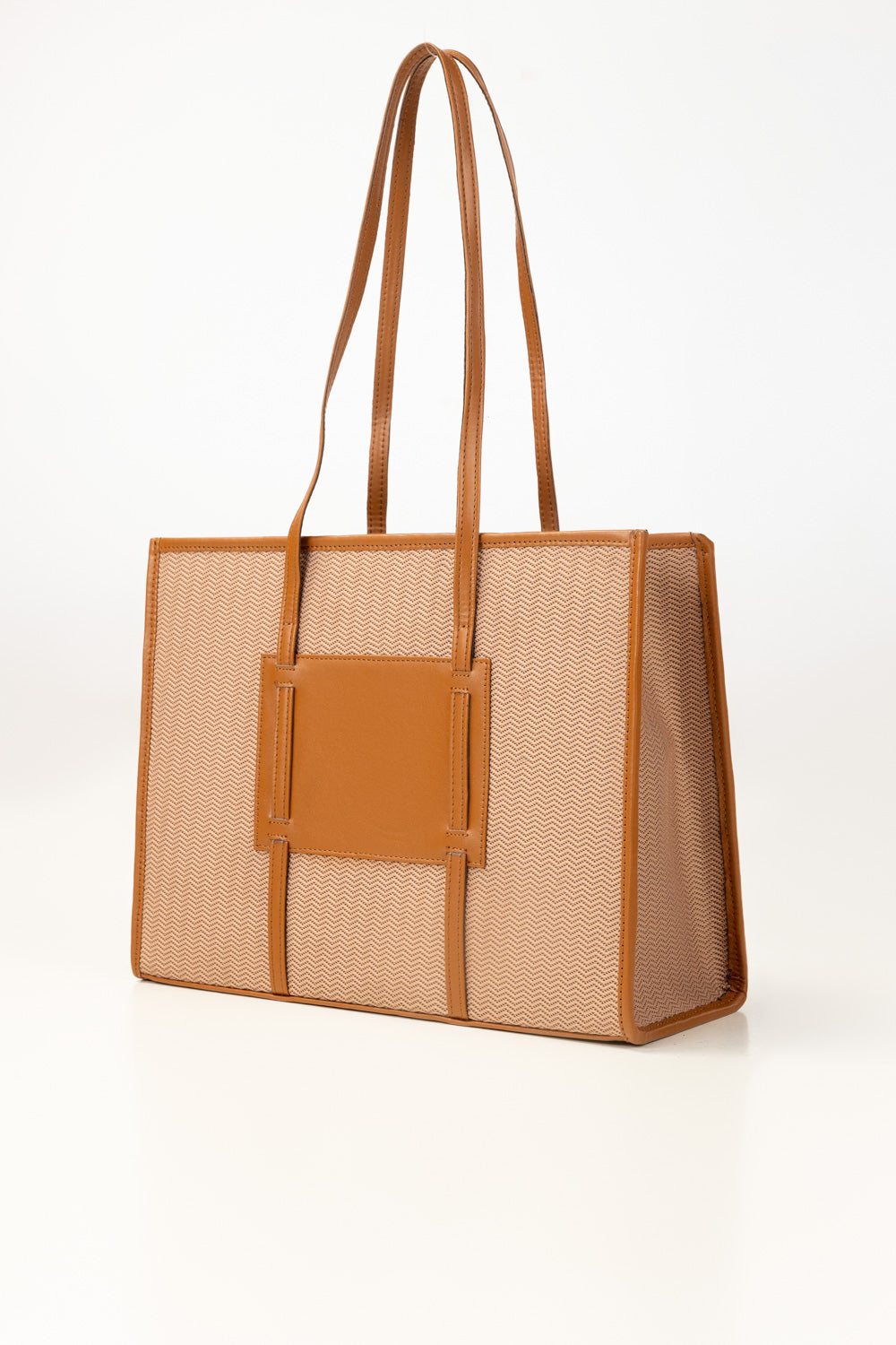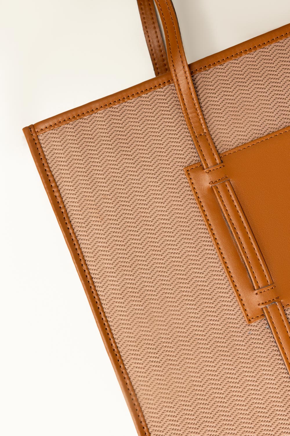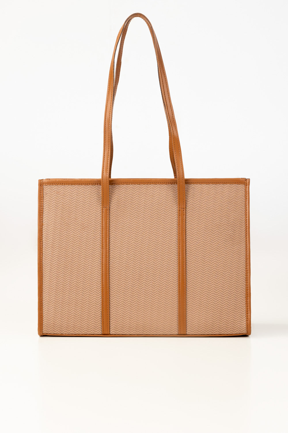 This stylish tote bag features a chic woven texture with sleek faux leather accents. Its spacious design and durable leather handles offer both functionality and comfort. A versatile accessory, perfect for both work and casual outings.