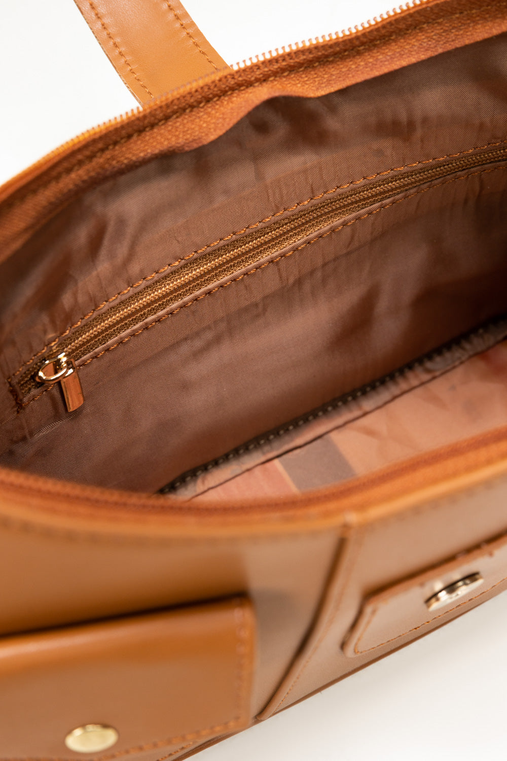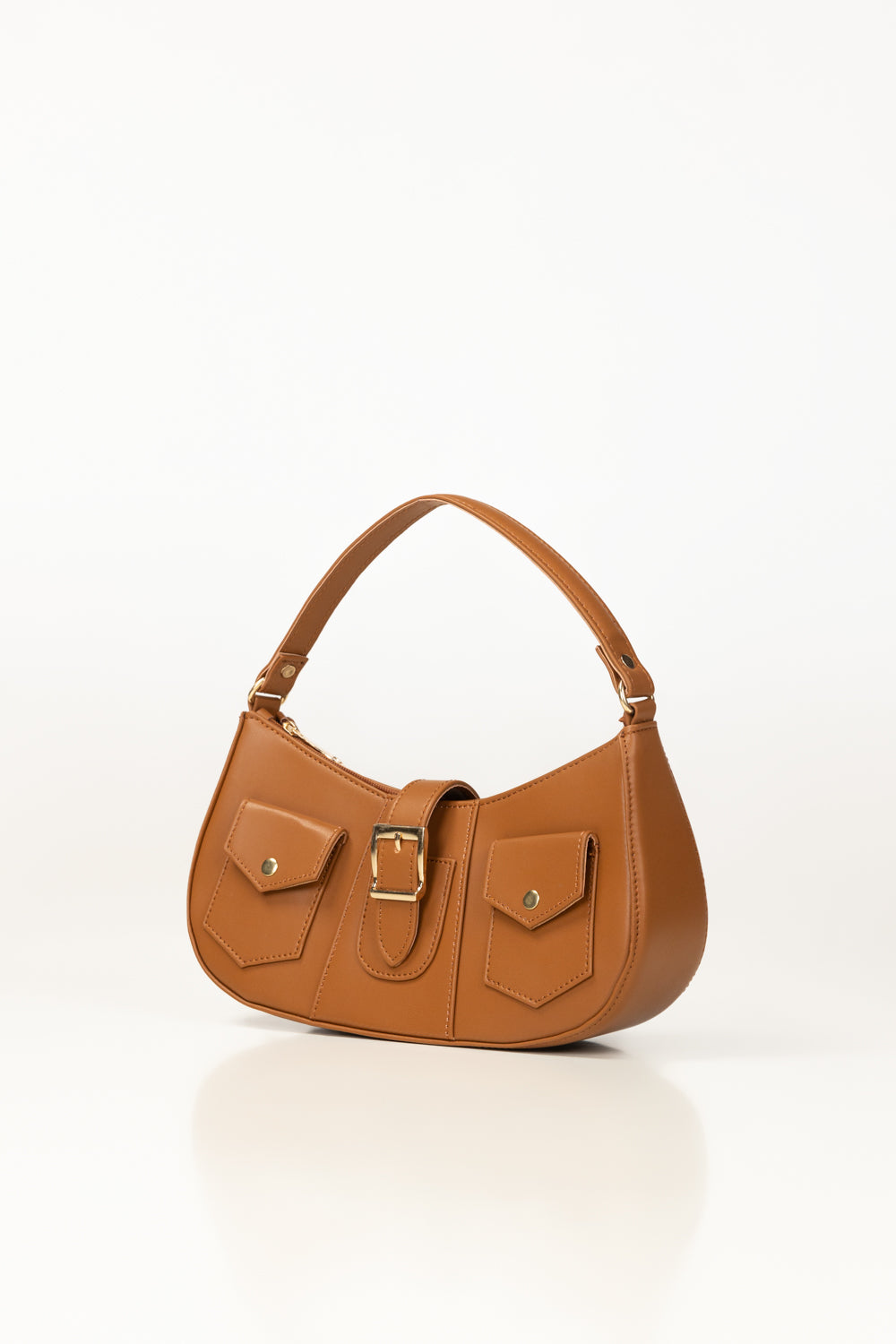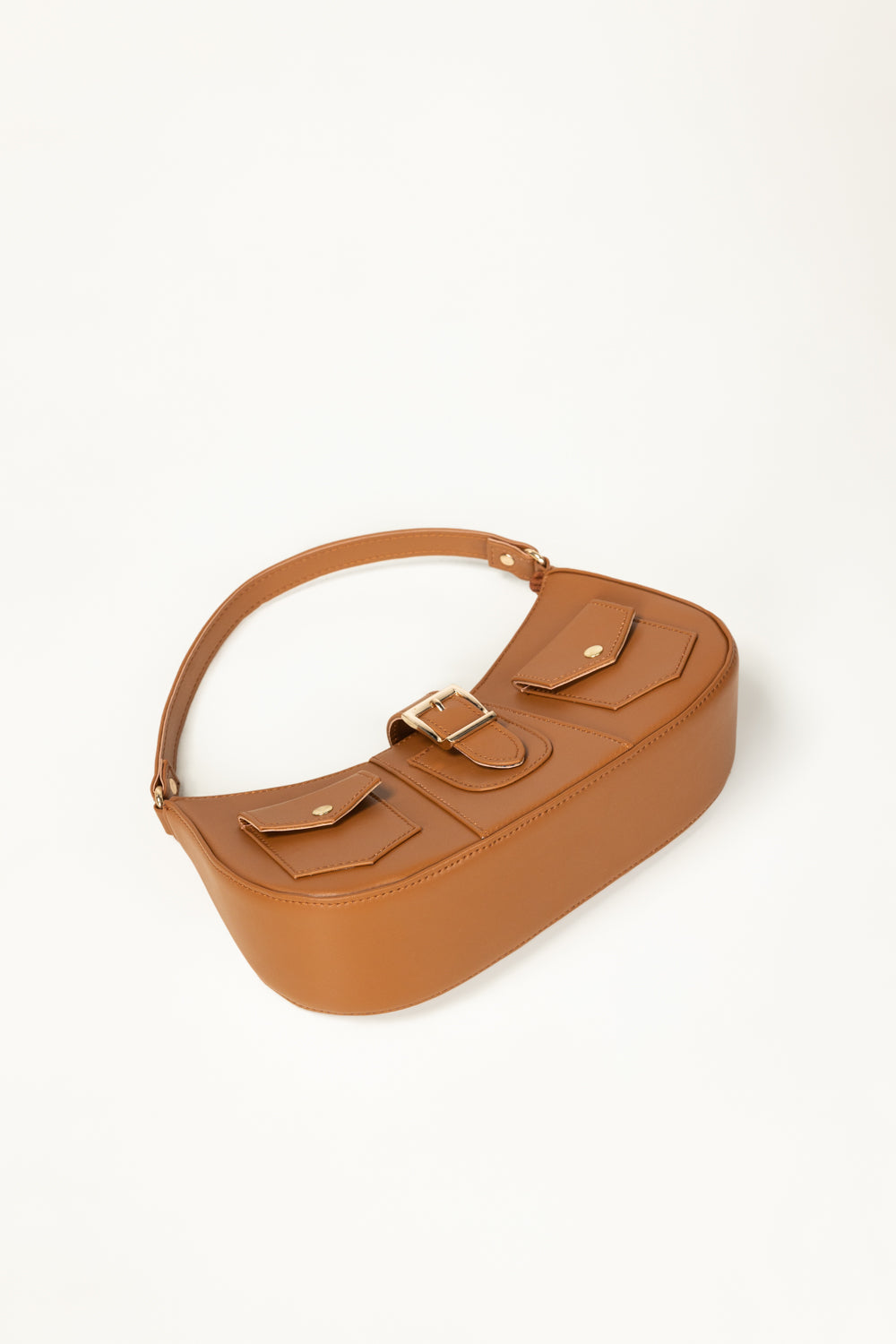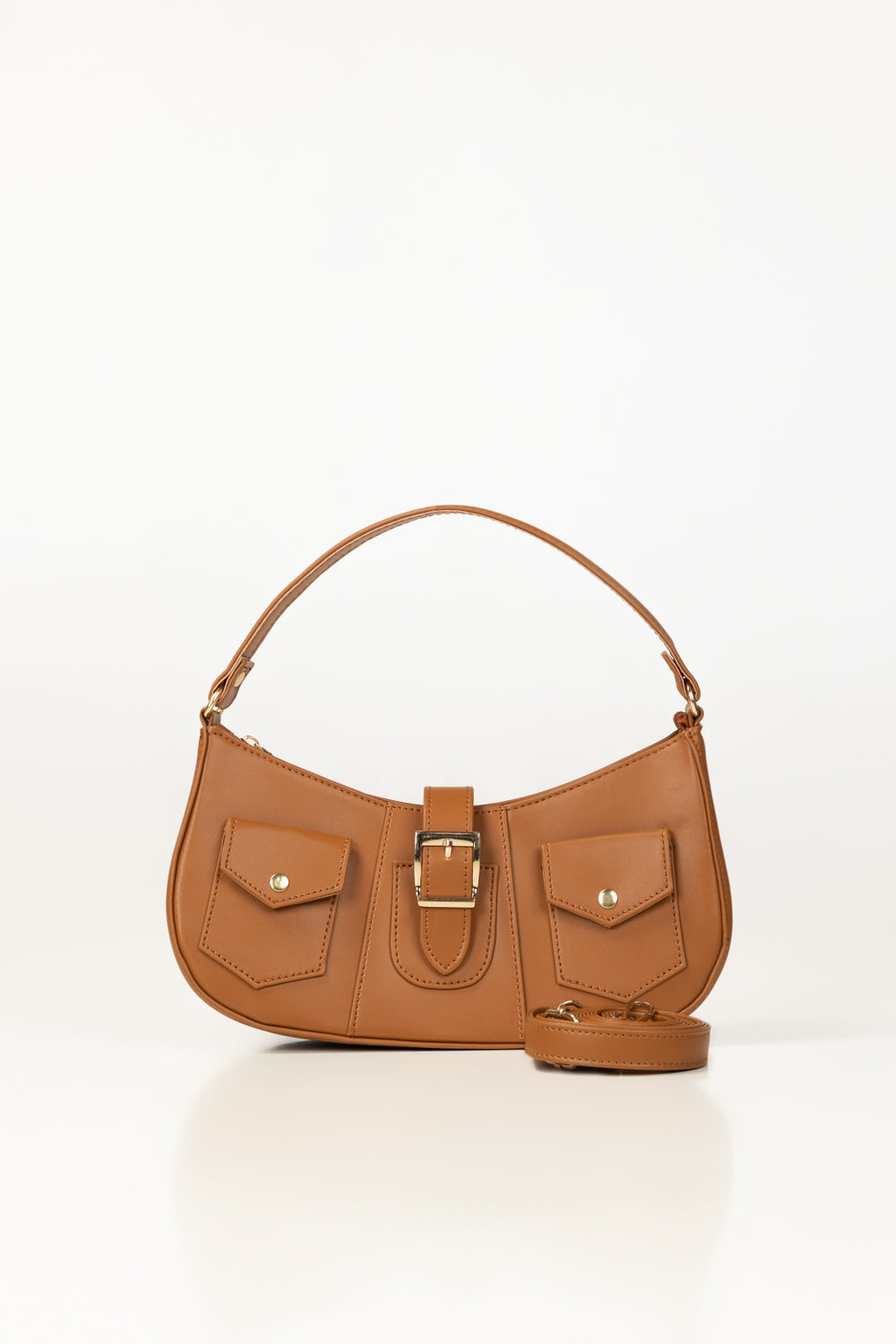 Chic tan faux leather hand bag with a curved silhouette and vintage-inspired buckle detail. Features two front flap pockets, a top handle, and a detachable long strap for versatile styling. Compact yet functional—perfect for everyday use with a stylish twist.