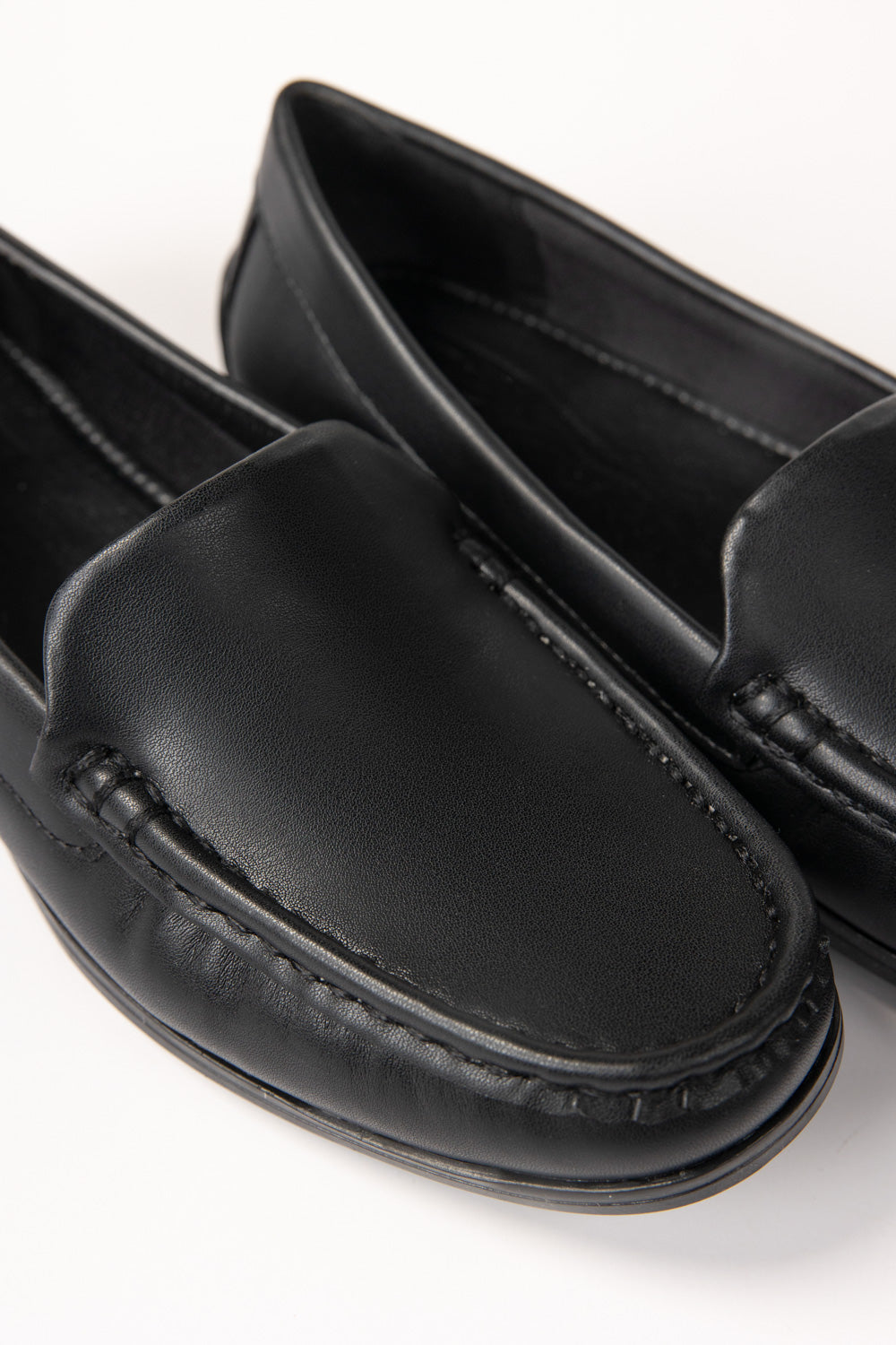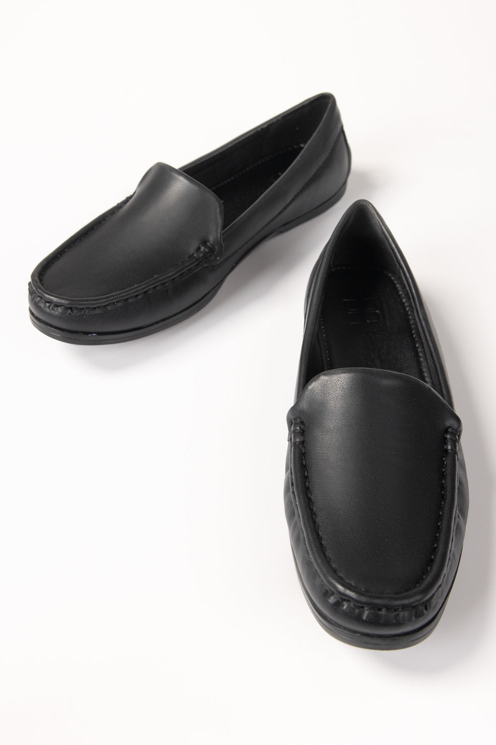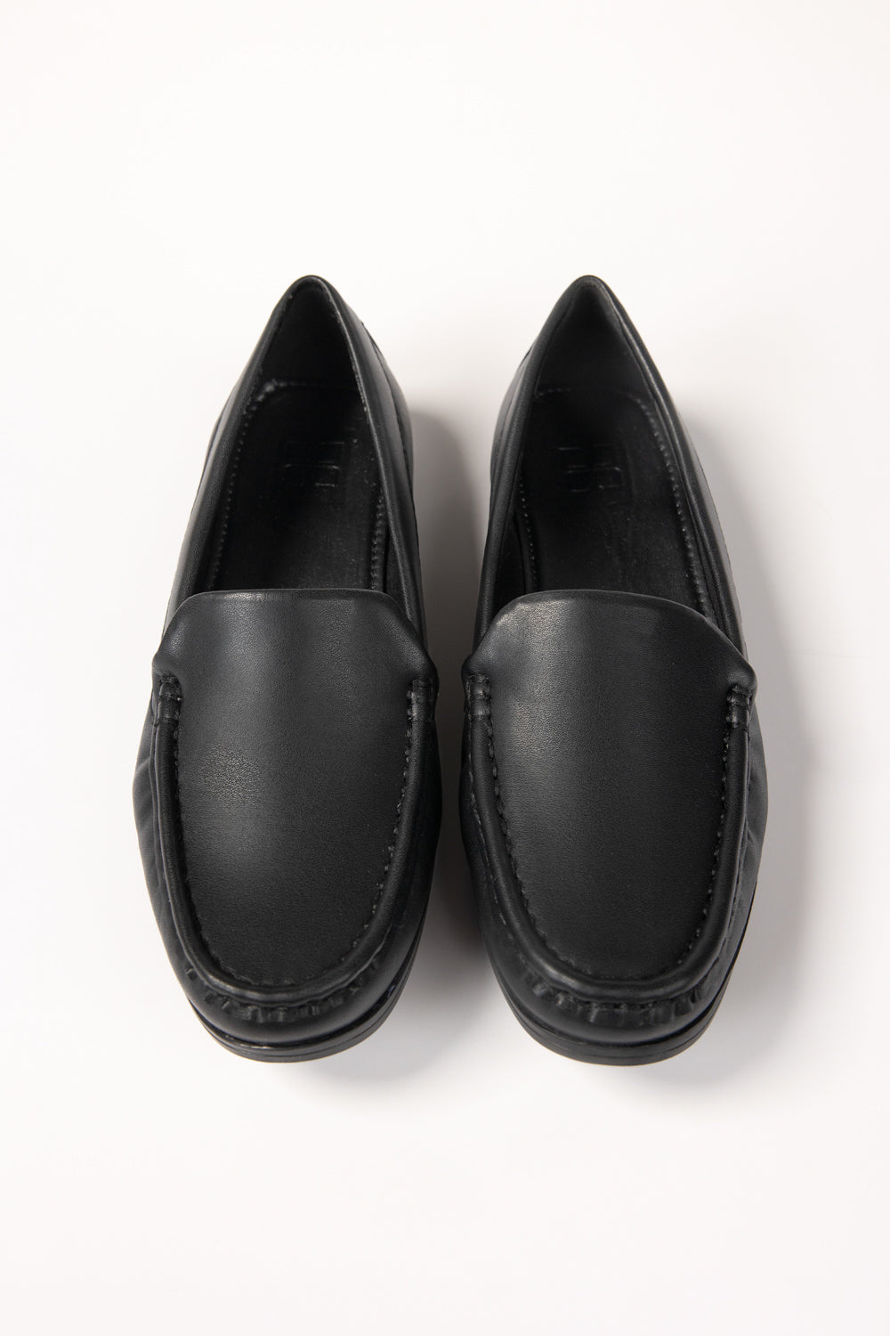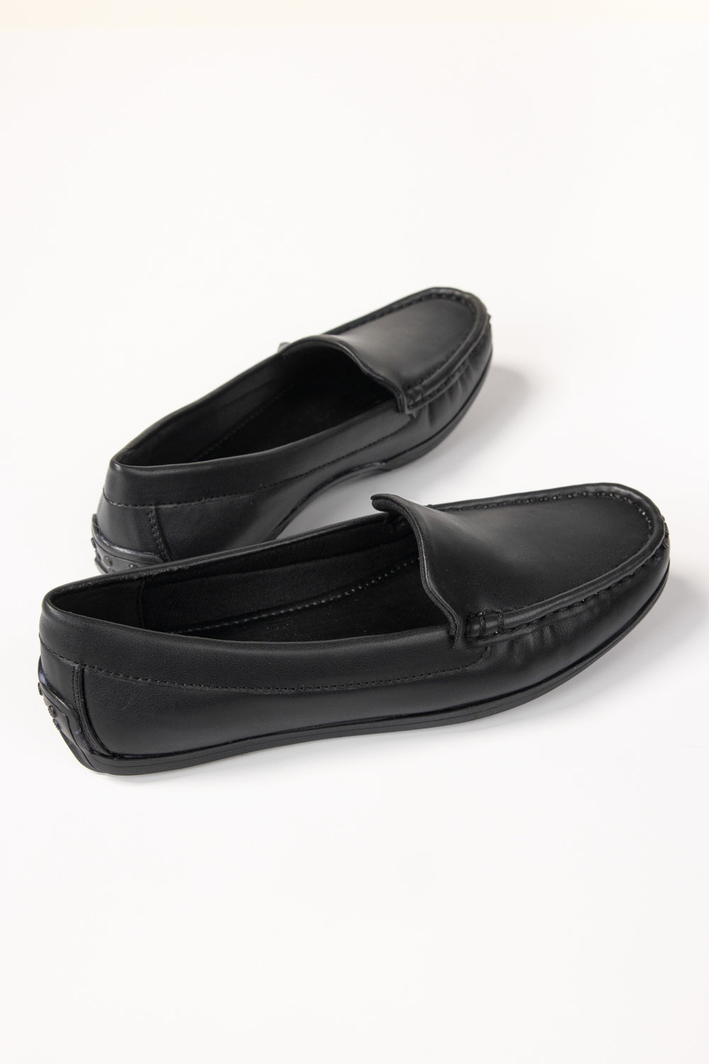 Classic black loafers crafted from smooth faux leather with moccasin-style stitching. Slip-on design with cushioned insoles for all-day comfort and flexible rubber soles. Versatile and stylish—perfect for work, travel, or everyday wear.