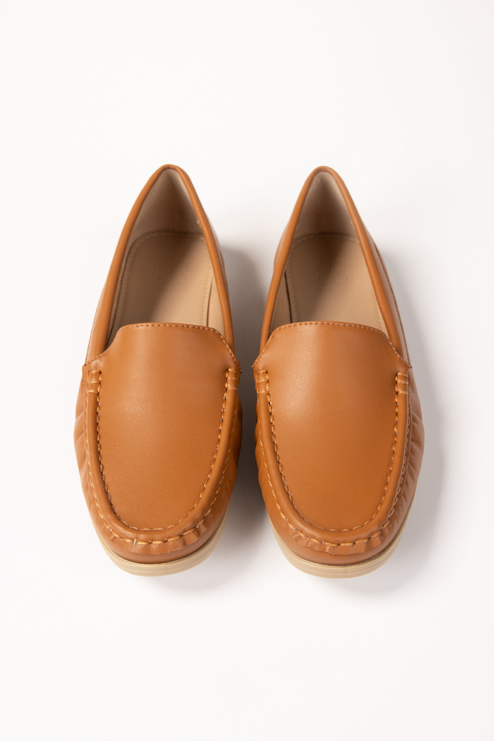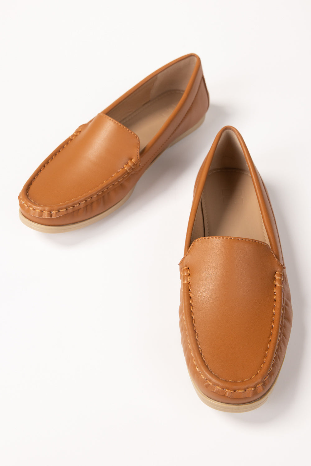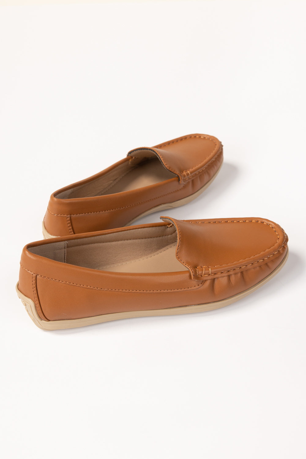 Classic tan loafers crafted from smooth faux leather with moccasin-style stitching. Slip-on design with cushioned insoles for all-day comfort and flexible rubber soles. Versatile and stylish—perfect for work, travel, or everyday wear.