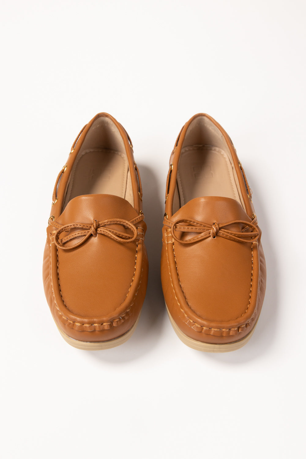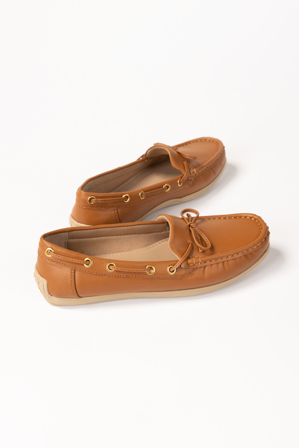 These tan moccasin-style loafers feature a clean, minimalist design with a gold-tone eyelet detail and fine stitching. Crafted from smooth faux leather, they offer both elegance and comfort. The flexible rubber sole ensures durability and provides optimal support for all-day wear.