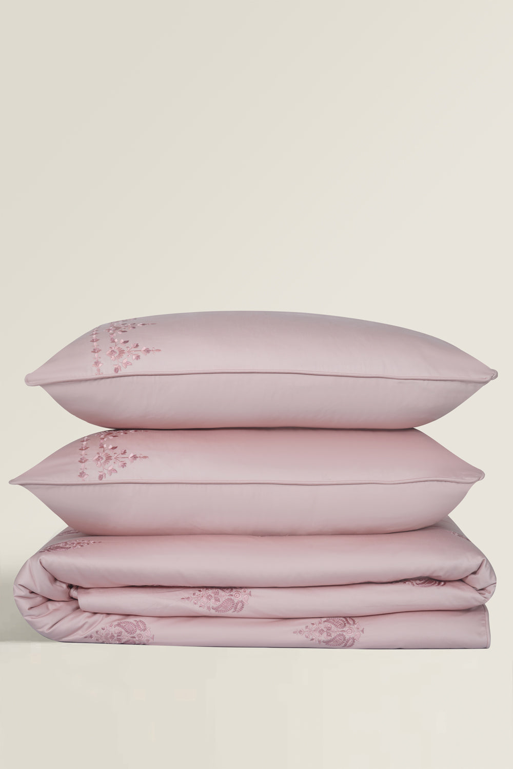 Indulgently soft, sateen weave bedding feels almost heavenly with 100% cotton. Our signature embroidered duvet cover set, offers a classic aesthetic appeal to match any style of décor. Available in luxurious colors and extravagantly soft and comfortable embroidered series.