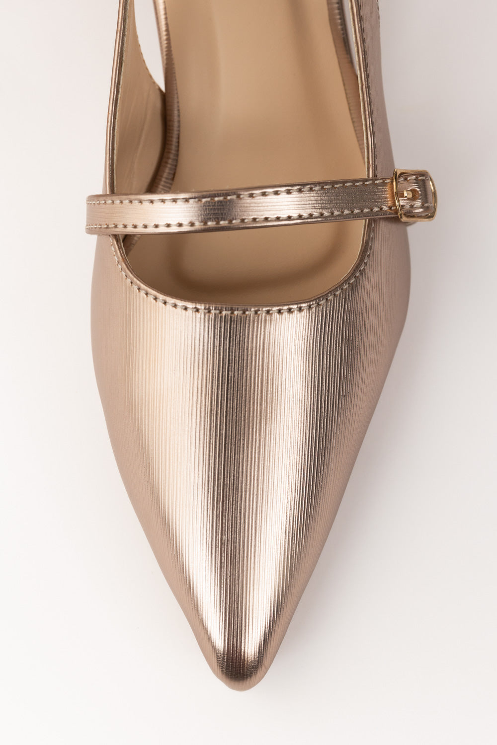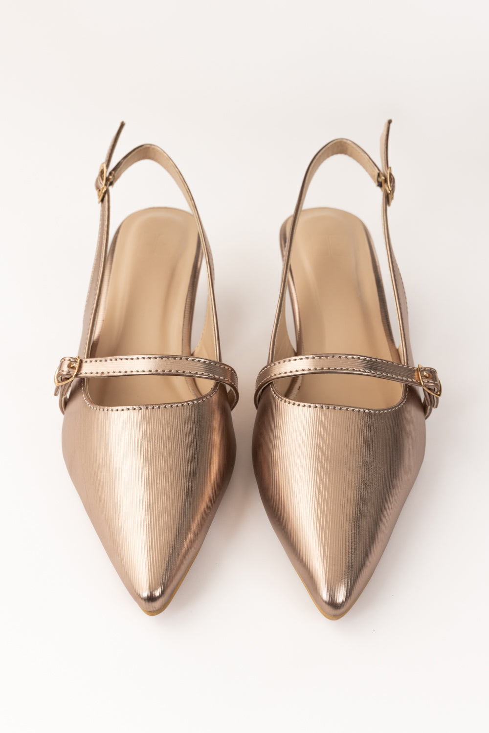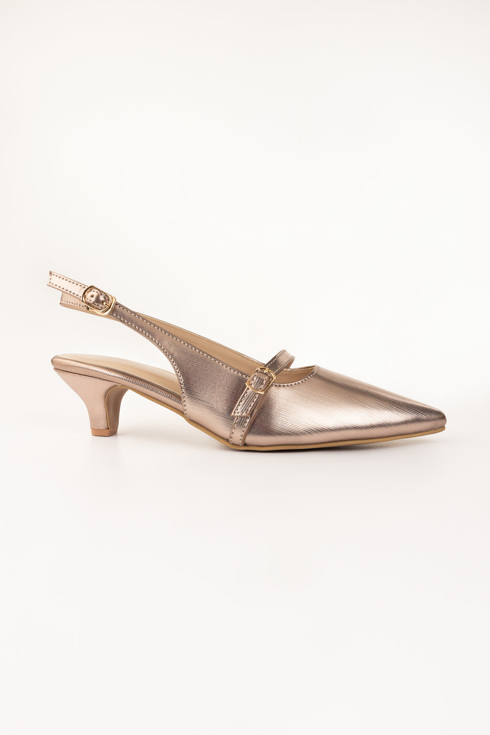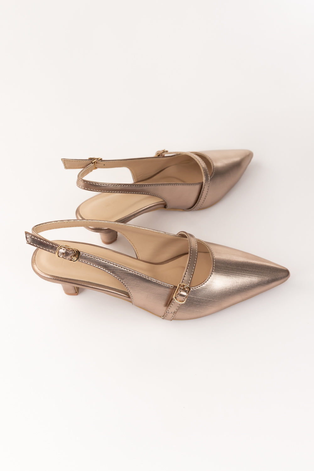 Elevate your formal ensemble with these elegant rose gold slingback heels. Featuring a sleek pointed toe, subtle kitten heel, and a stylish front strap with buckle detail for a secure fit. Perfect for evening events, office wear, or upscale gatherings.