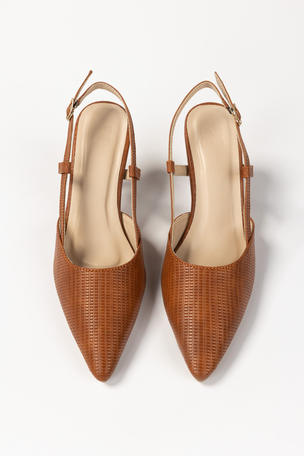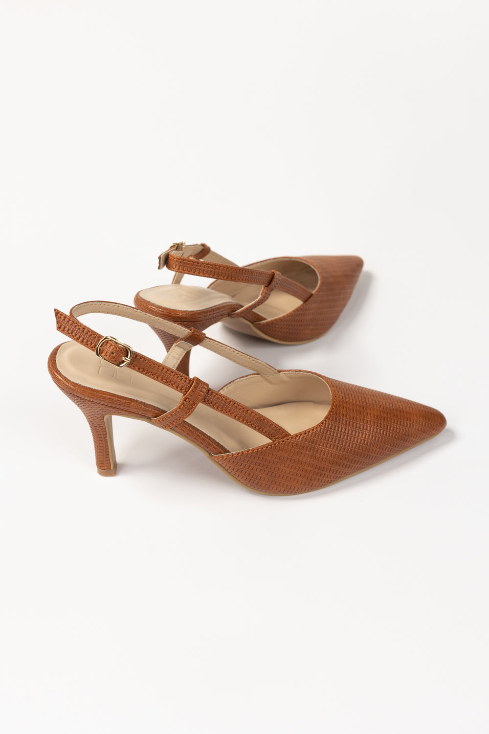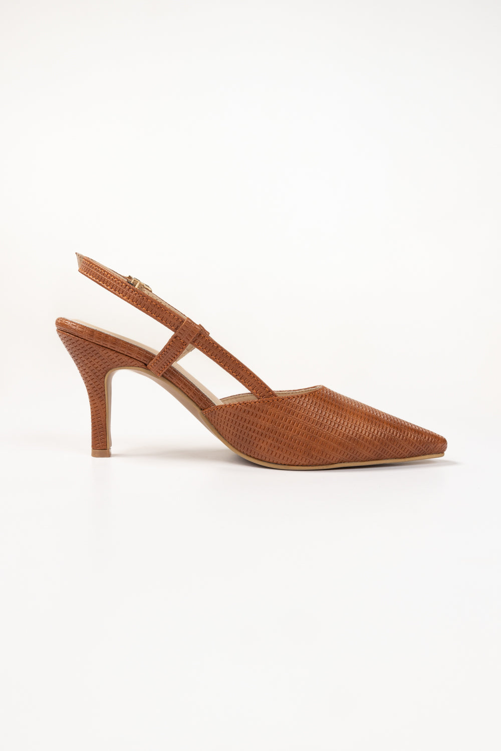 Step into timeless elegance with these textured tan slingback heels. Featuring a pointed toe and a sleek mid heel, theyre perfect for office days or evening outings. The adjustable ankle strap ensures a secure and stylish fit.