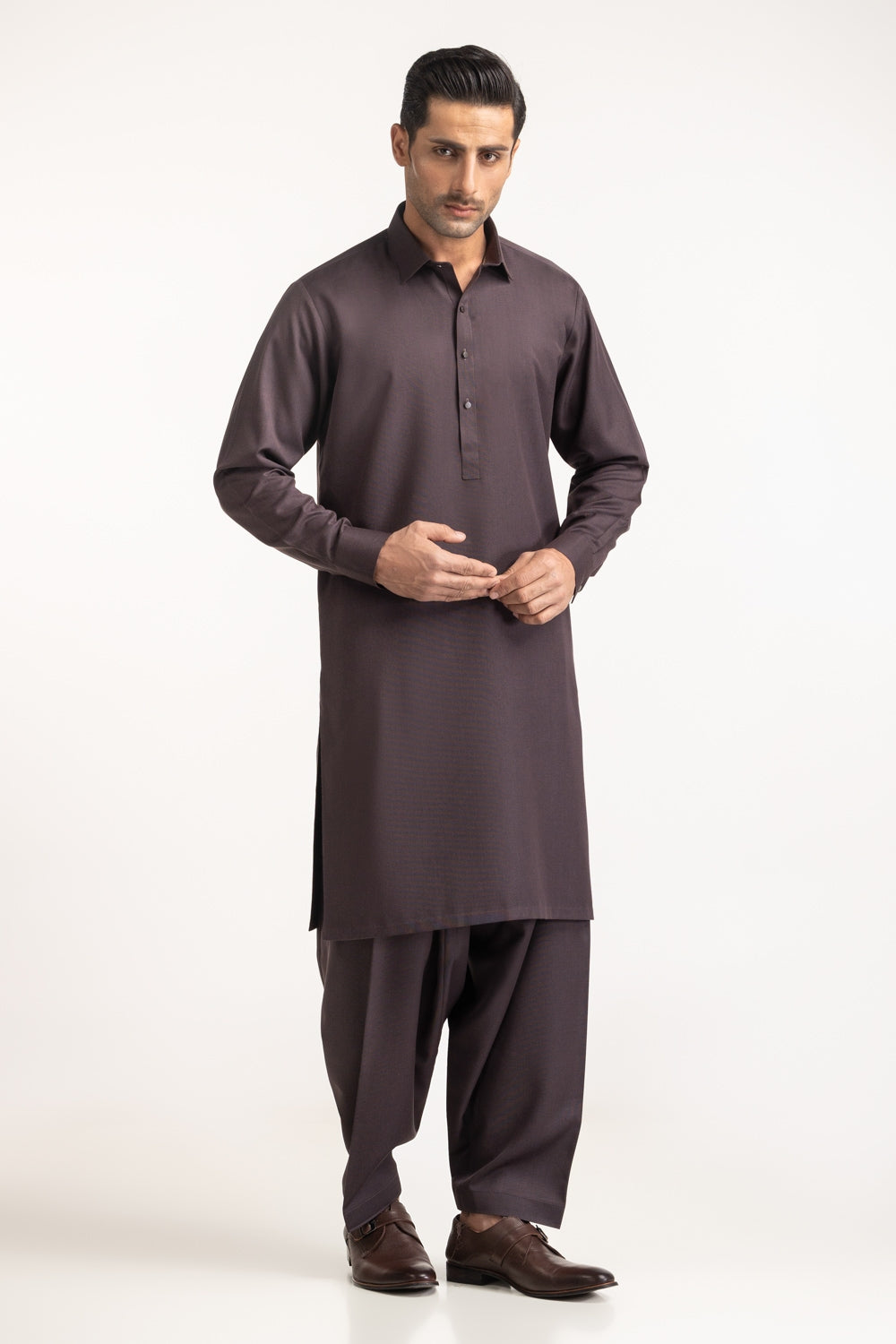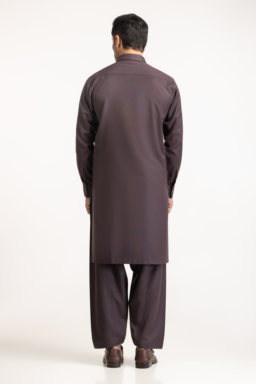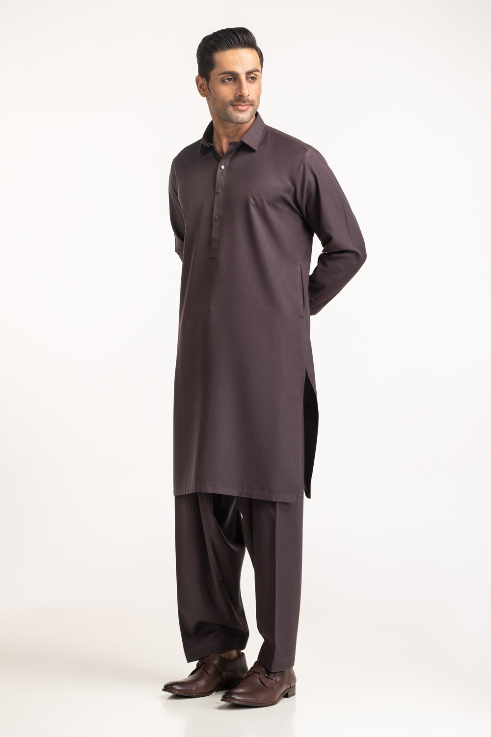 Crafted with simplicity and elegance, this three-piece Taupe Blended Fabric Formal Kameez Shalwar, paired with a waistcoat, exudes sophistication