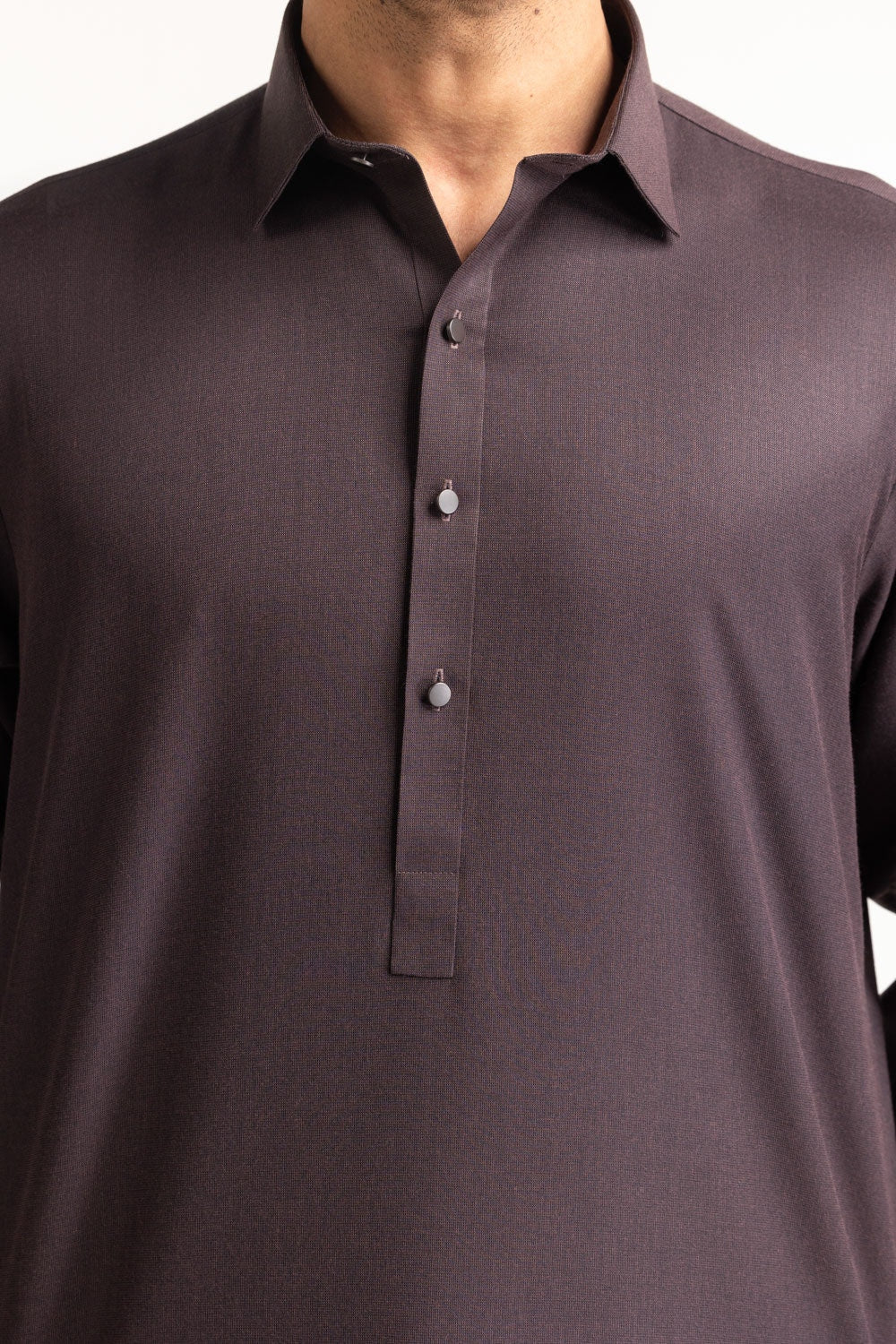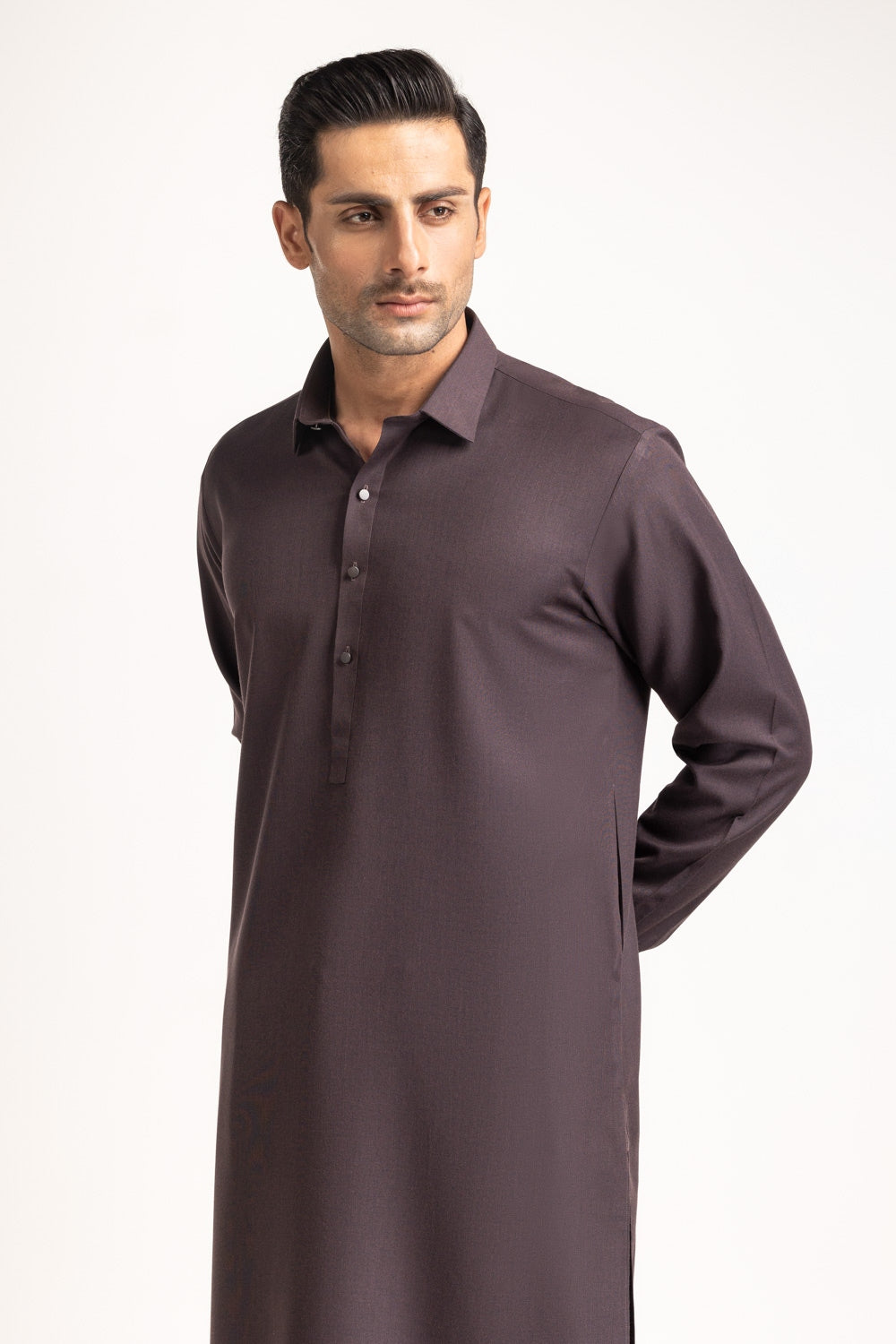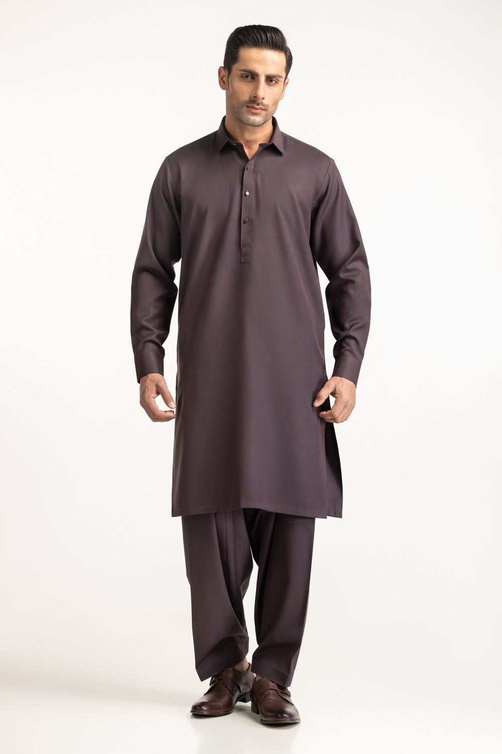 Crafted with simplicity and elegance, this three-piece Taupe Blended Fabric Formal Kameez Shalwar, paired with a waistcoat, exudes sophistication