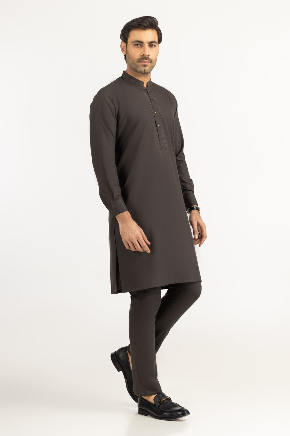 Crafted with simplicity and elegance, this three-piece Taupe Blended Fabric Formal Kameez Shalwar, paired with a waistcoat, exudes sophistication