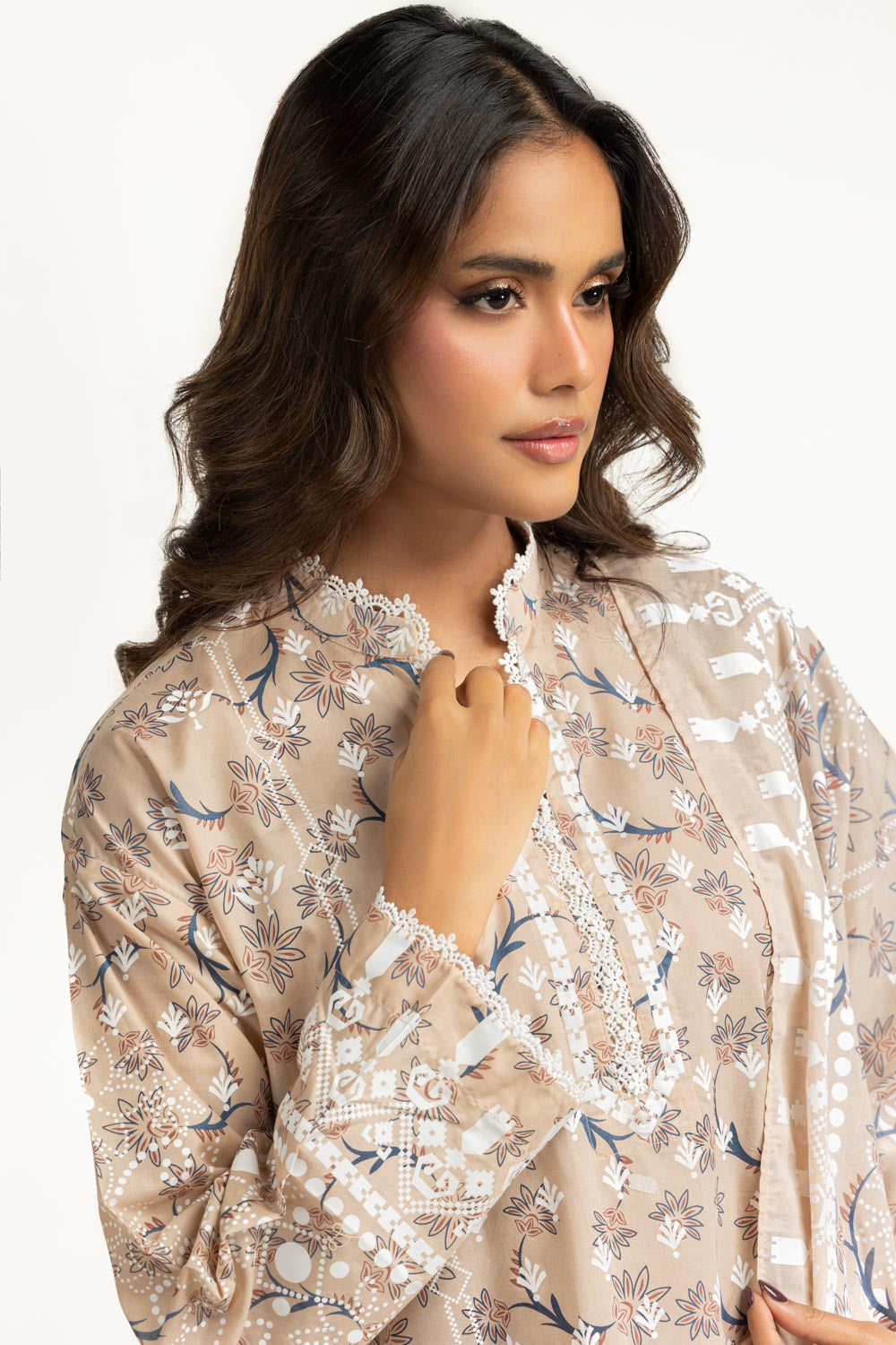 Gentle peach hues combined with contemporary lacquer prints give this lawn suit a soft yet modern presence. The airy fabric and relaxed cut support comfort throughout long summer days. Finished with a plain dyed trouser, it offers an easy-to-wear feel for casual meetups.