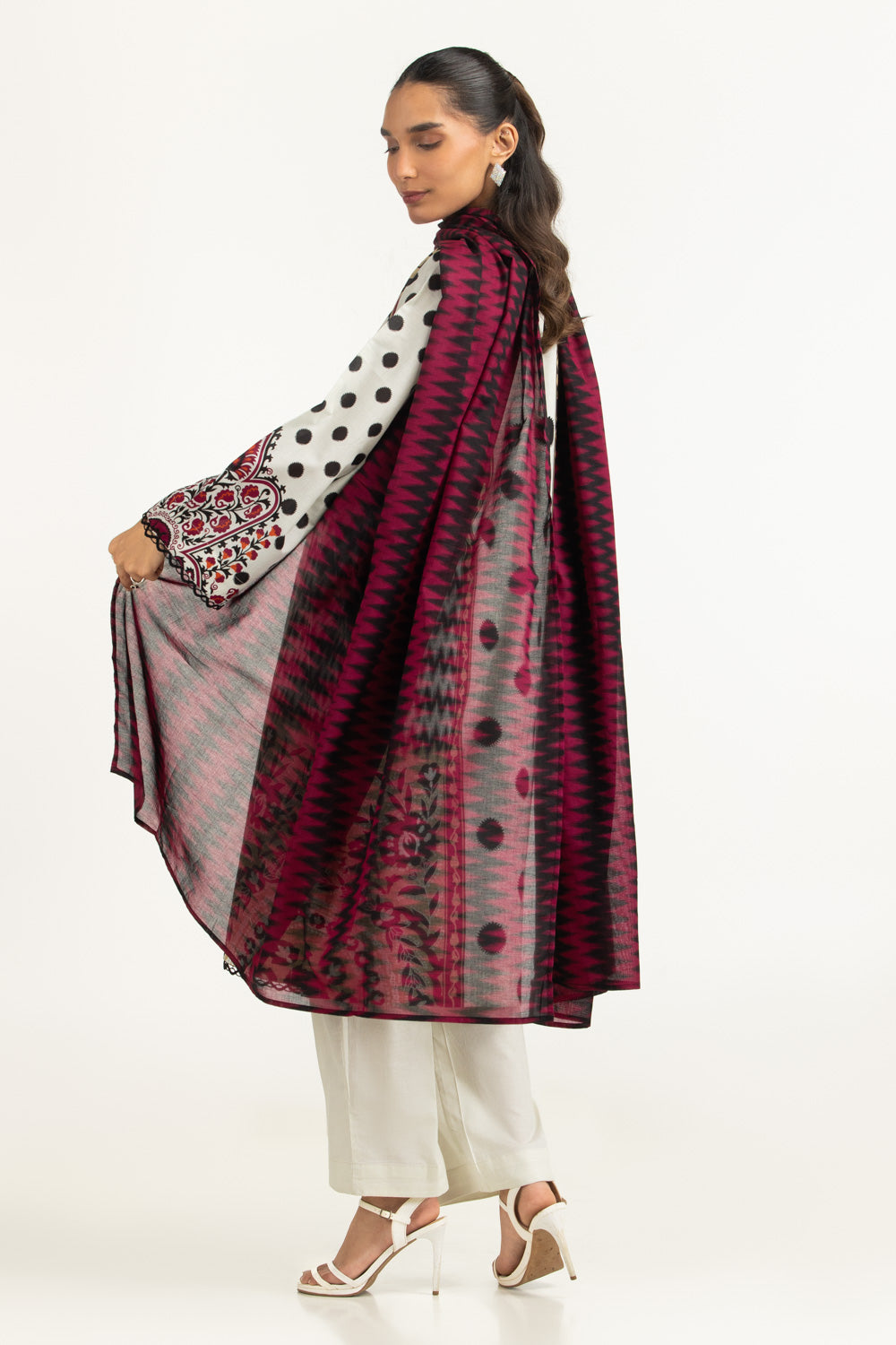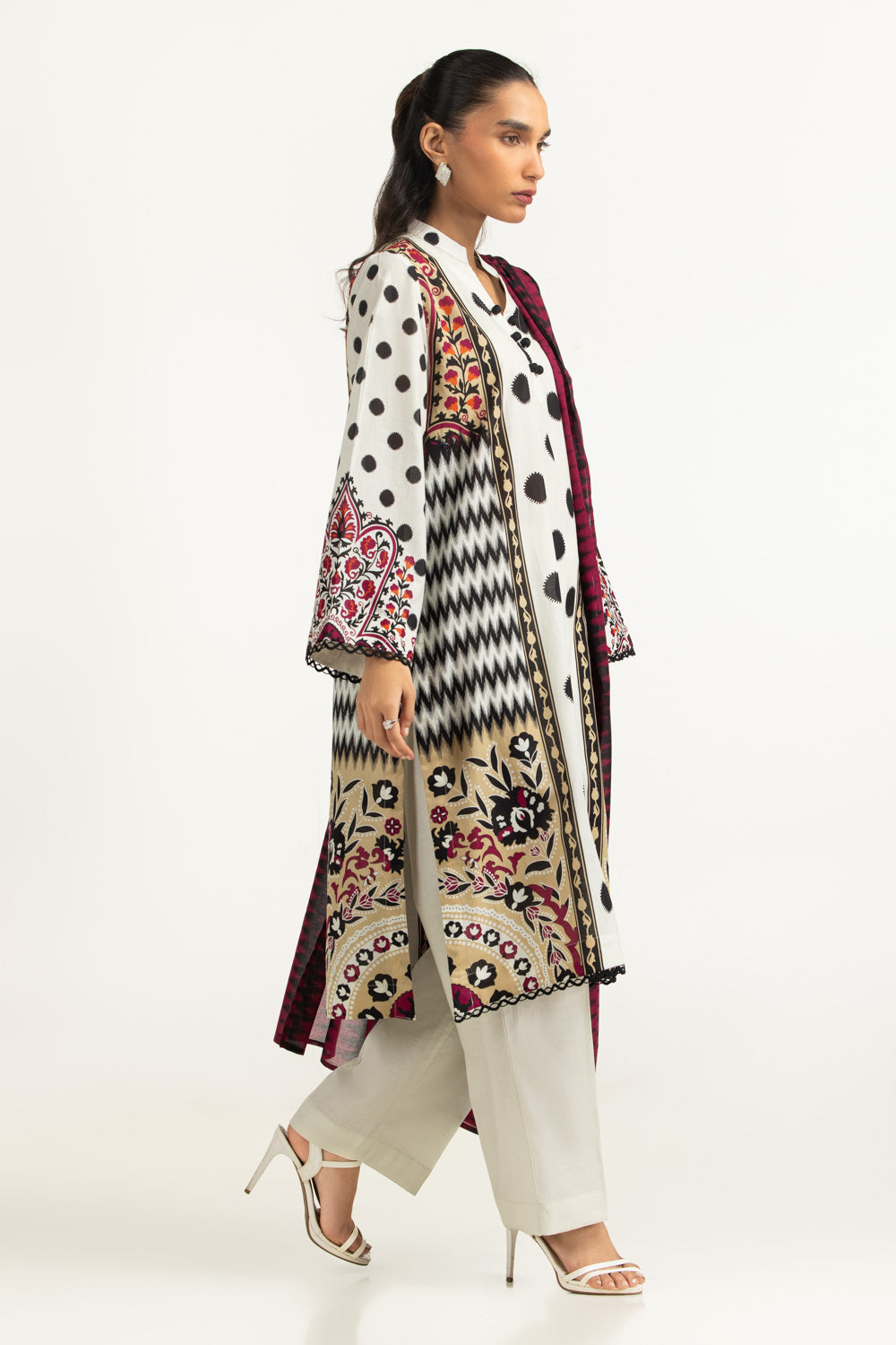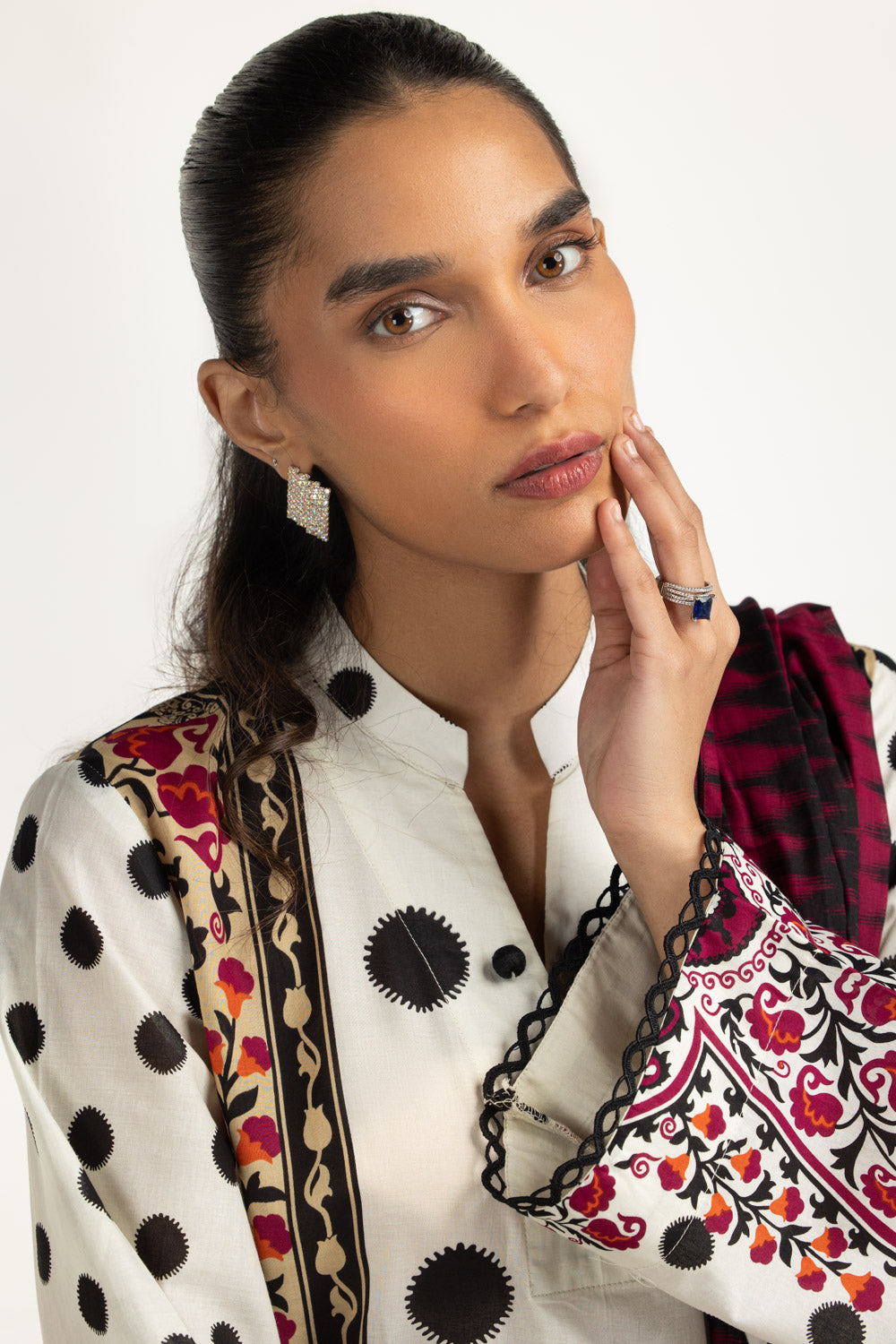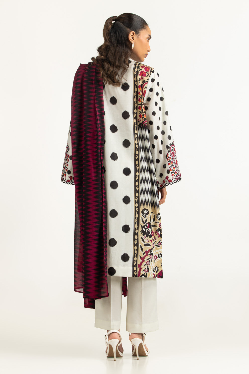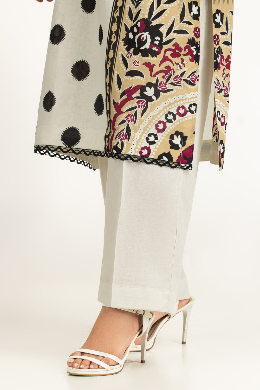 Lightweight lawn makes this off-white suit perfect for summer wear. While the contemporary print adds gentle detail, maintaining a clean appearance. Finished with a plain white trouser, it remains practical for casual gatherings.