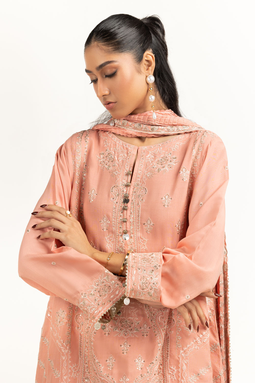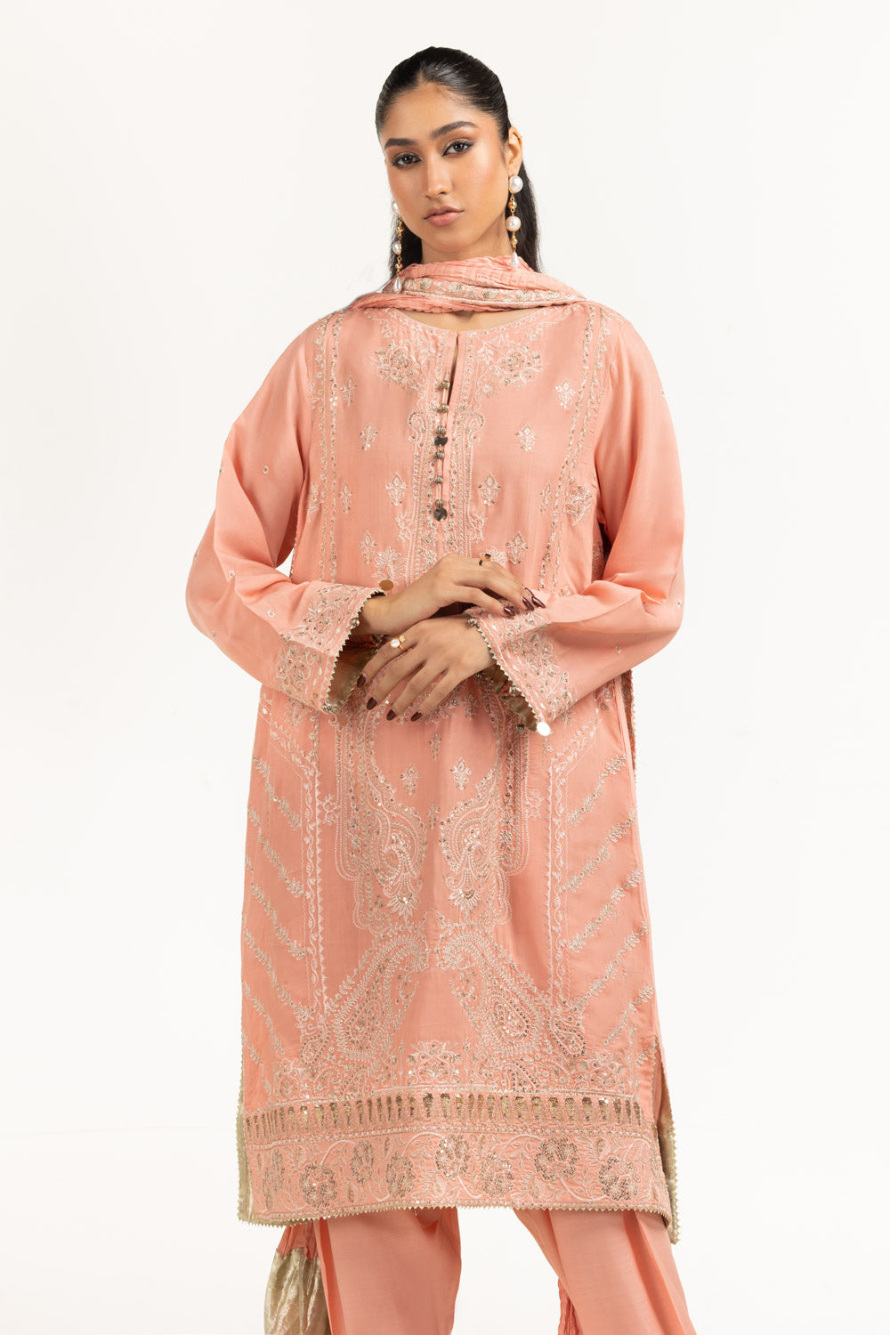 Details: Embroidered suit featuring a round split-neckline with delicate embellishment and gota lace.