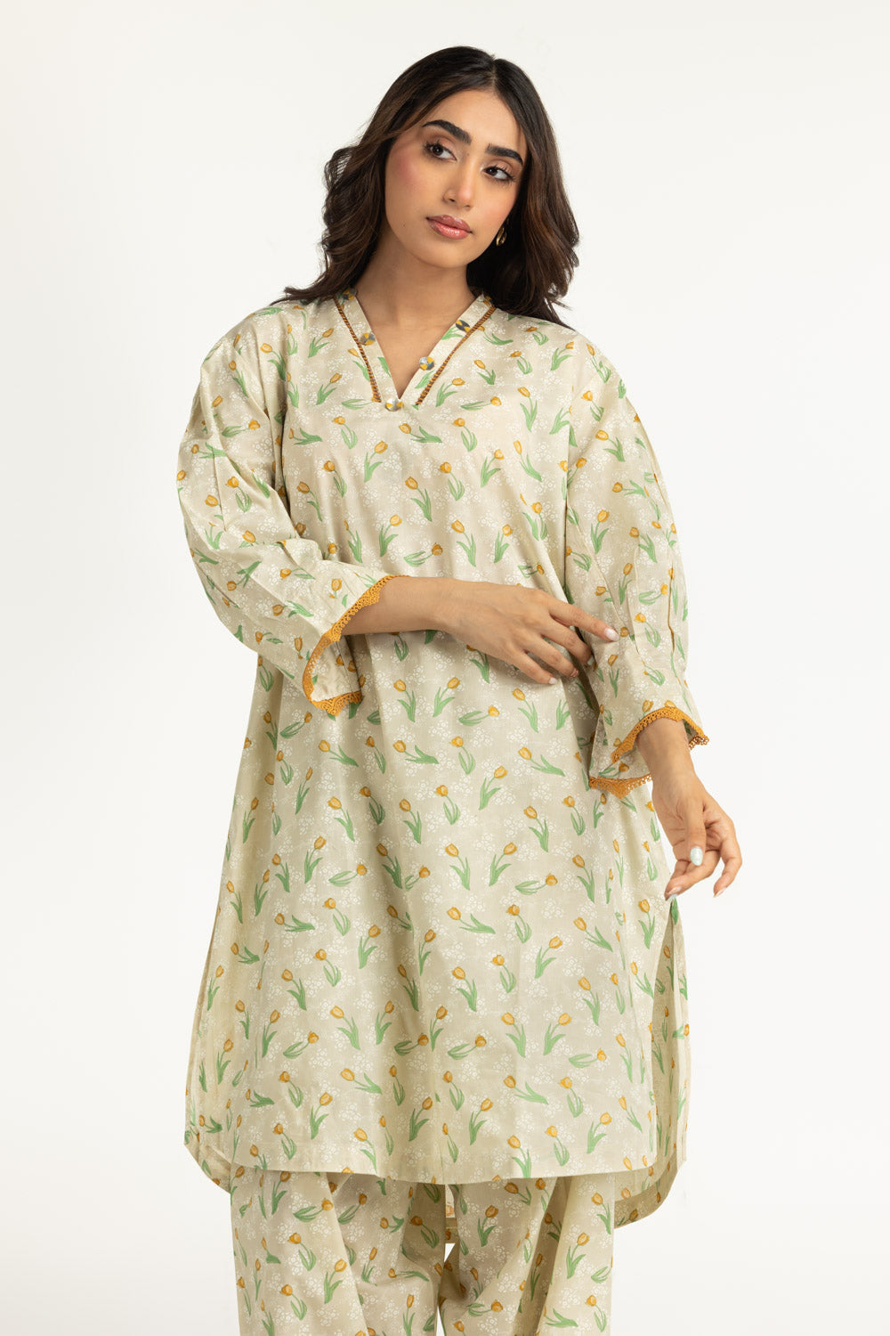 This floral printed co-ord set offers a coordinated summer look with a soft, breathable feel. The loose fit allows ease of movement while keeping the outfit light during warm hours. Suitable for casual wear and relaxed days out.