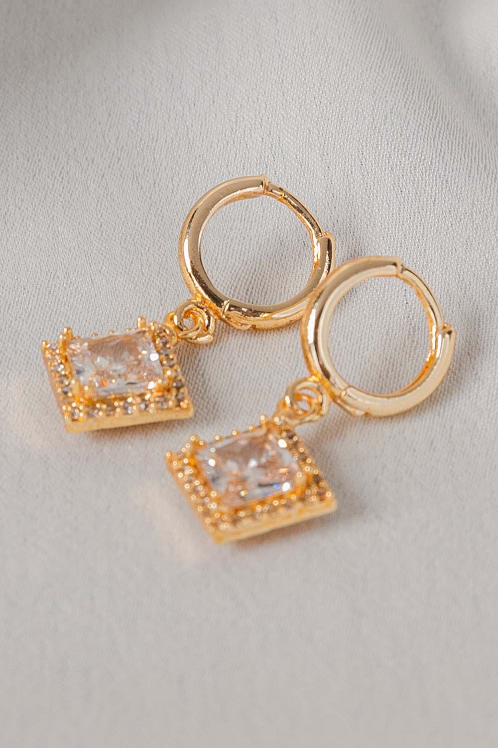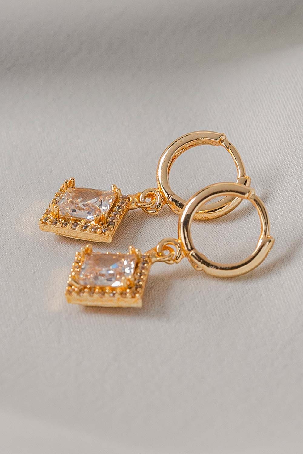 These radiant gold earrings, featuring an English-lock closure, are accentuated with a diamond-shaped embellishment at the end, offering a sophisticated sparkle that complements any look.