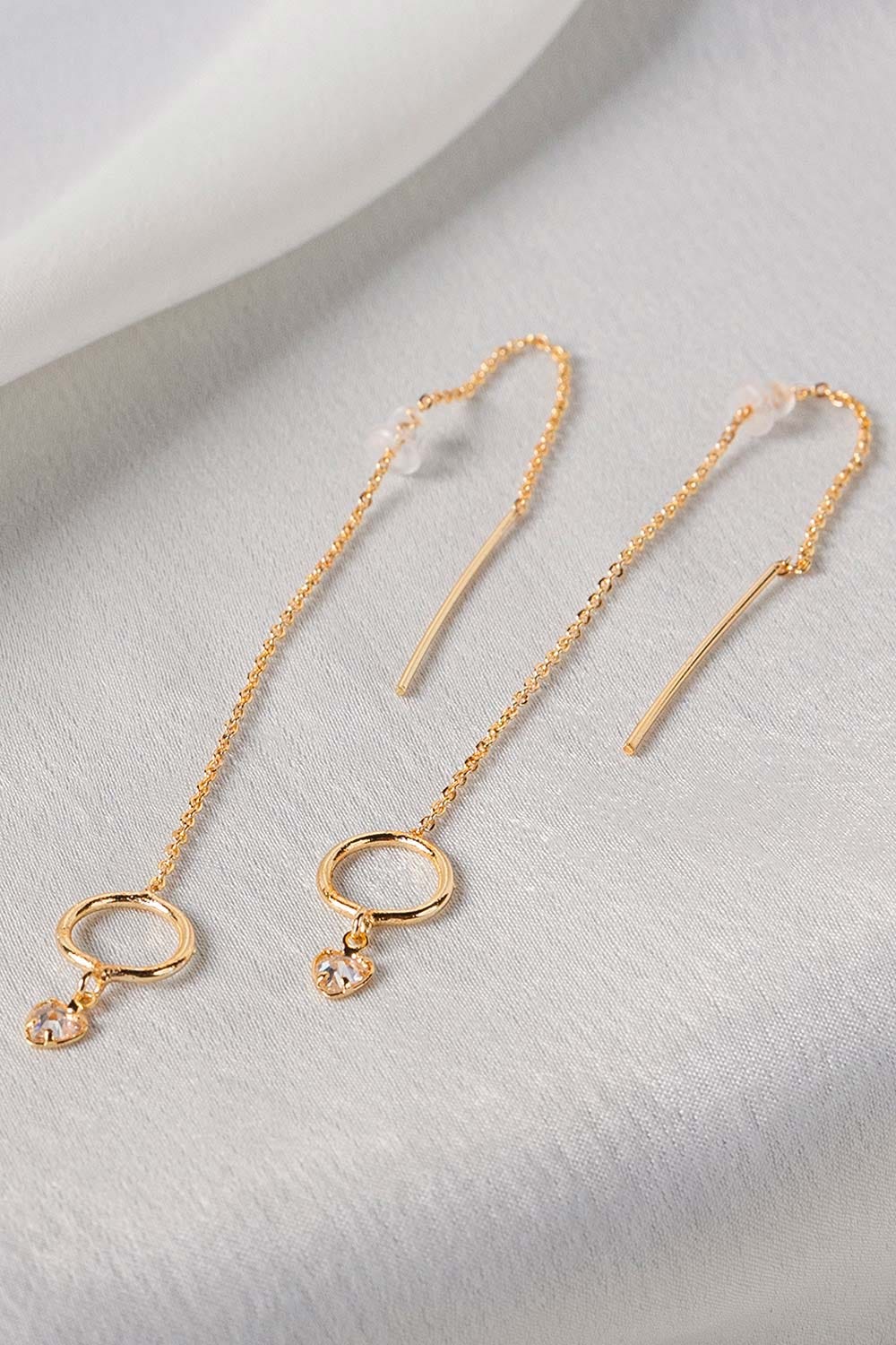 A minimal pair of metallic Gold Threader Earrings with embellishment. Perfect for those who appreciate elegance with a modern twist, these Threader Earrings are sure to add a touch of sophistication to your jewelry collection.