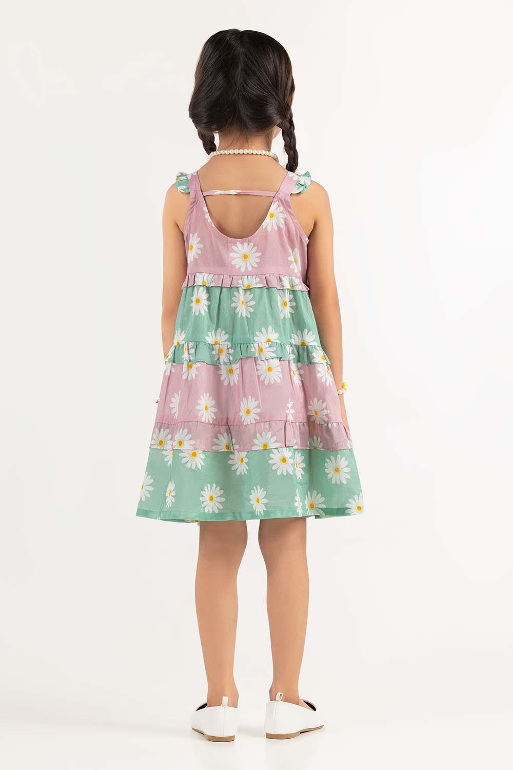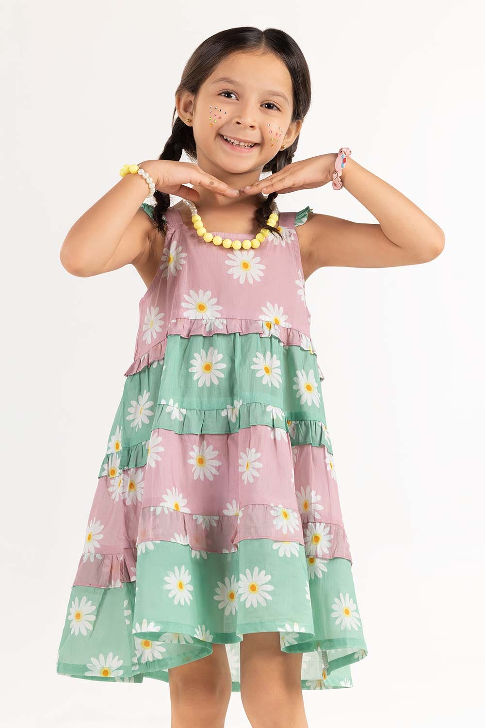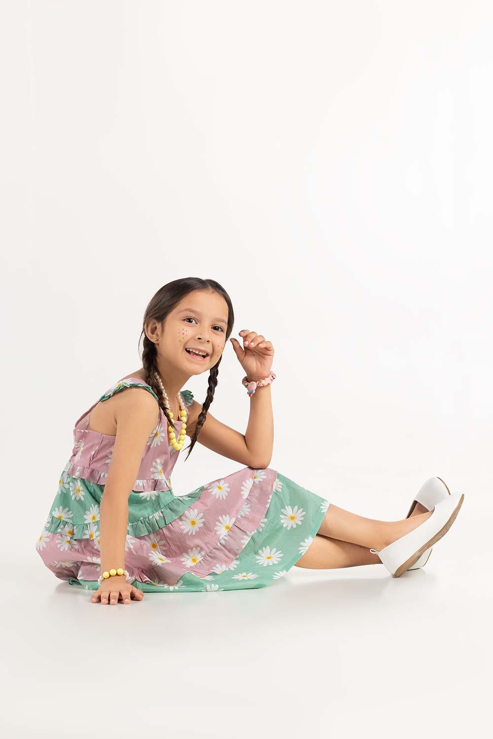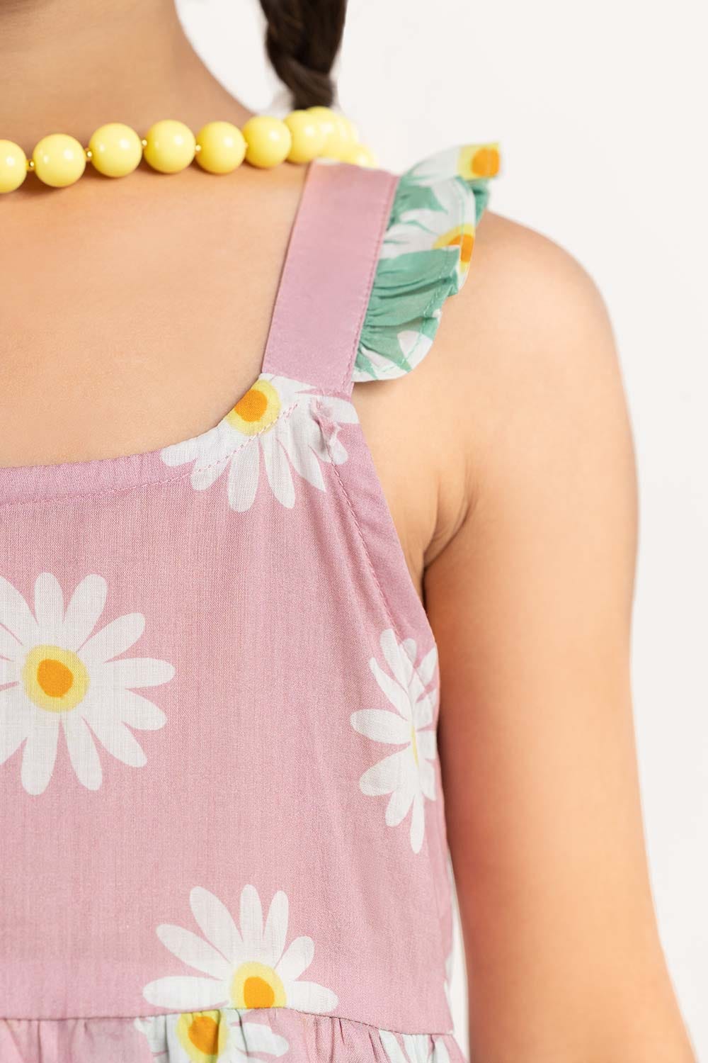 Floral dress with a straight neckline and straps with frills. Tiered frill details.