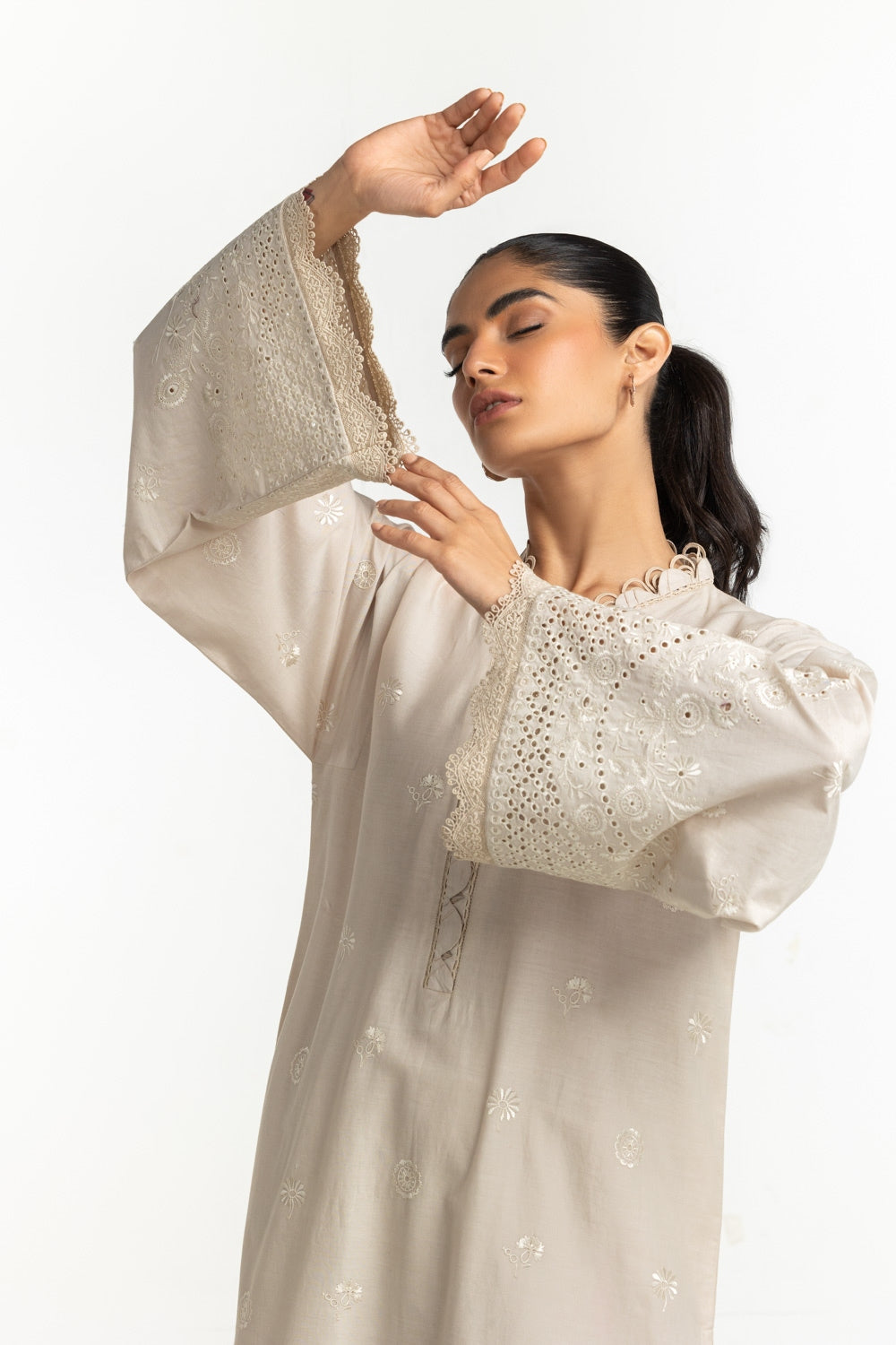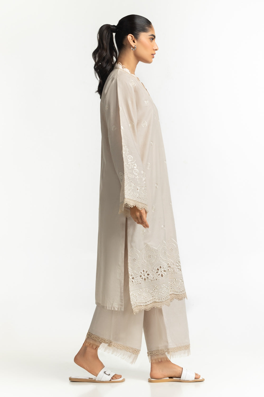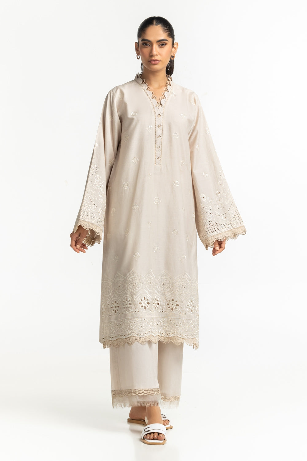 A symphony of fine cutwork on the sleeves and hemline with subtle embroidery across this shirt, paired with tailored trousers featuring contemporary detailing is a must-have for festive celebrations and gatherings.
