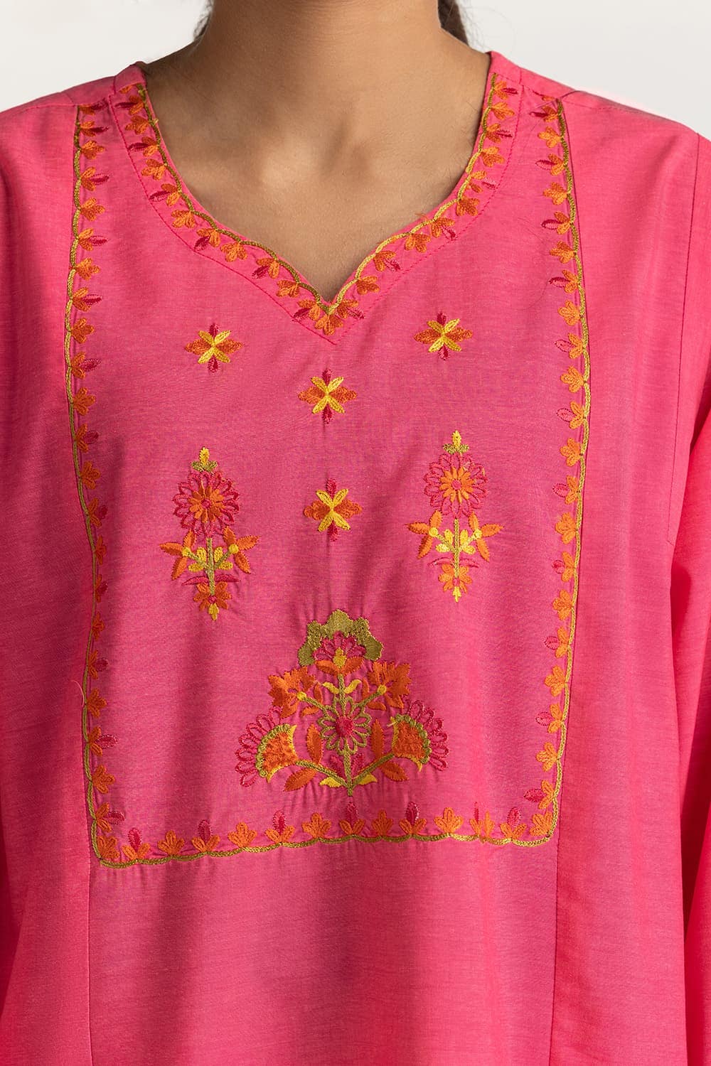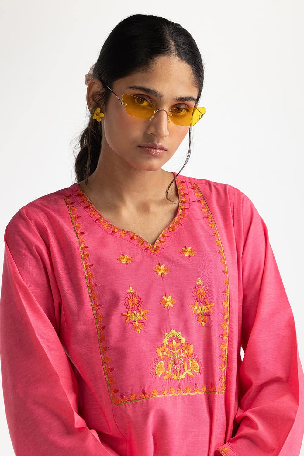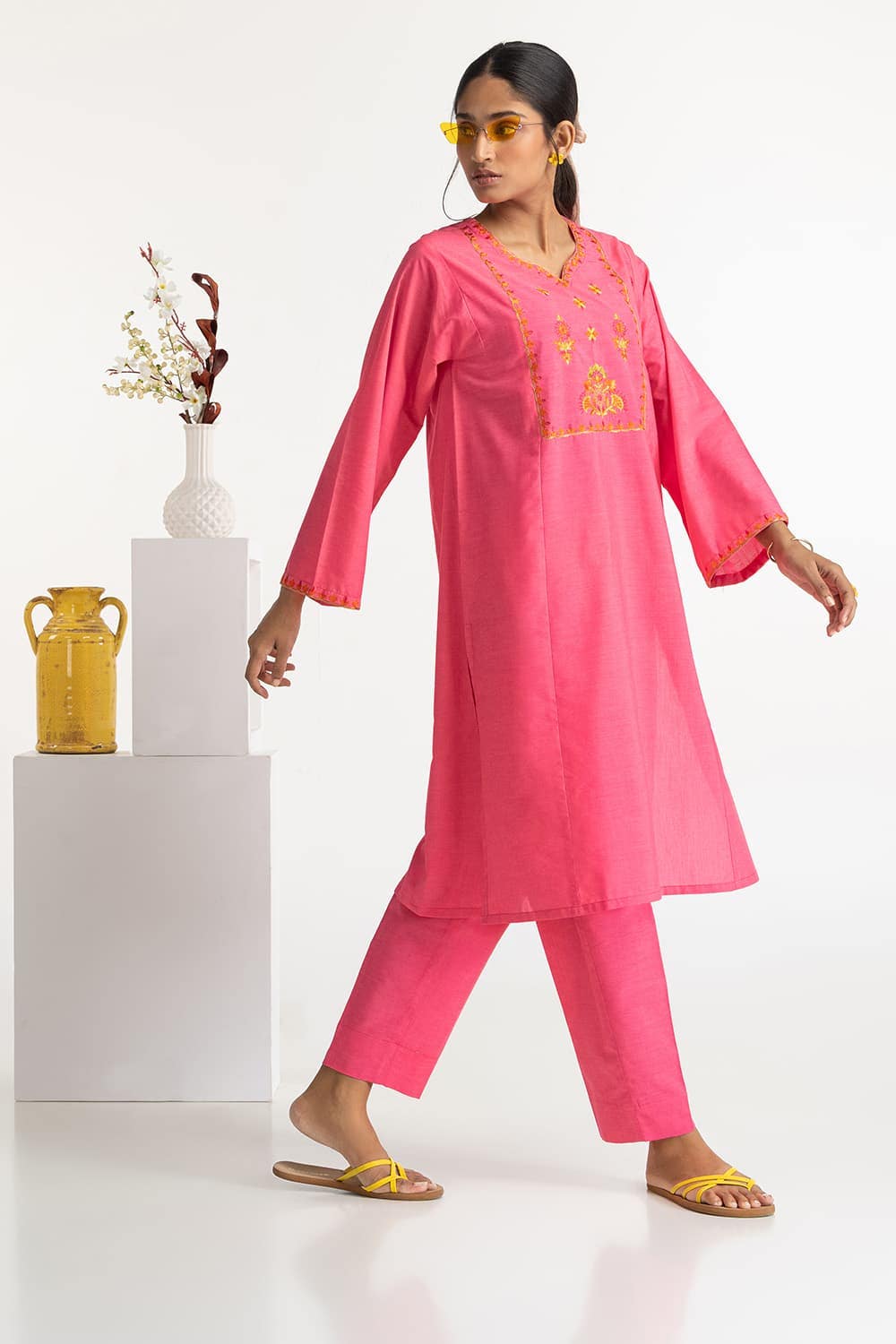 Ready to wear This charming pink Embroidered Co-Ord Set is highlighted by intricate embroidery on the neckline and front. The soft fabric and vibrant color ensure a comfortable and stylish look for any occasion.