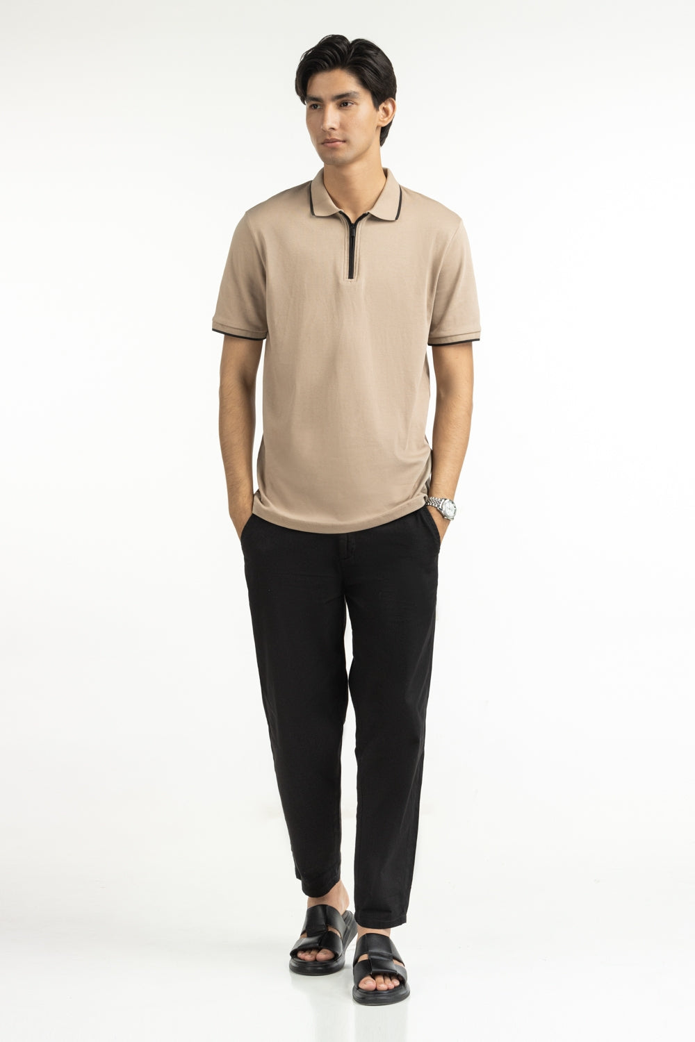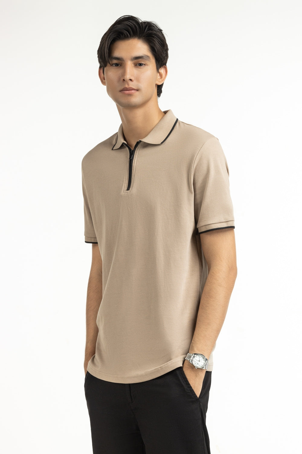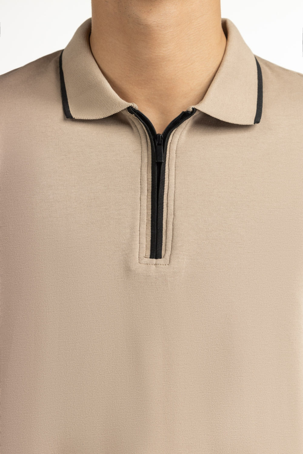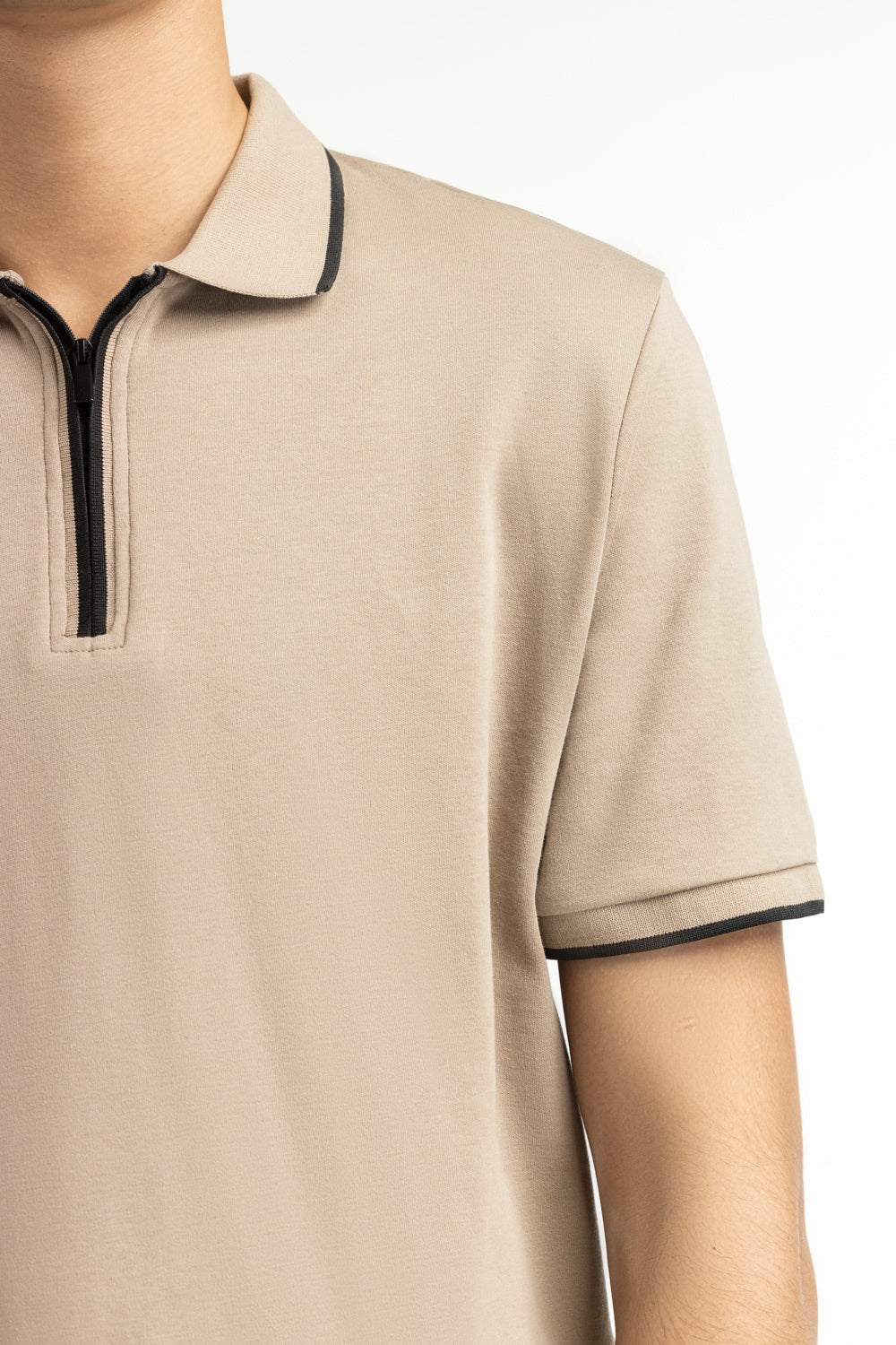 Tailored in breathable cotton interlock, this off-white polo offers a streamlined regular fit featuring with a zipped neckline for an edgy yet elegant profile. Its soft texture and airy construction keeps you cool, while the design adds a contemporary touch to timeless comfort.