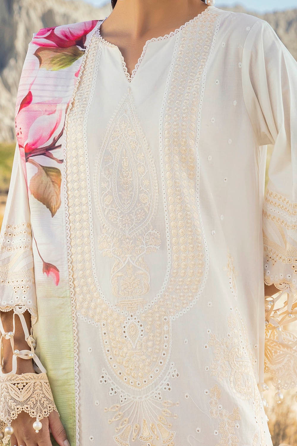• Embroidered Lawn Shirt Front & Sleeves with Embroidered Borders for Front & Back on Organza. Dyed Lawn Back - 2.28 Meters