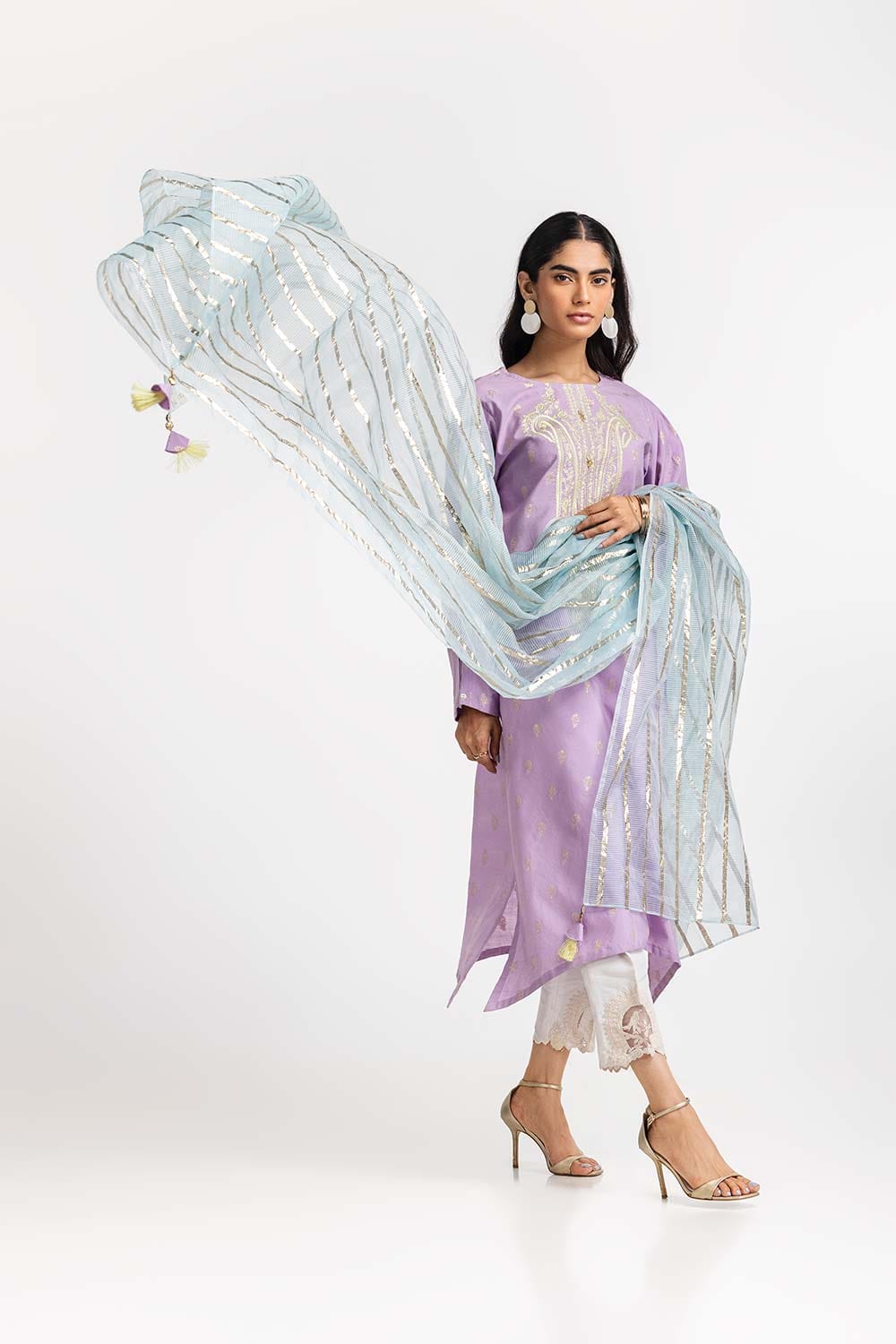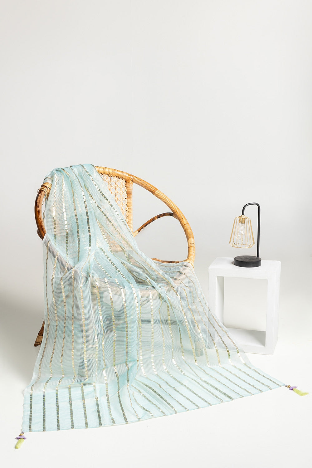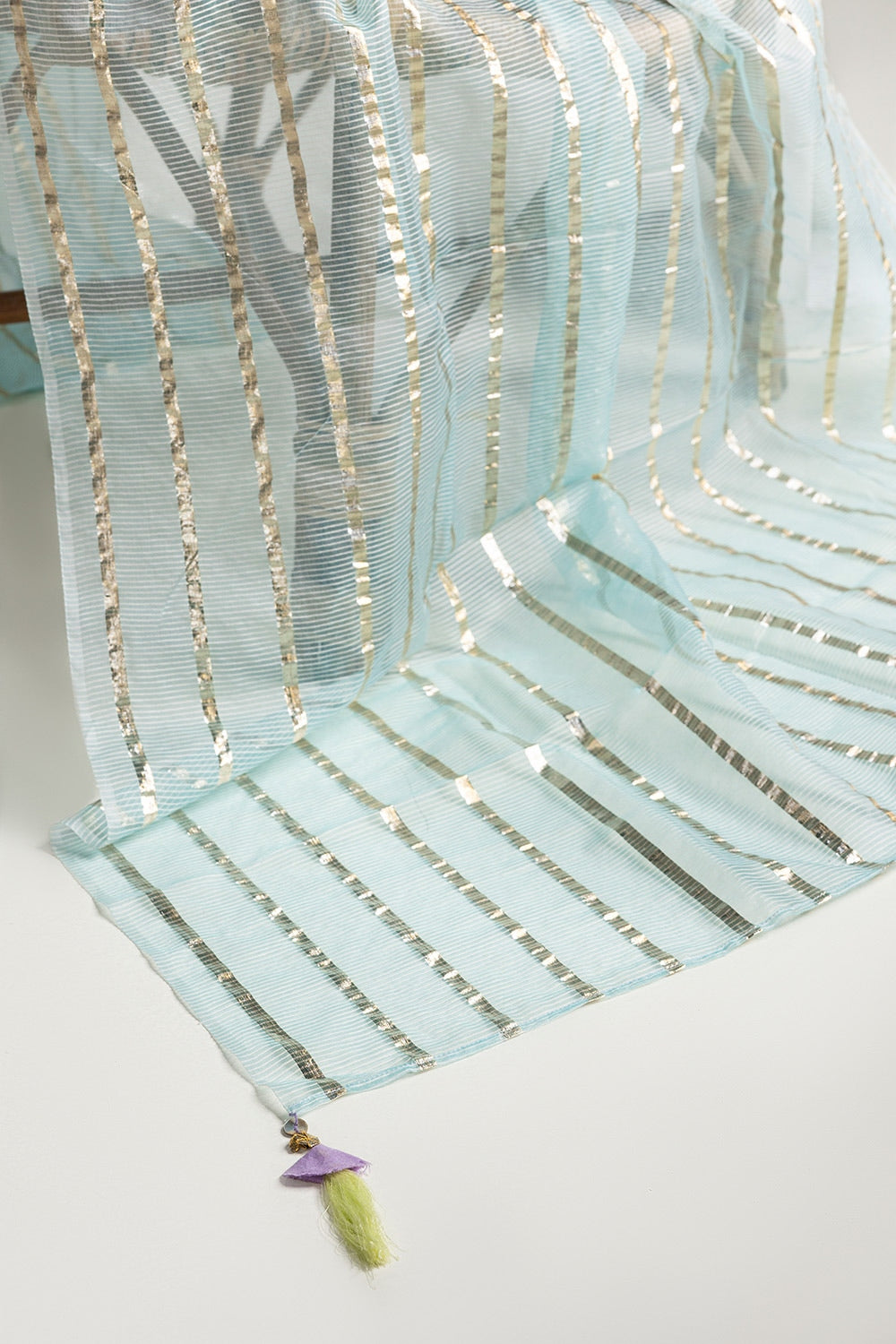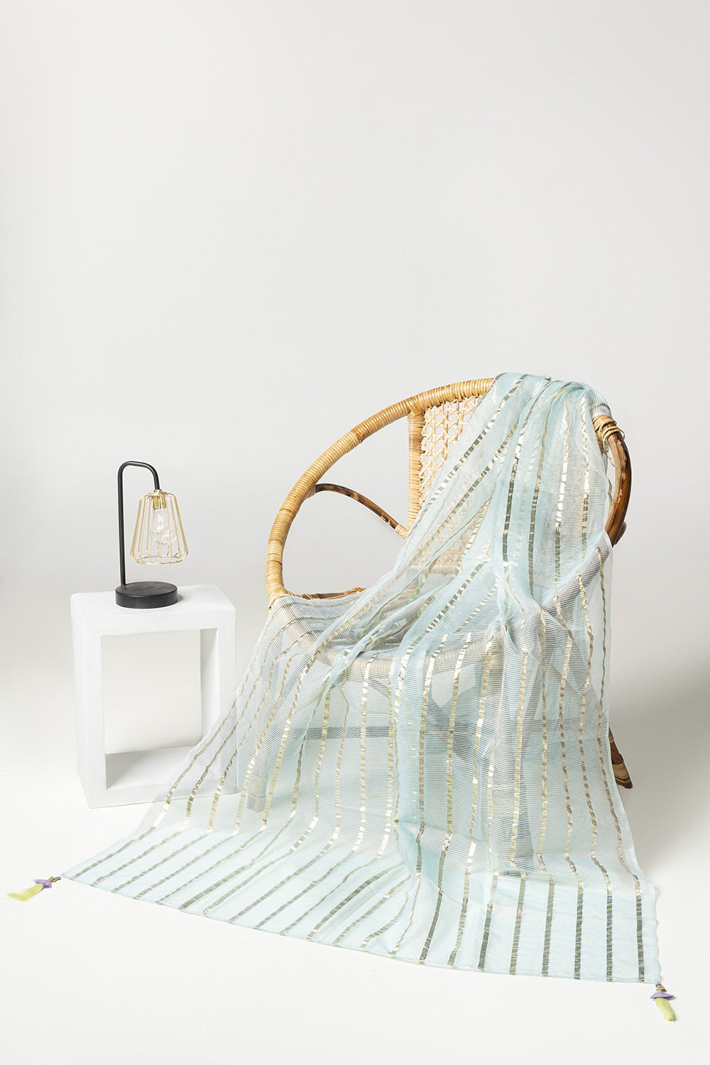 Ready to wear Complete your look with this beautiful mint dupatta, adorned with shimmering gold stripes and detailed edges. The lightweight, flowing fabric adds a touch of elegance and grace, making it the perfect accessory for enhancing any ensemble.