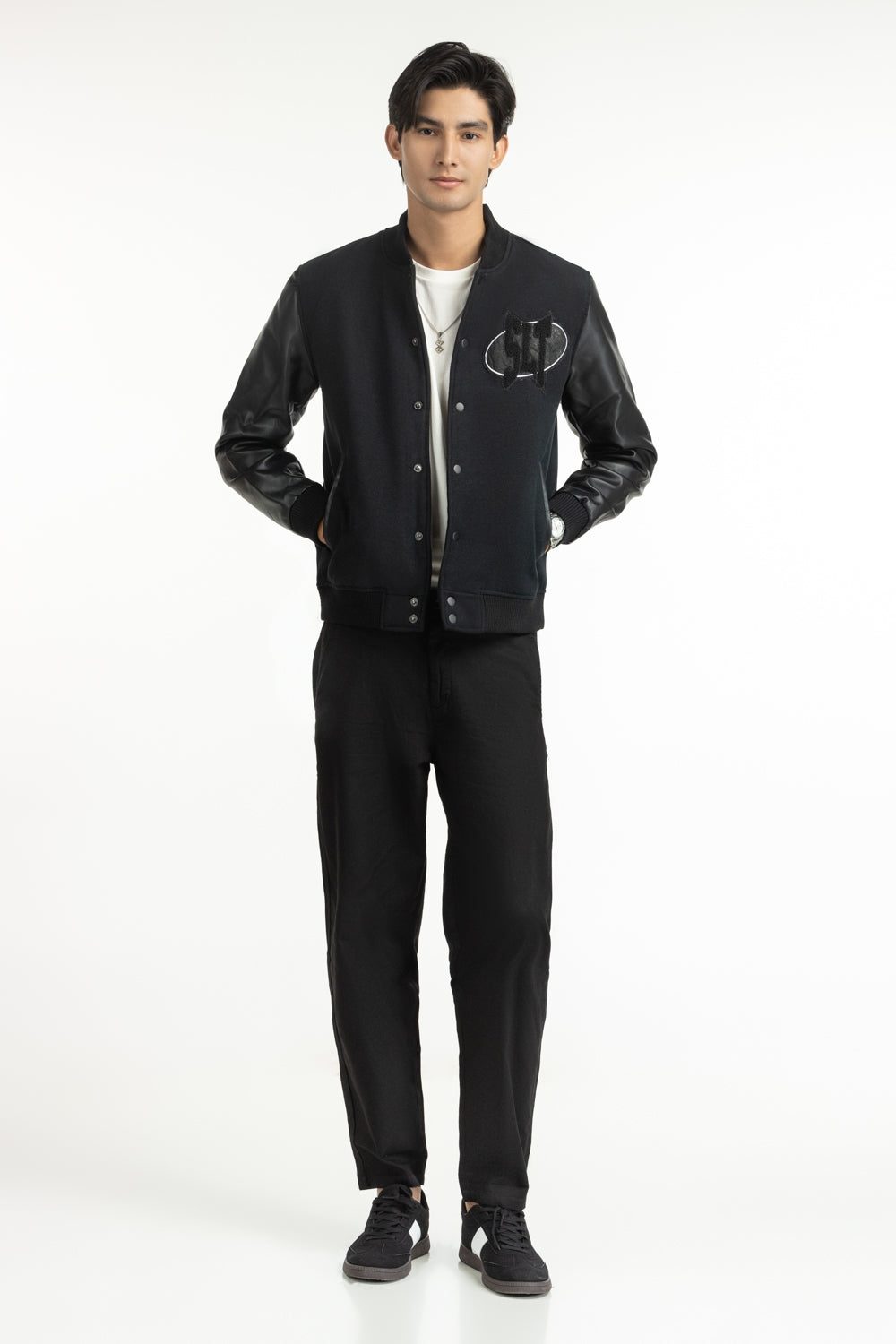 Cut from premium faux leather with a subtle grain, this black jacket is a statement. A soft band collar keeps the look sharp without sacrificing comfort. Designed with deep welt pockets to hold essentials and warmth alike. Contemporary yet comforting, just the way winters should be.