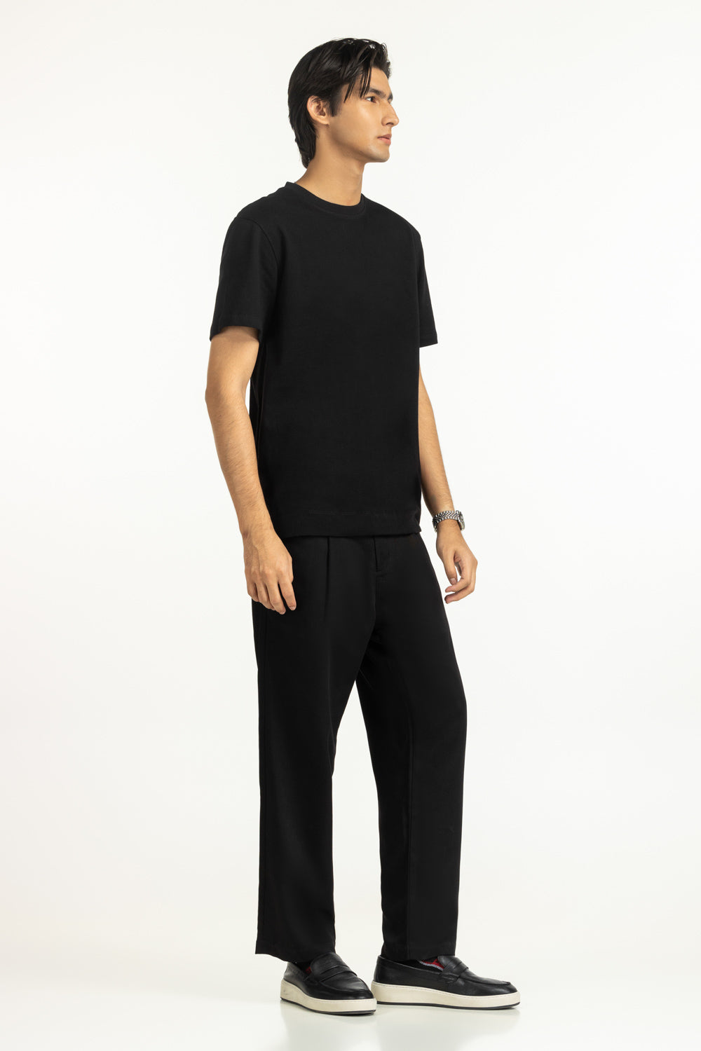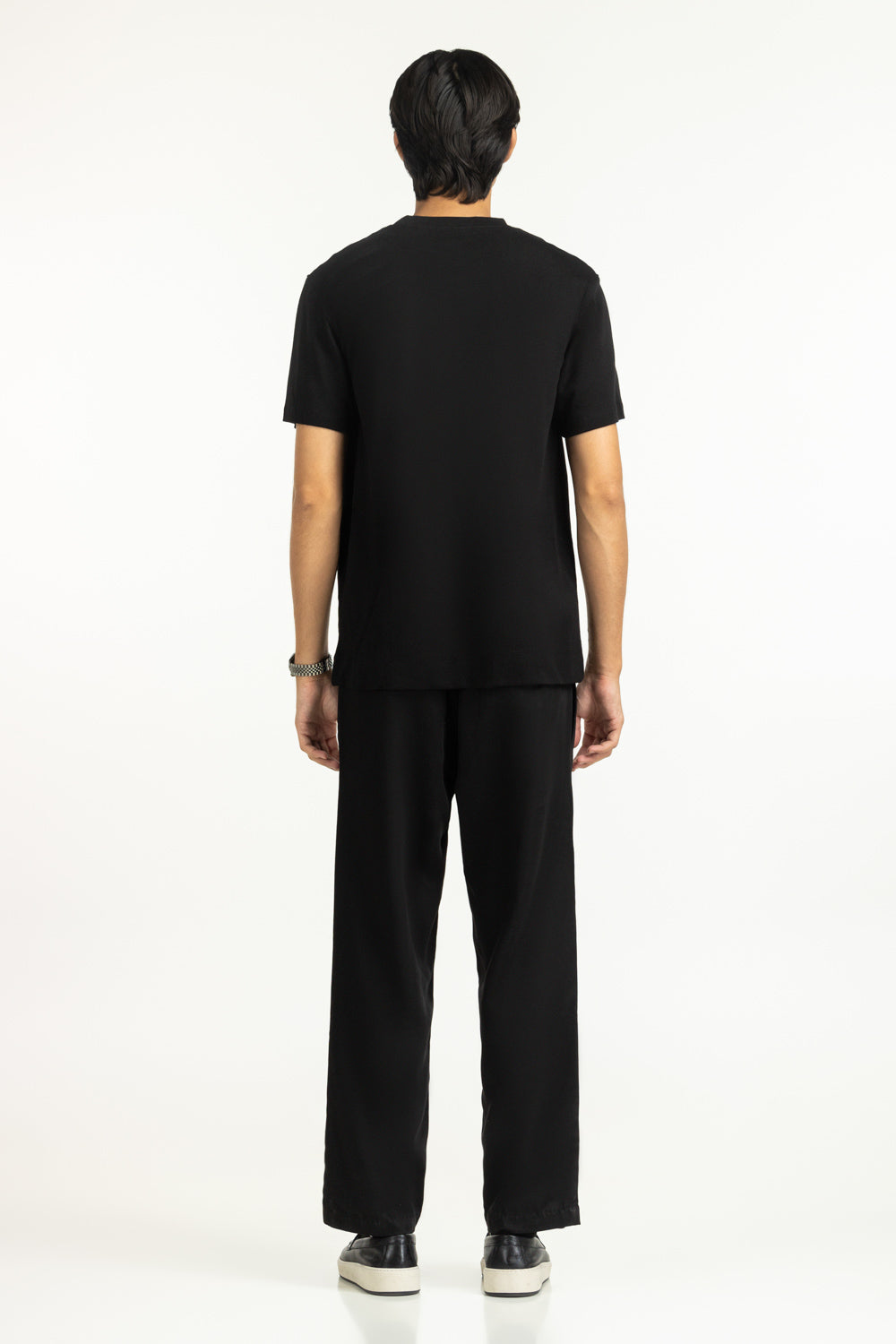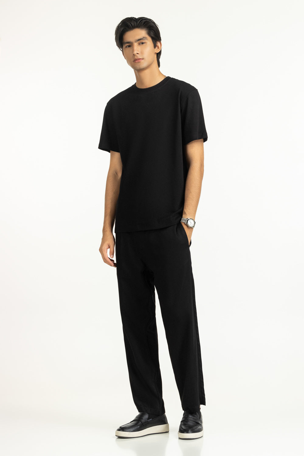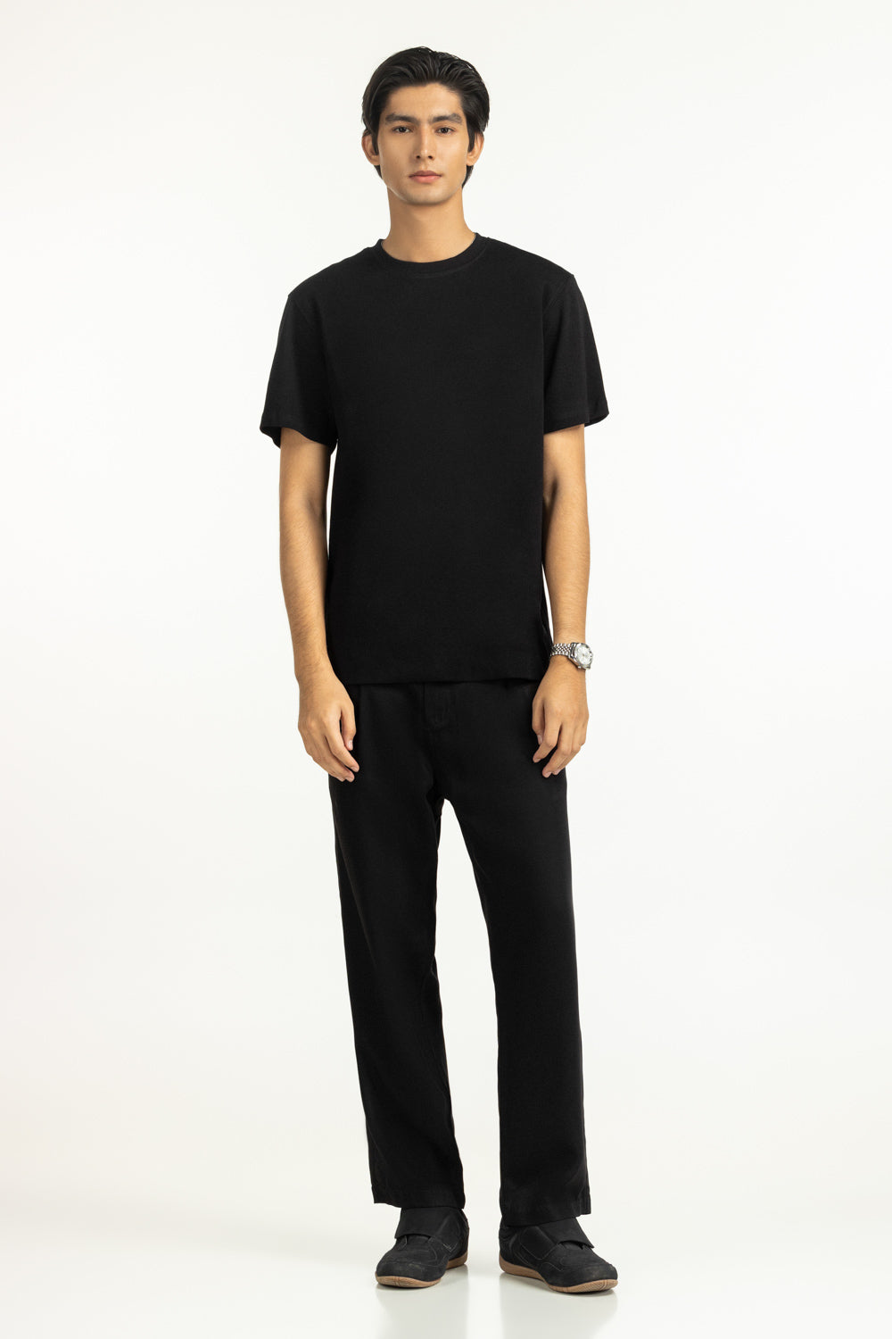 Timeless black meets the soft texture of this t-shirt in a regular fit. Its cut maintains a clean silhouette while giving enough room to move freely, making summer dressing effortless.