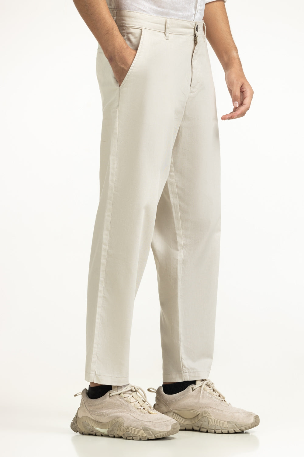 90%Cotton 10% Linen With a neutral off-white canvas, these trousers are made to adapt to any setting. Their soft fabric is selected to provide comfort while exuding finesse. While the regular fit offers both rooms to move and a refined outline. Making it a subtle yet powerful statement for summer dressing.