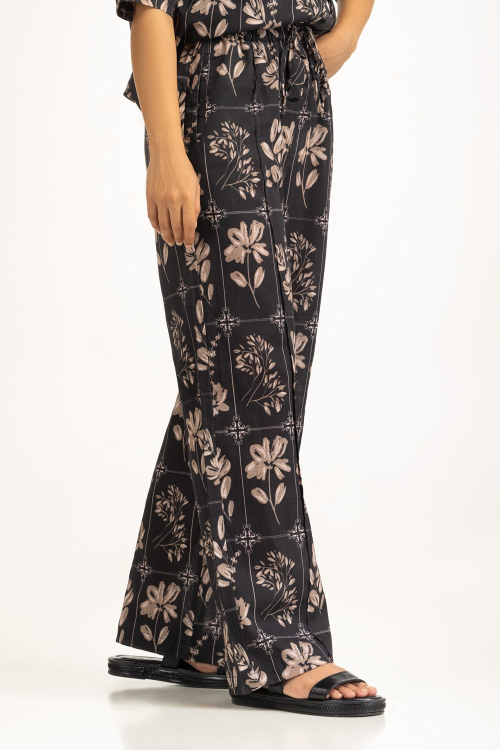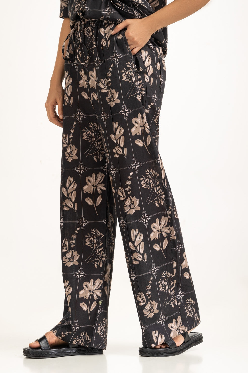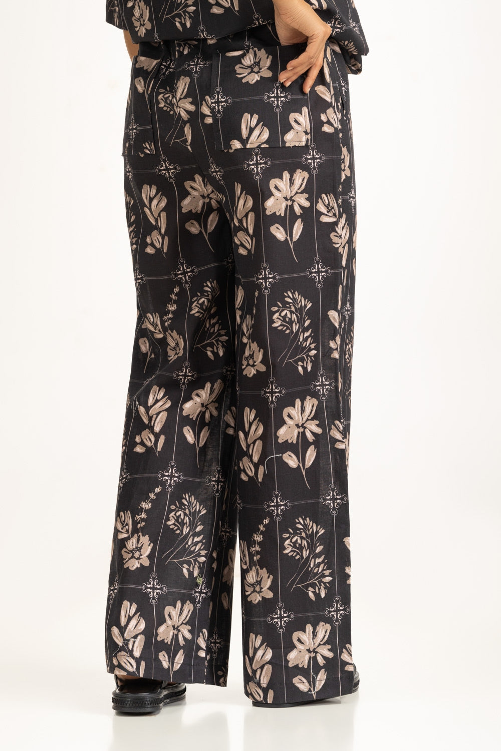 Grounded in a deep black hue, these trousers are brought to life with a delicate floral print that feels modern yet timeless. The regular fit silhouette flows with ease, making them a warm-weather essential. Finished with side pockets, they blend function with understated sophistication.