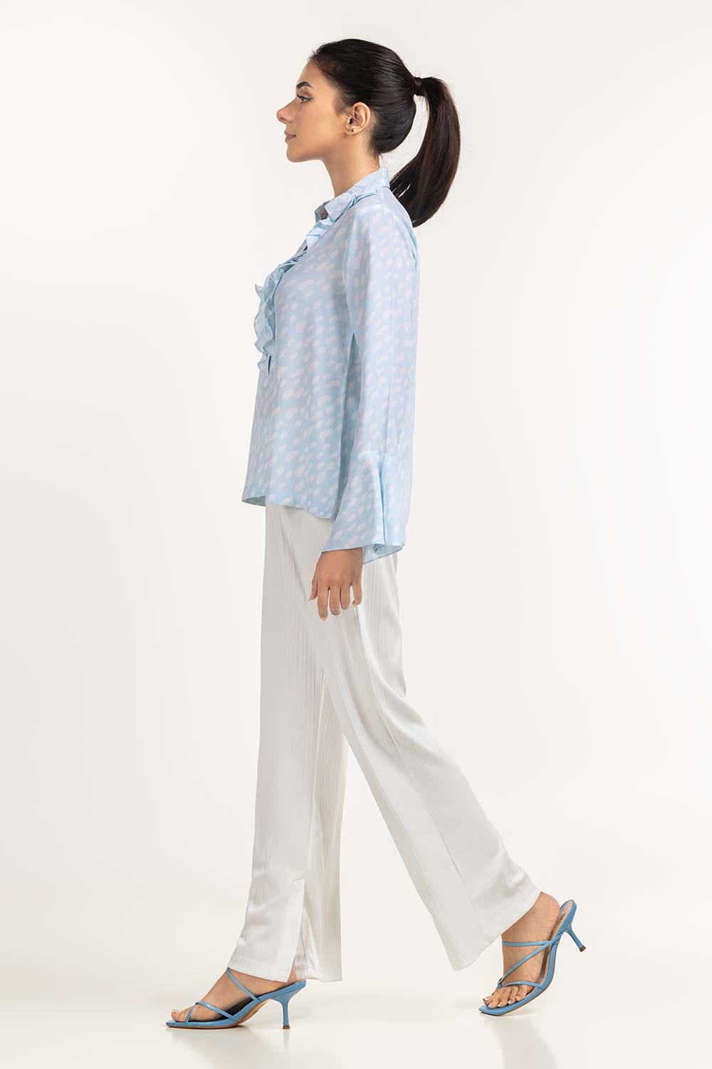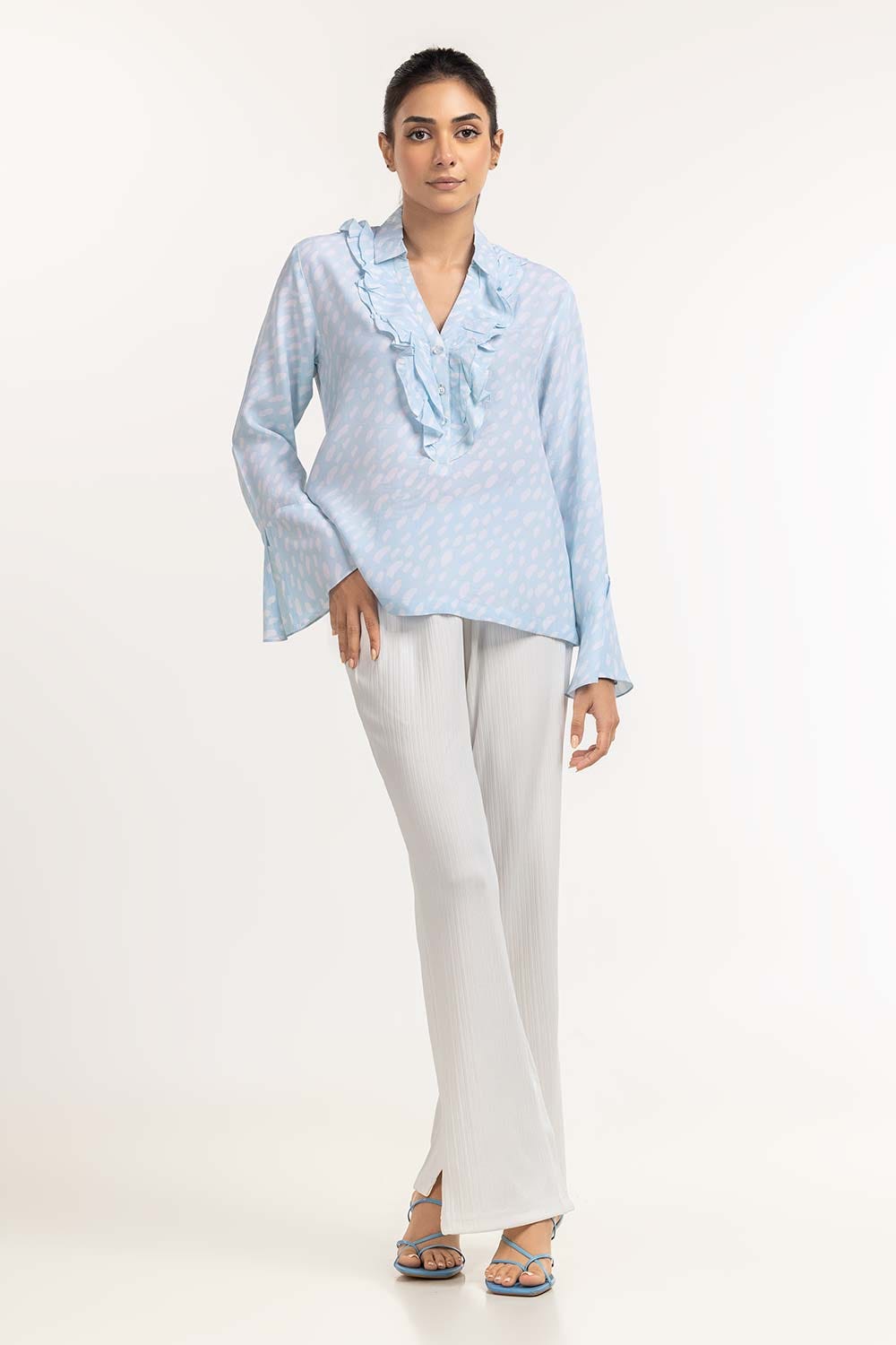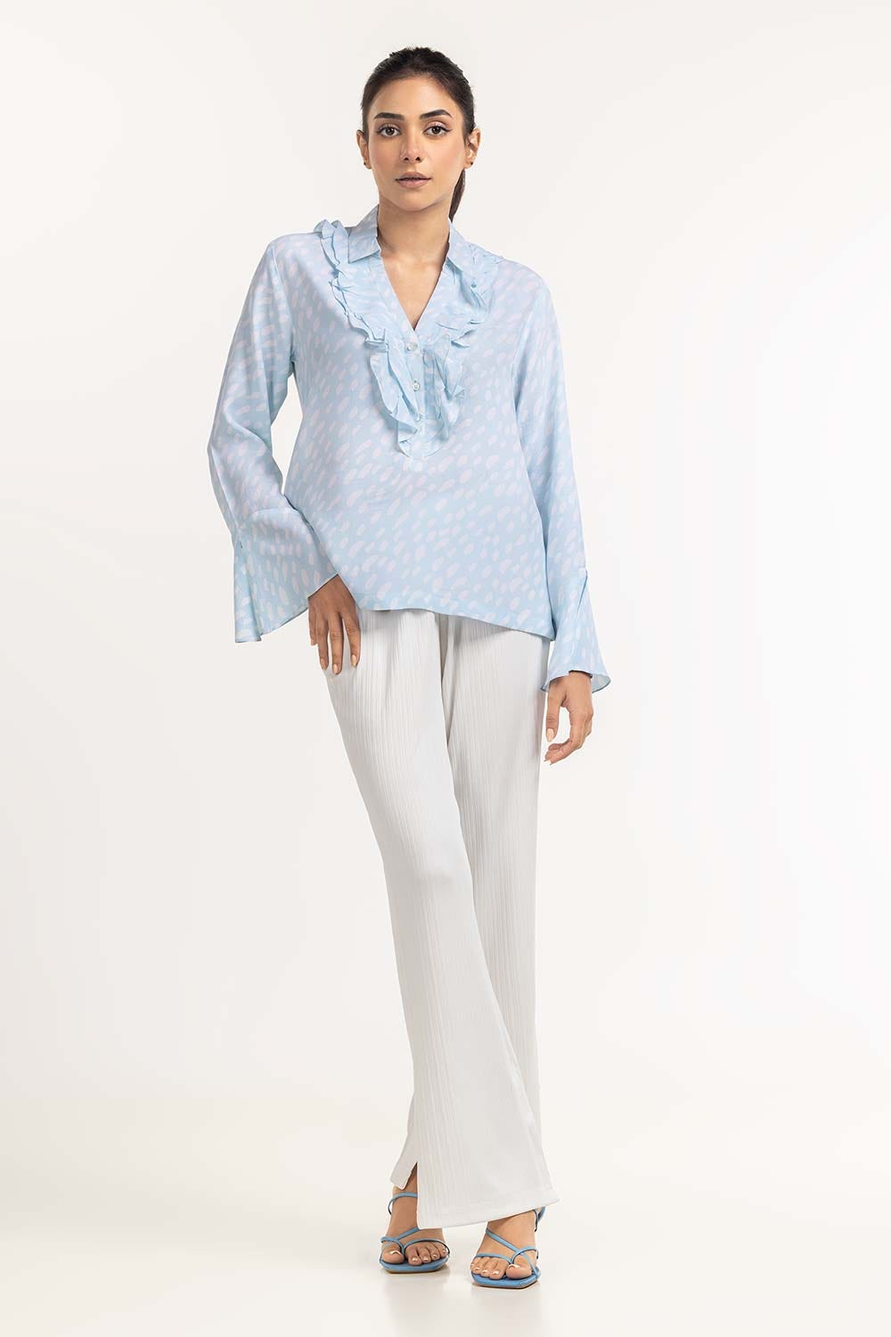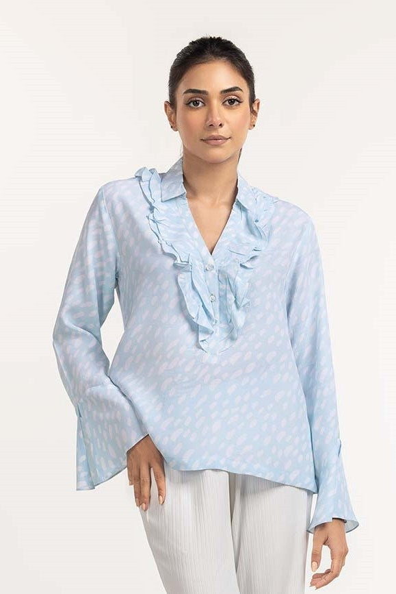 Blouse With Ruffle Detail Around Front Placket And Flared Cuffs.