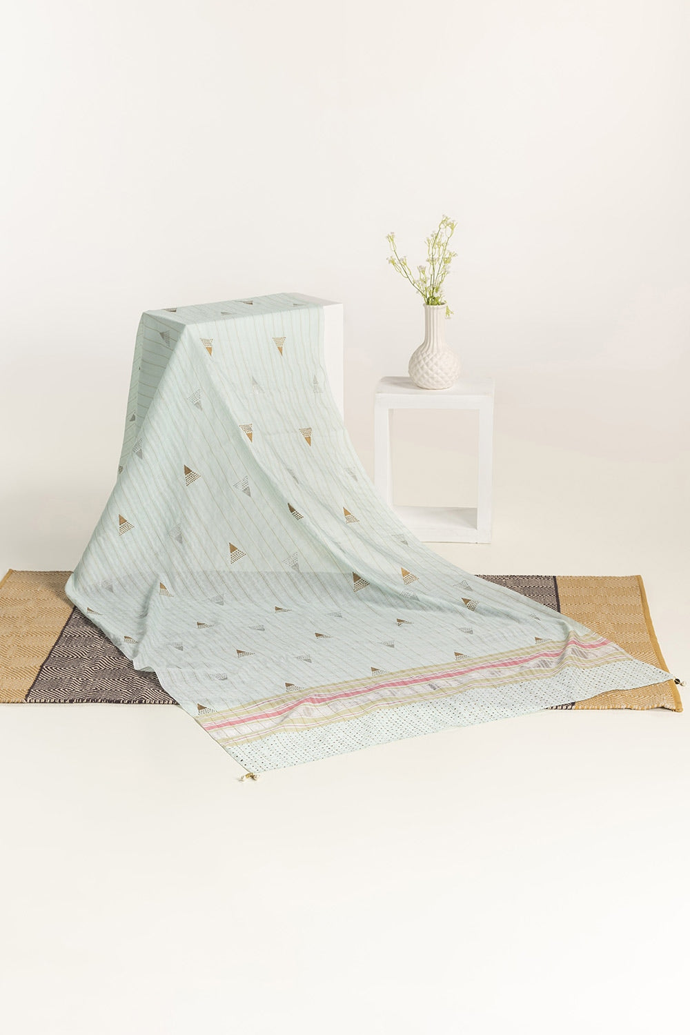 Ready to wear Refresh your wardrobe with this mint yarn dyed block printed duppata. Adorned with geometric foil patterns and vibrant stripes, it brings a fresh and stylish appeal to any outfit.