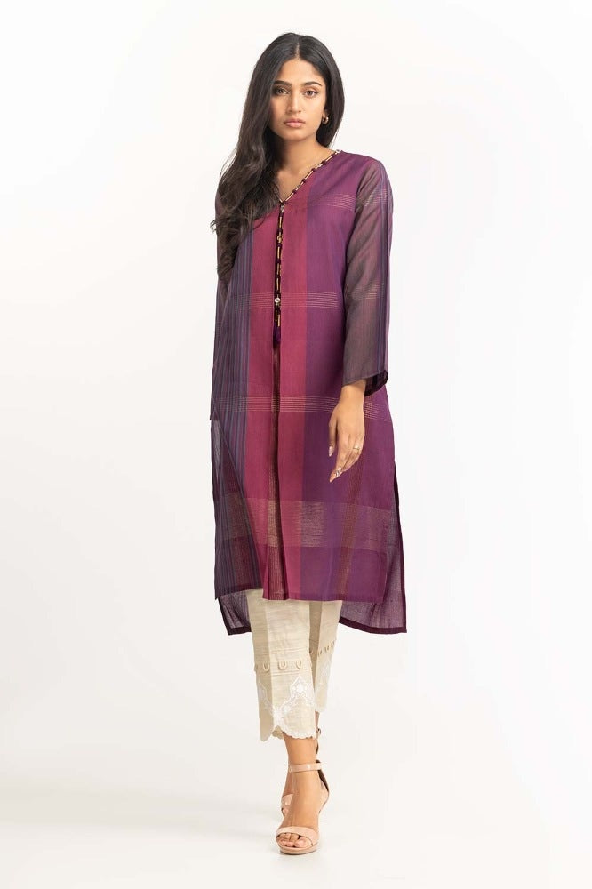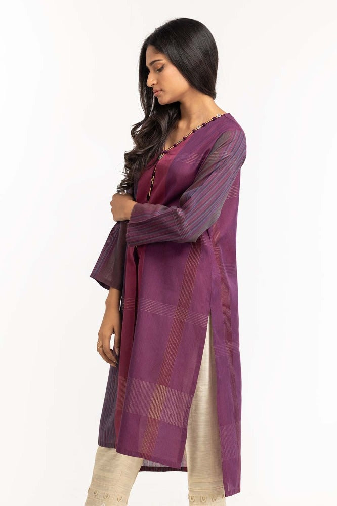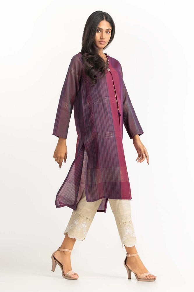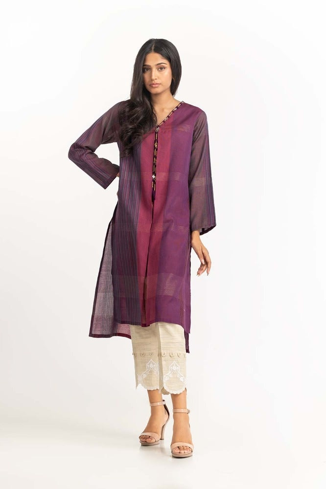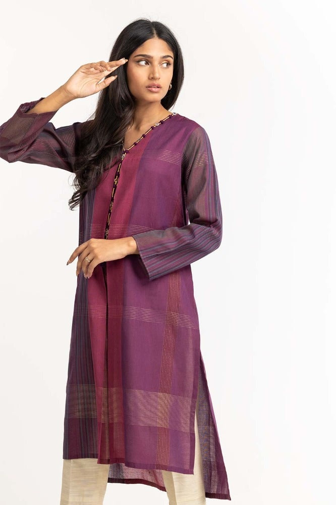 Ready to wear Yarn dyed shirt with an embellished v-neckline, straight sleeves and straight hem.