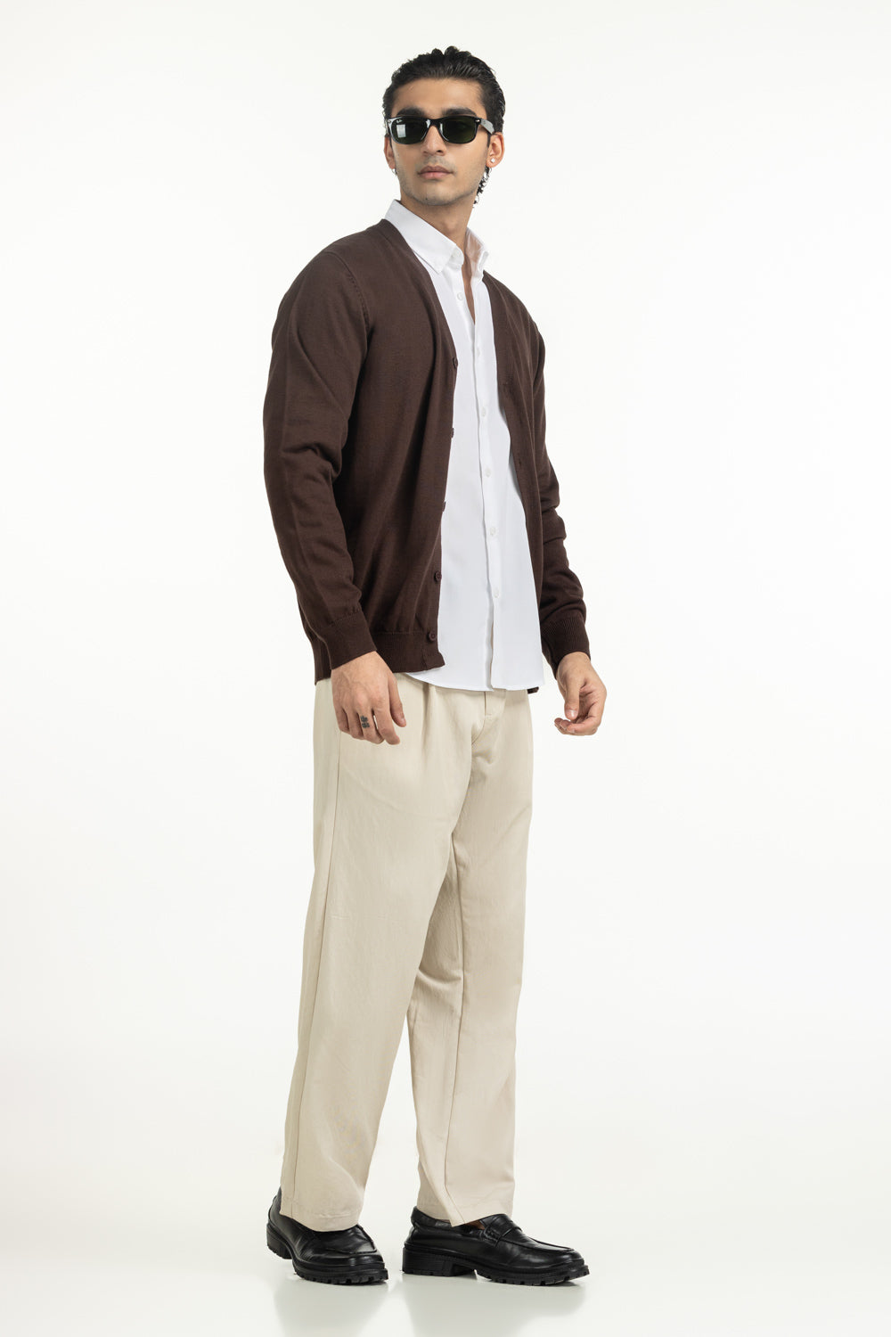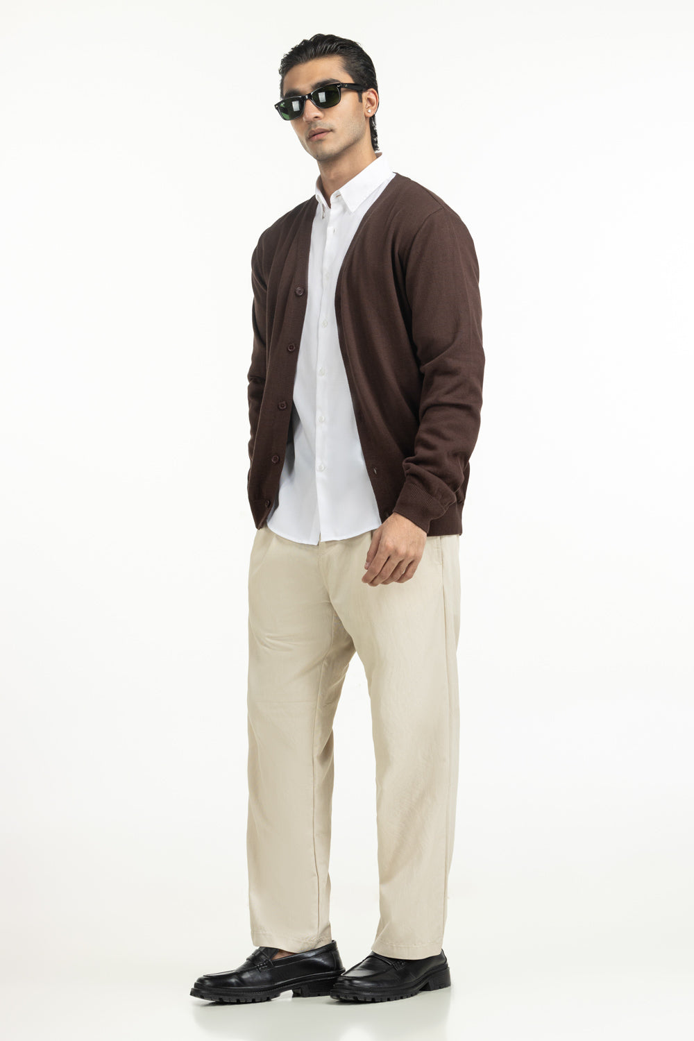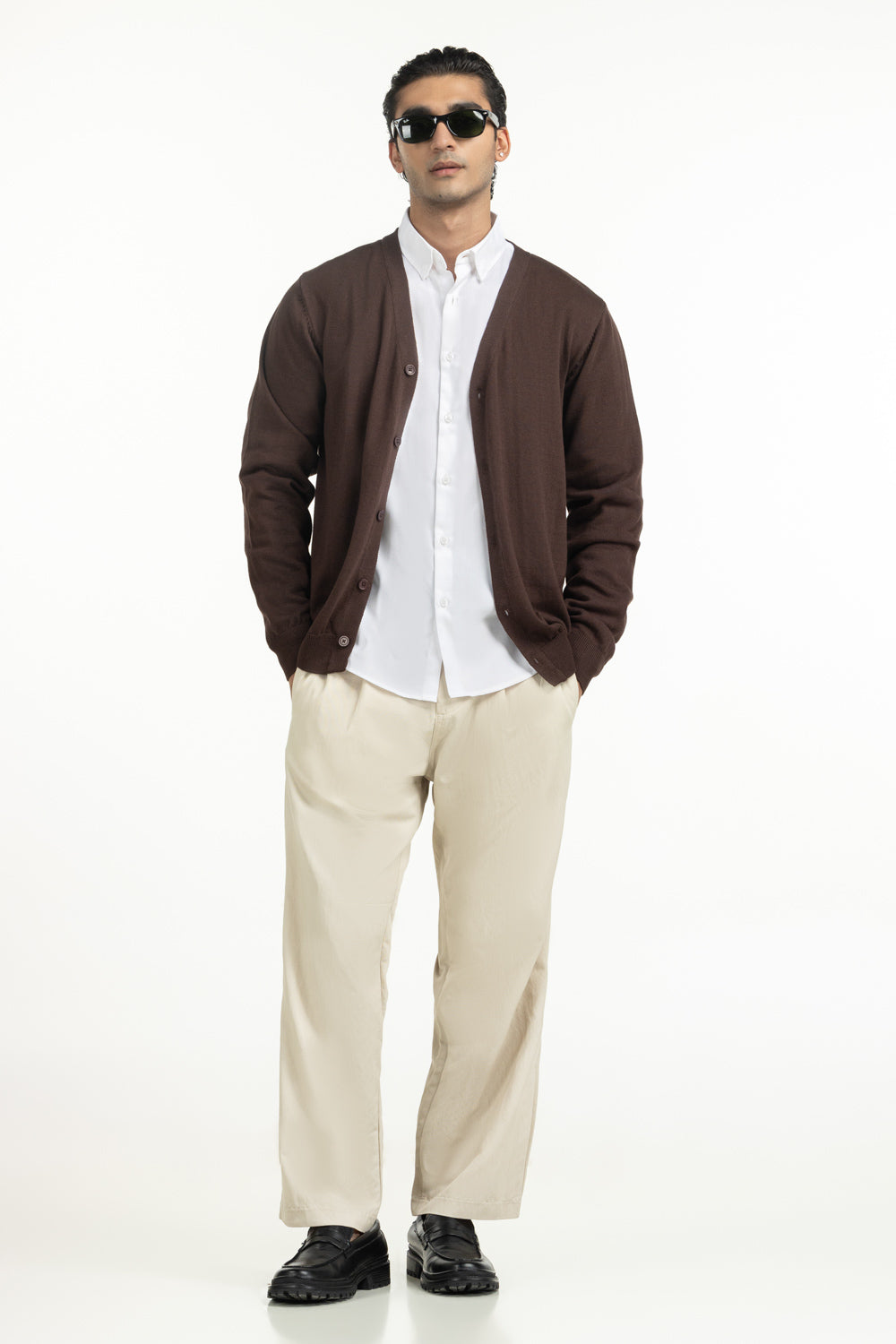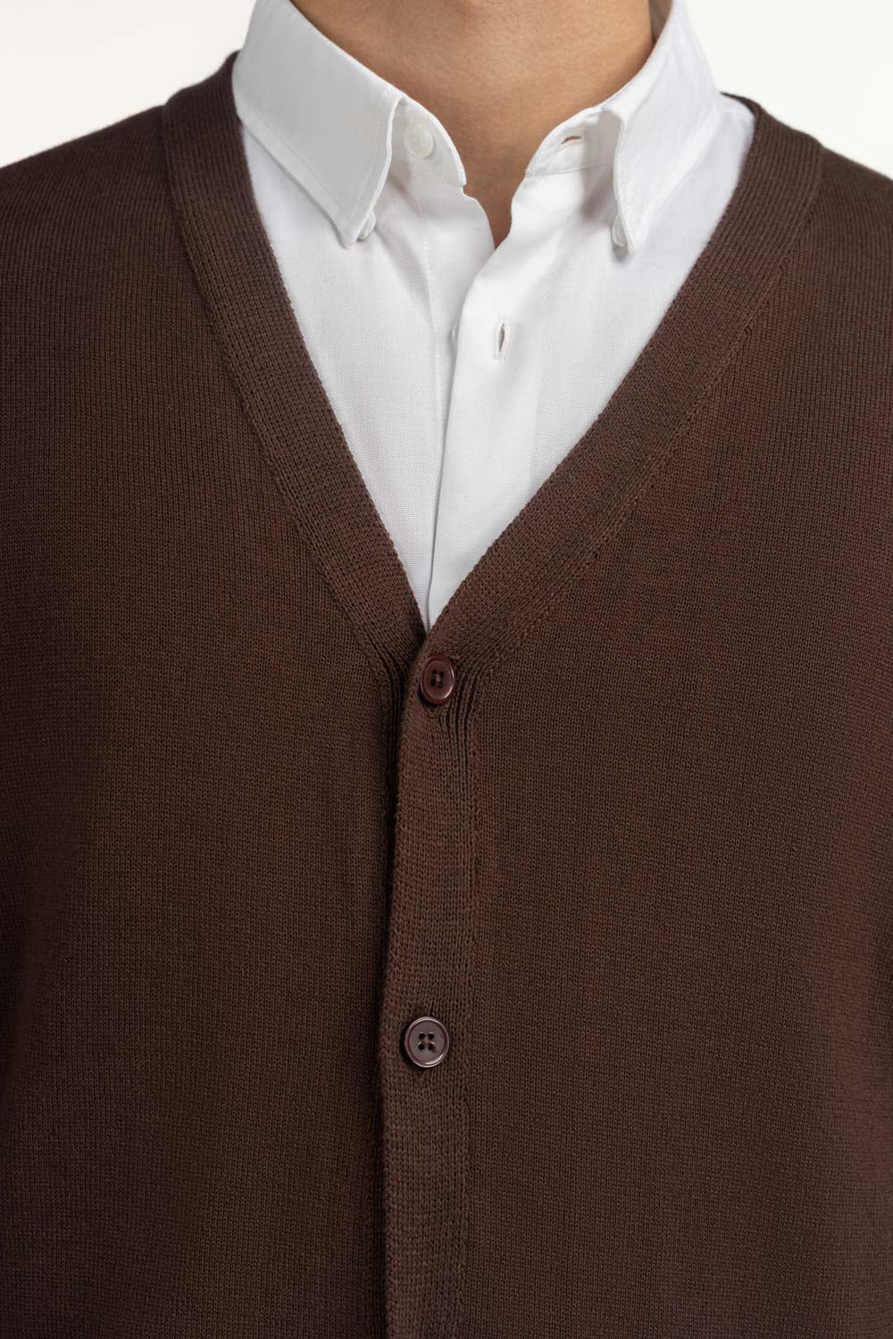 This dark brown cardigan redefines winter sophistication with its sleek V-neckline and button-down style. Knitted to perfection, the regular fit offers ease of movement while keeping the look polished. Its rich texture and smooth finish speak of timeless craftsmanship. Designed for men who prefer subtle elegance wrapped in comfort.