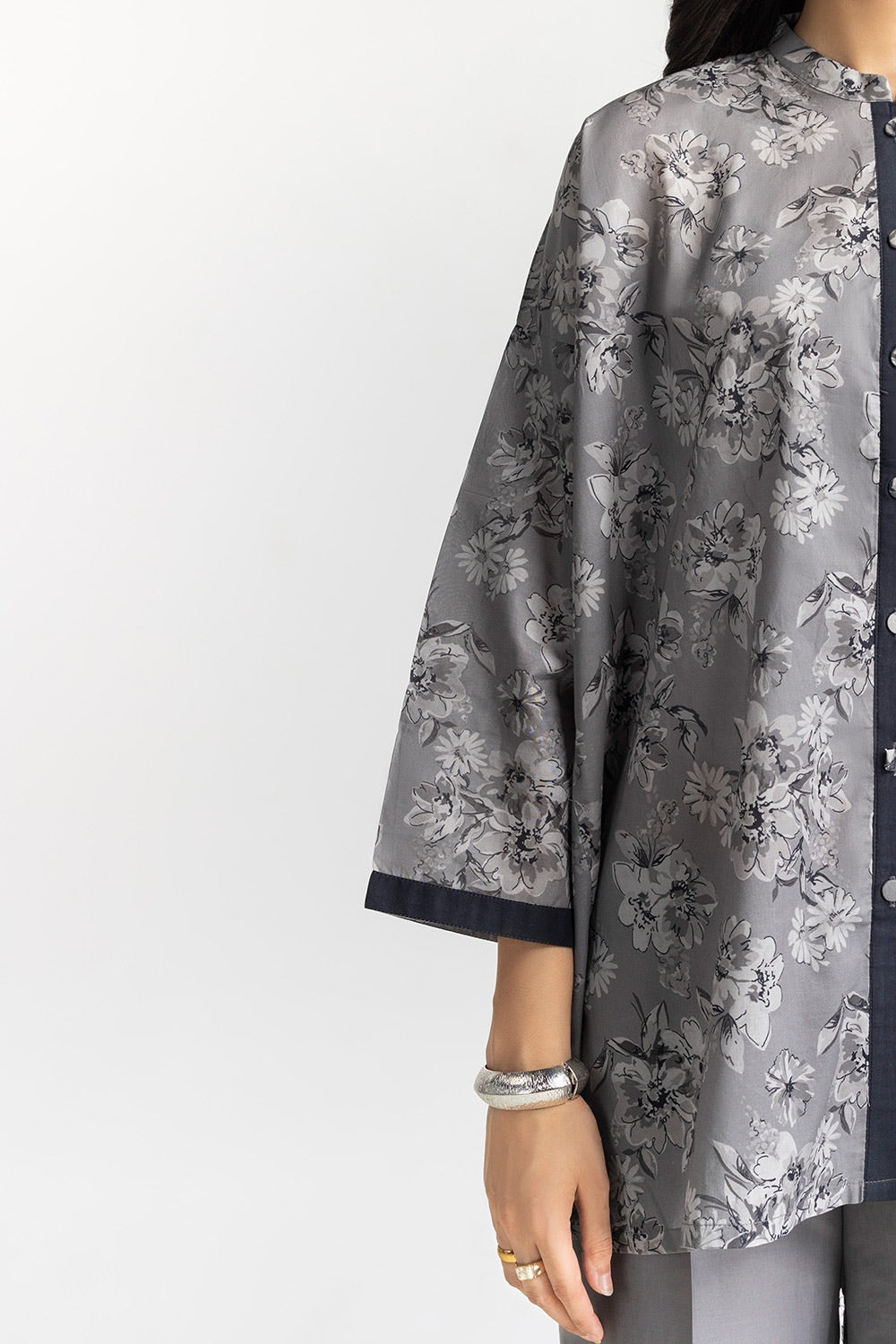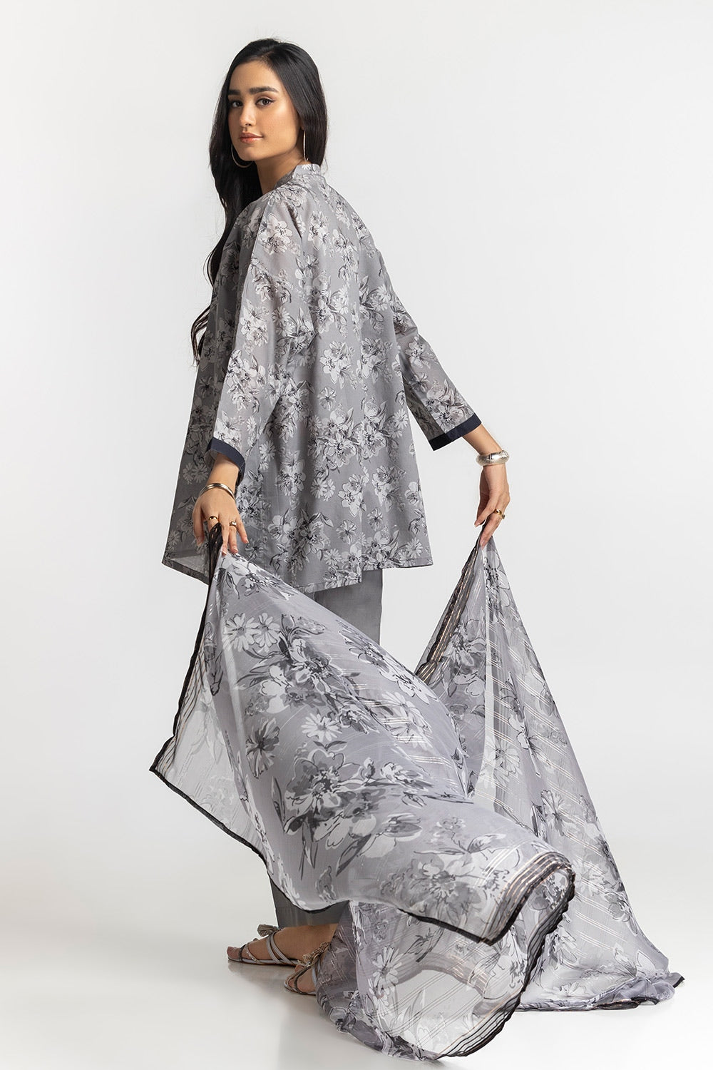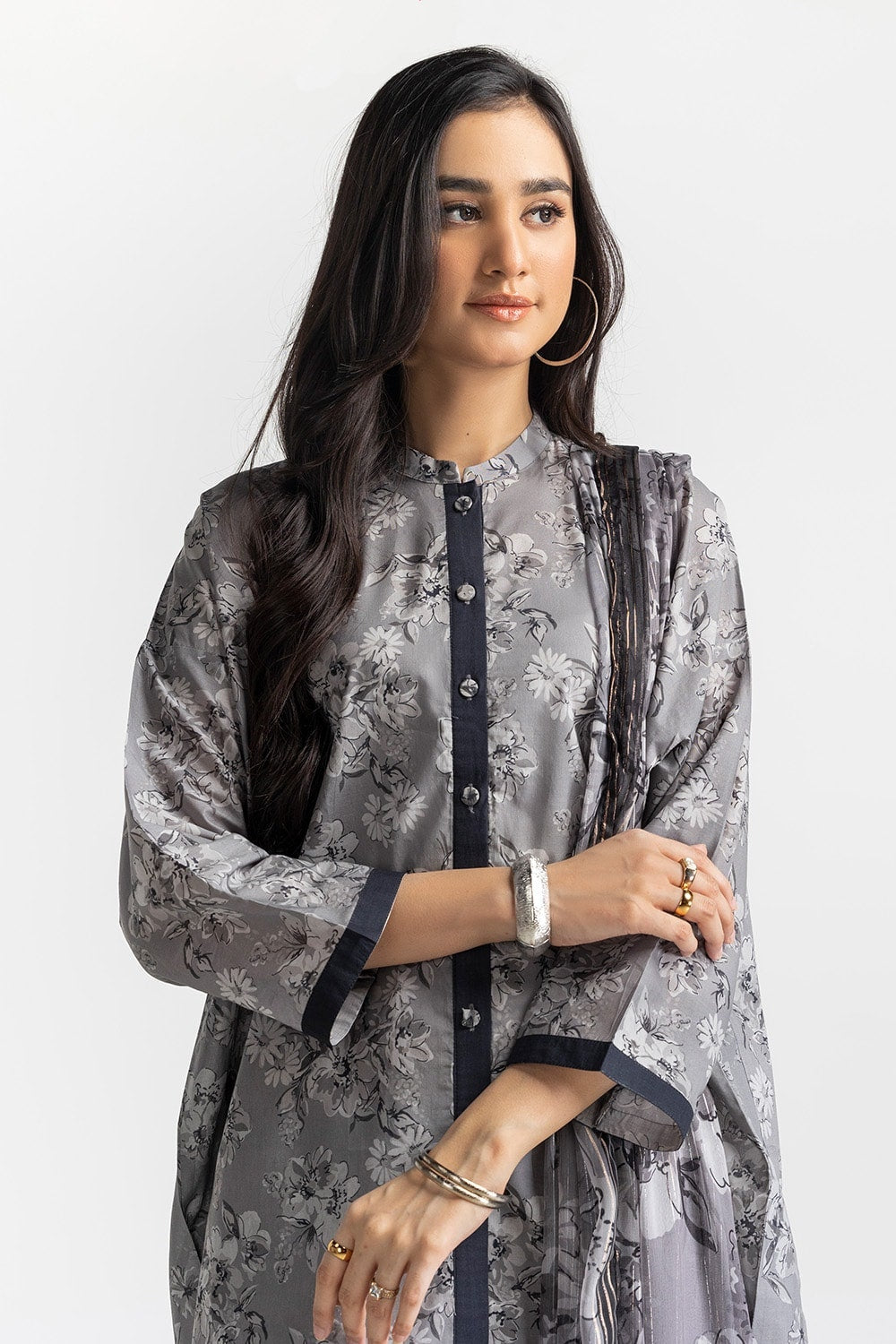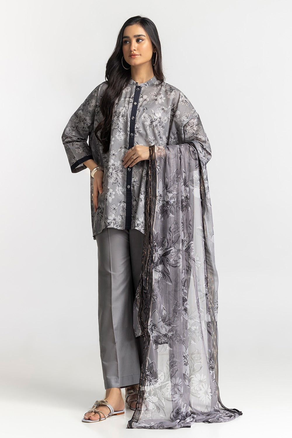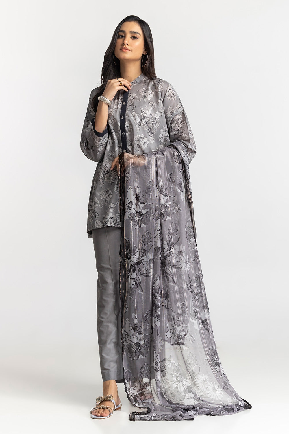 Embrace grace with this 3PC chic grey suit featuring intricate floral patterns. The set includes a matching dupatta and straight-cut pants, offering a perfect blend of style and comfort for any occasion.