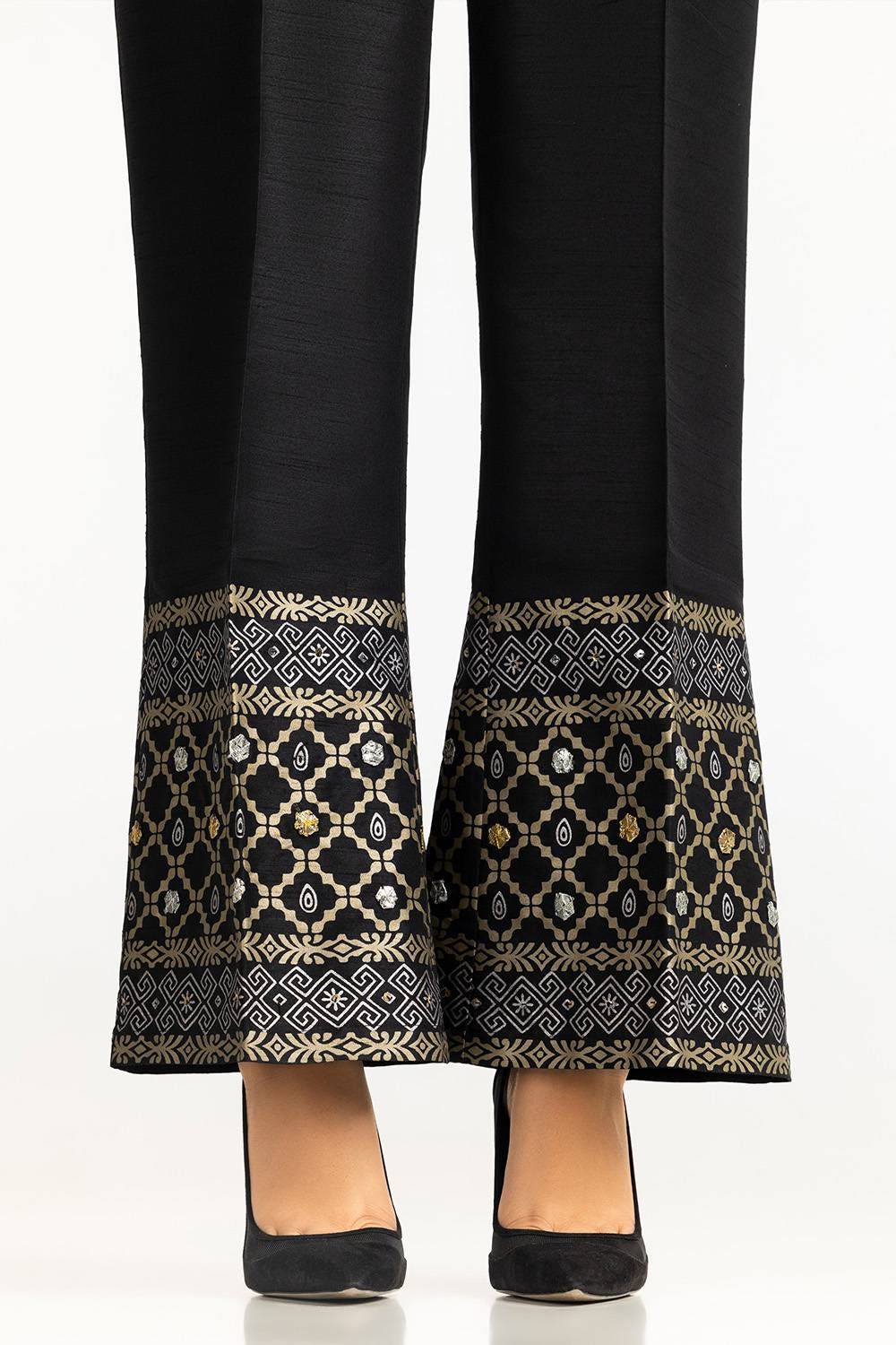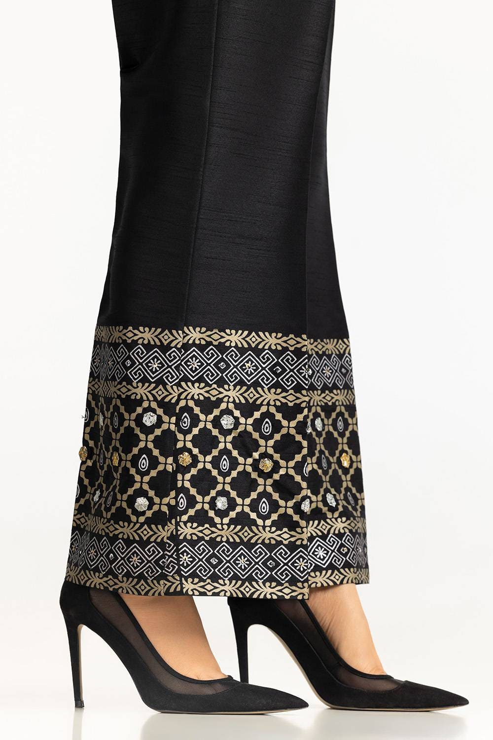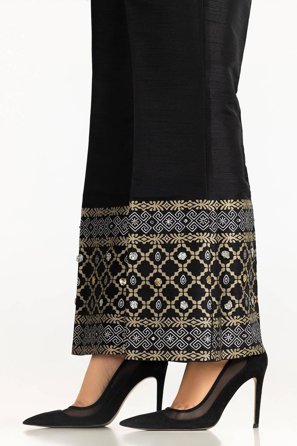 Ready to wear Make a statement with these Black Rawsilk Block Printed Trousers. The luxurious raw silk fabric paired with striking block print detailing adds a bold touch of elegance to any outfit.