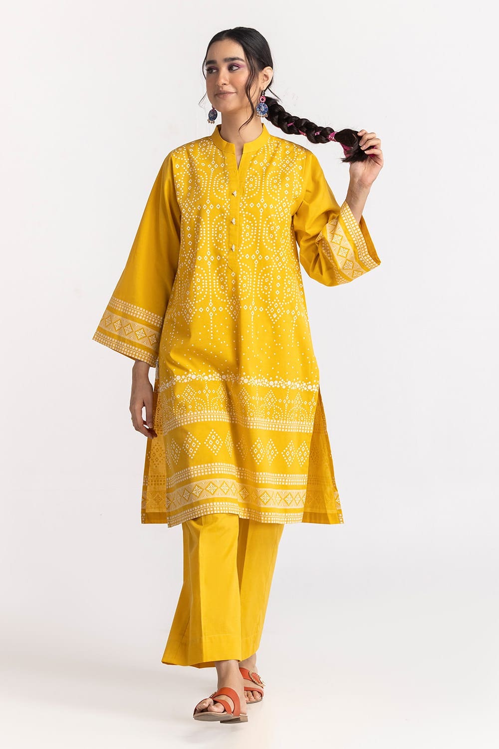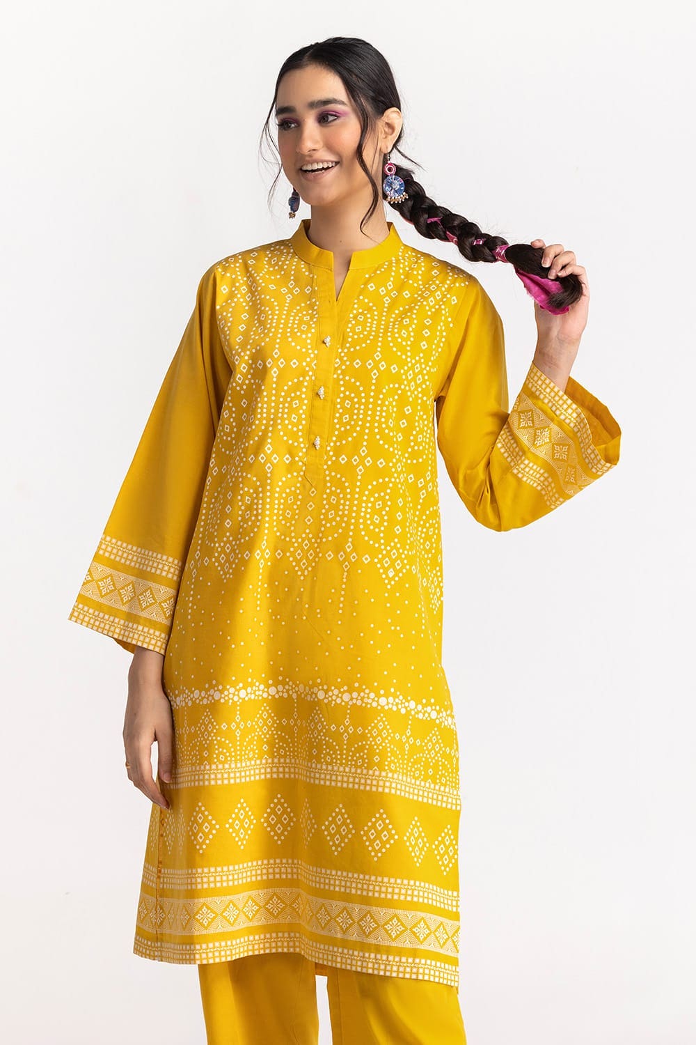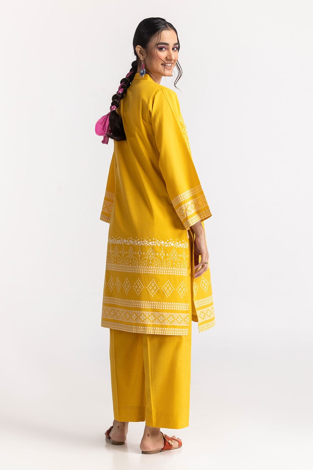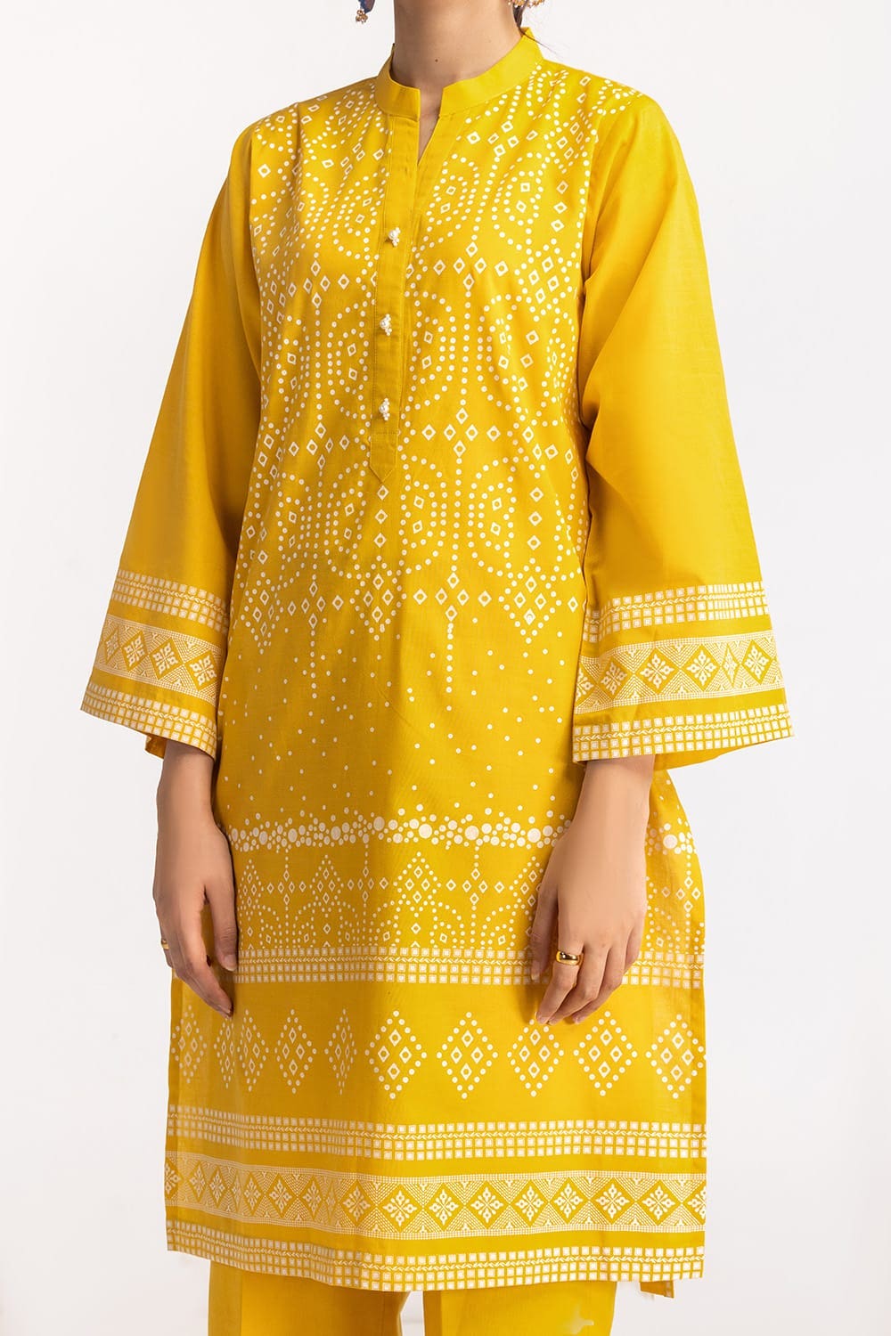 This 2PC yellow suit is adorned with intricate traditional prints on the kurta and sleeves. Paired with a matching trouser, it offers a lively and festive look, perfect for summer gatherings.