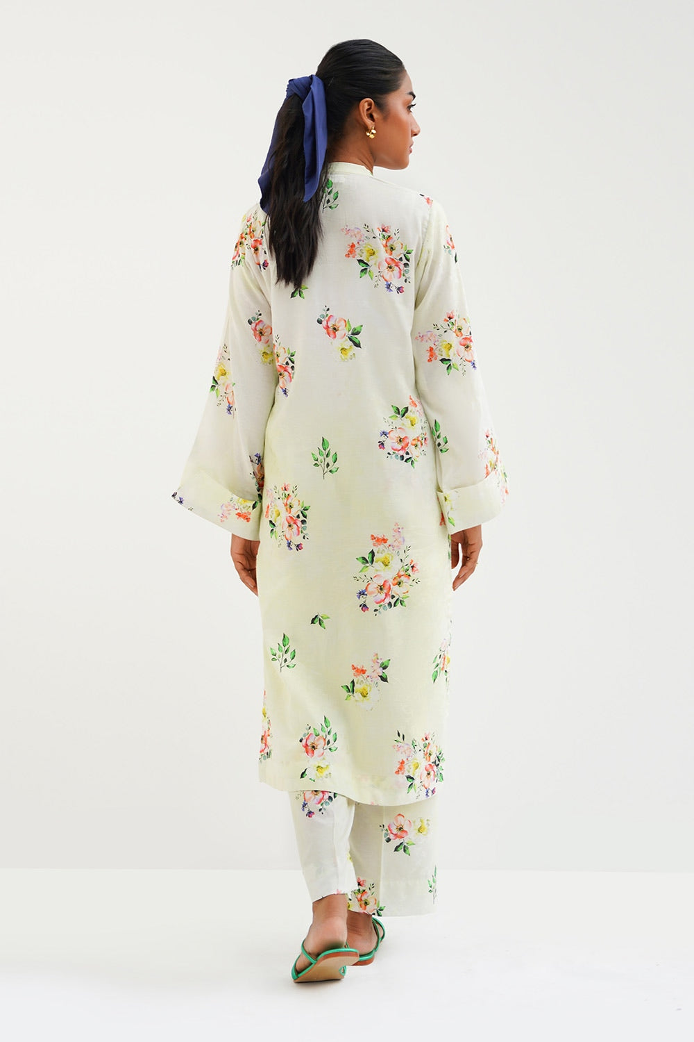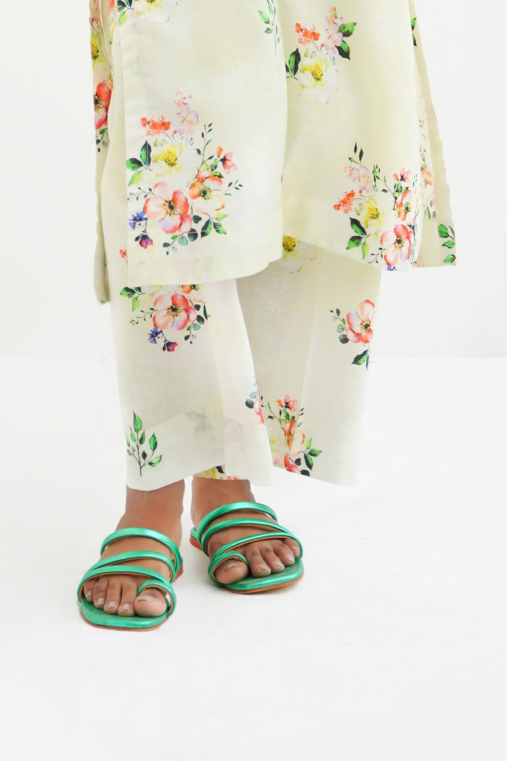 Ready to wear Create a style statement with this 2PC  light green floral print kurta set with a V-neckline and straight trousers. Crafted from lightweight fabric, this set offers a relaxed fit and a vibrant, summery look. Perfect for casual outings.