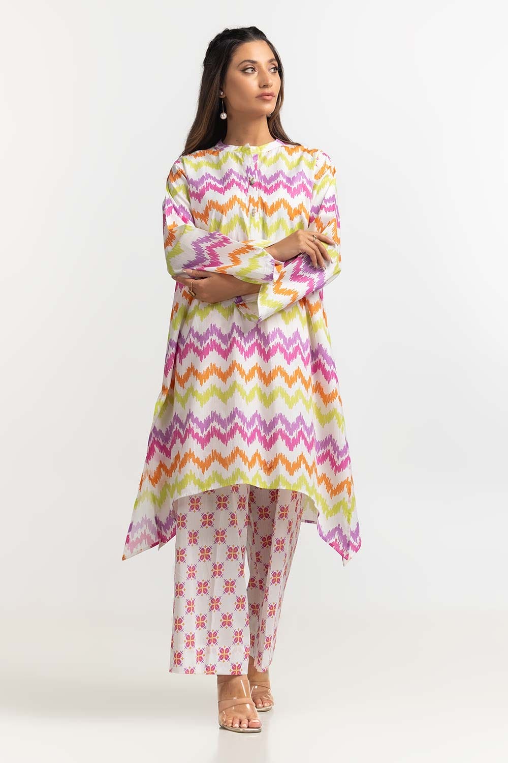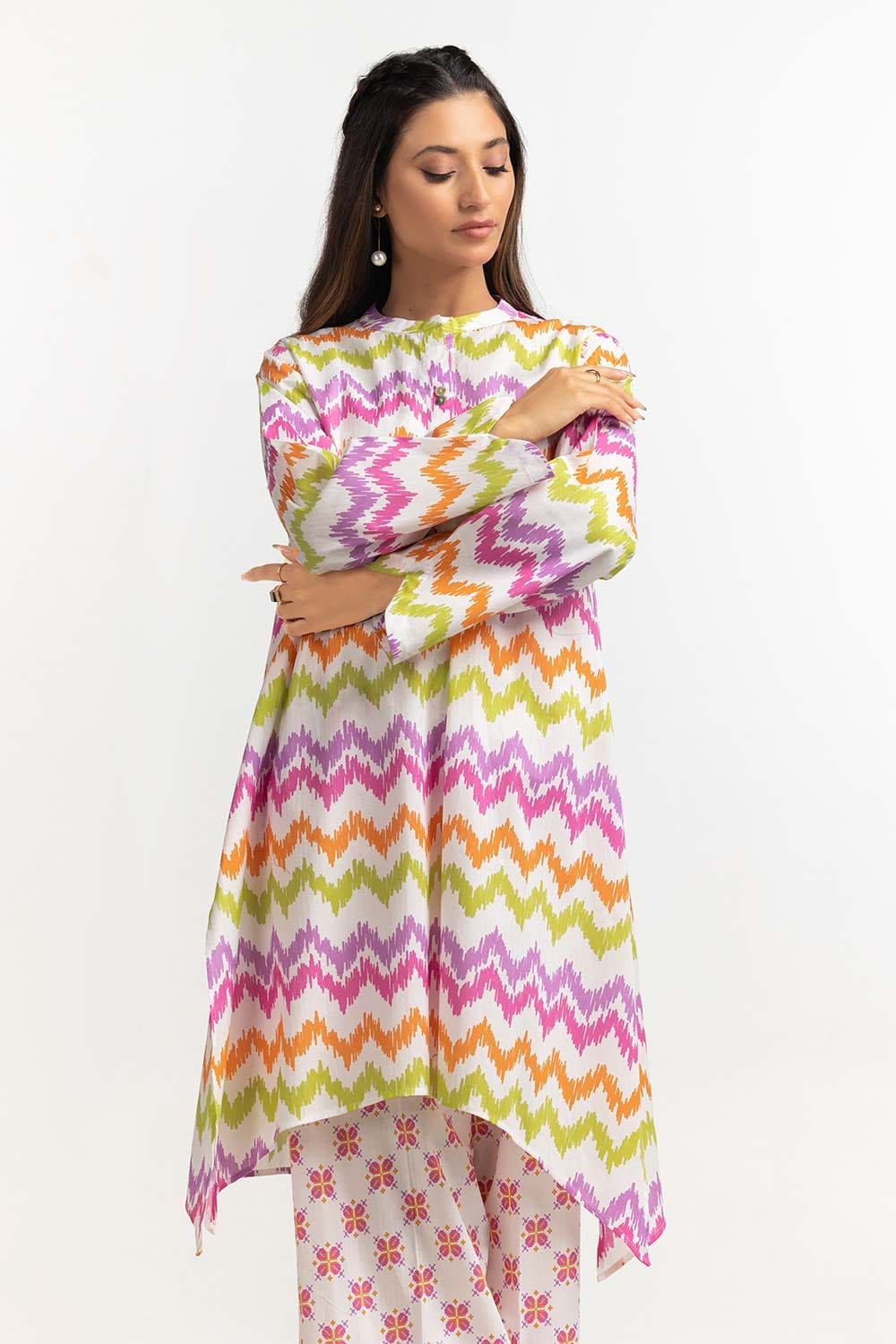 Ready to wear Brighten your wardrobe with this 2PC vibrant zigzag print kurta paired with patterned pants. The colorful design and comfortable fit make it an ideal choice for casual wear, adding a touch of fun to your everyday style.