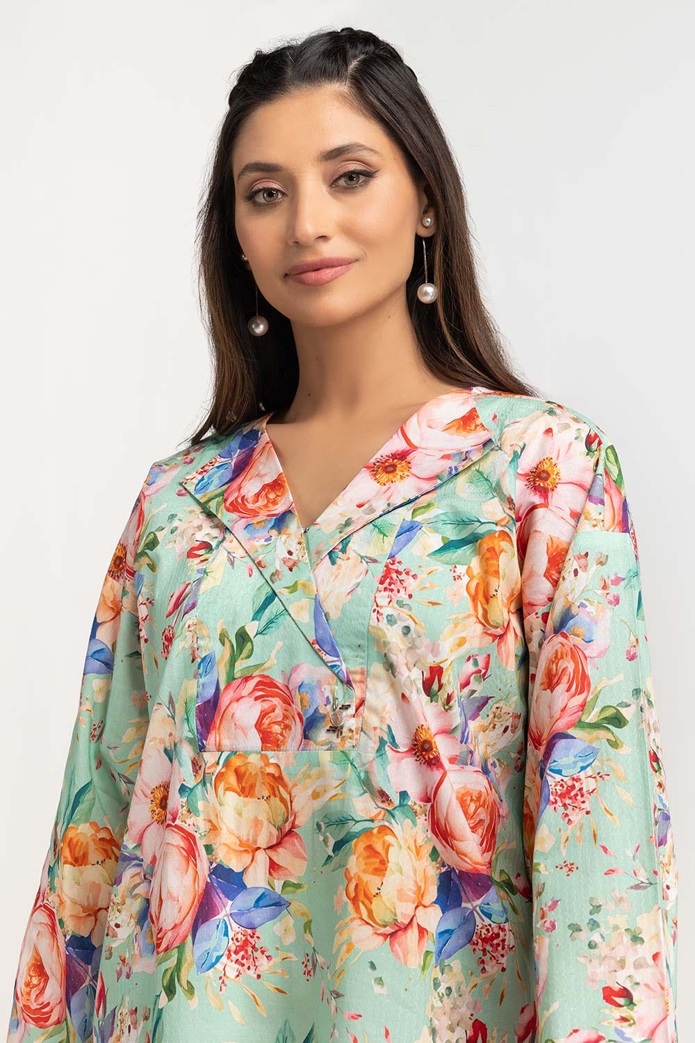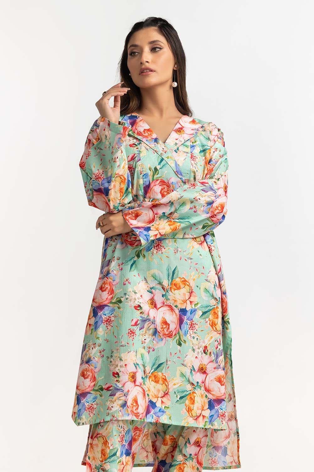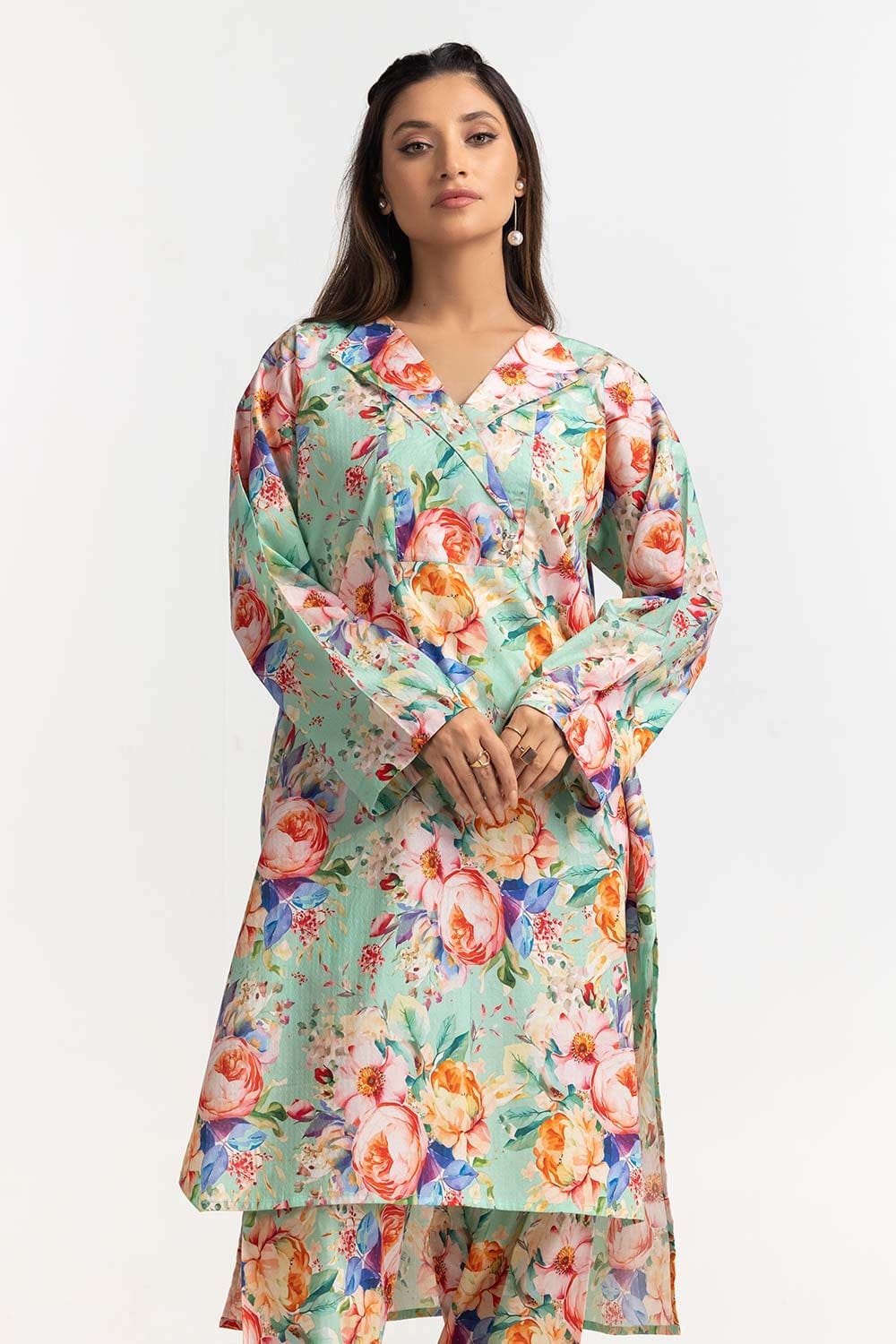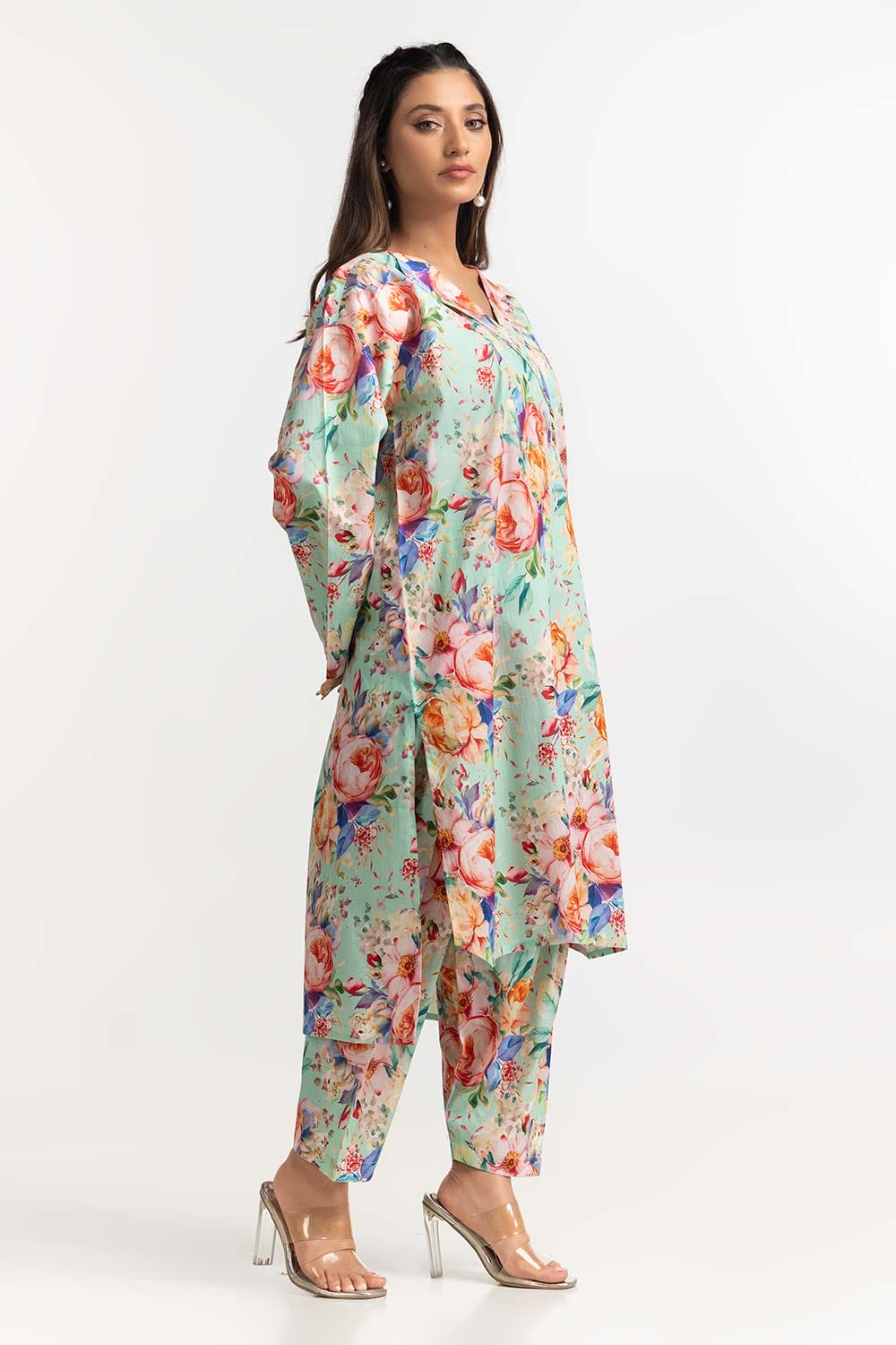 Ready to wear Step into style with this 2PC floral print suit. The soft pastel hues and blooming flower design on the kurta and pants create a refreshing look. The kurta features a  V-neckline and full sleeves. The matching pants are tailored for a relaxed fit, making this outfit perfect for daytime event