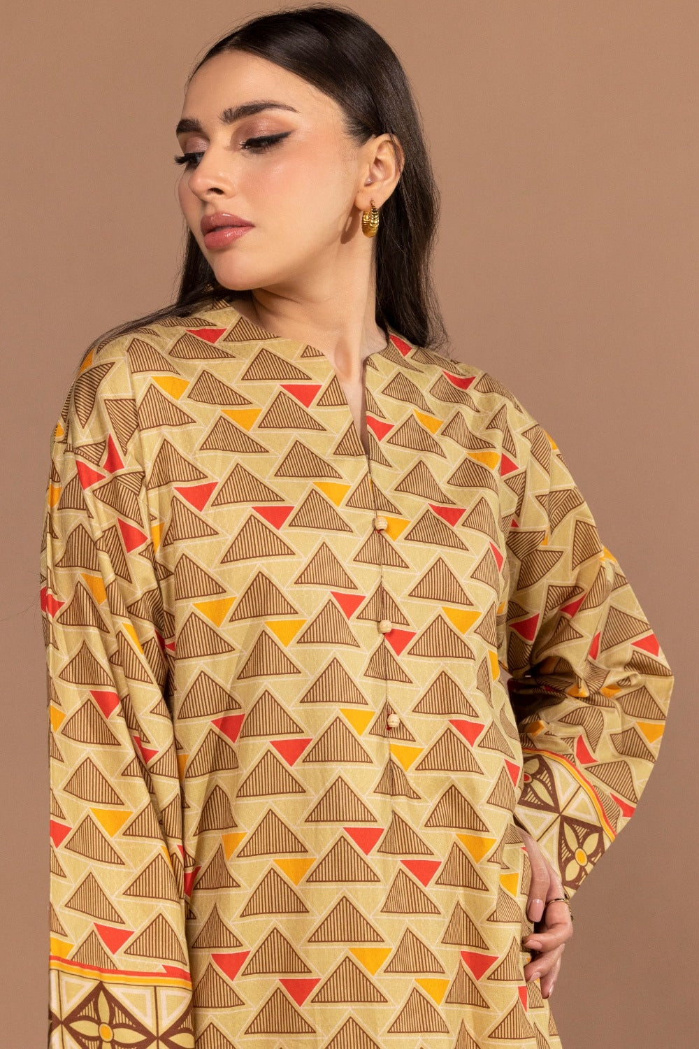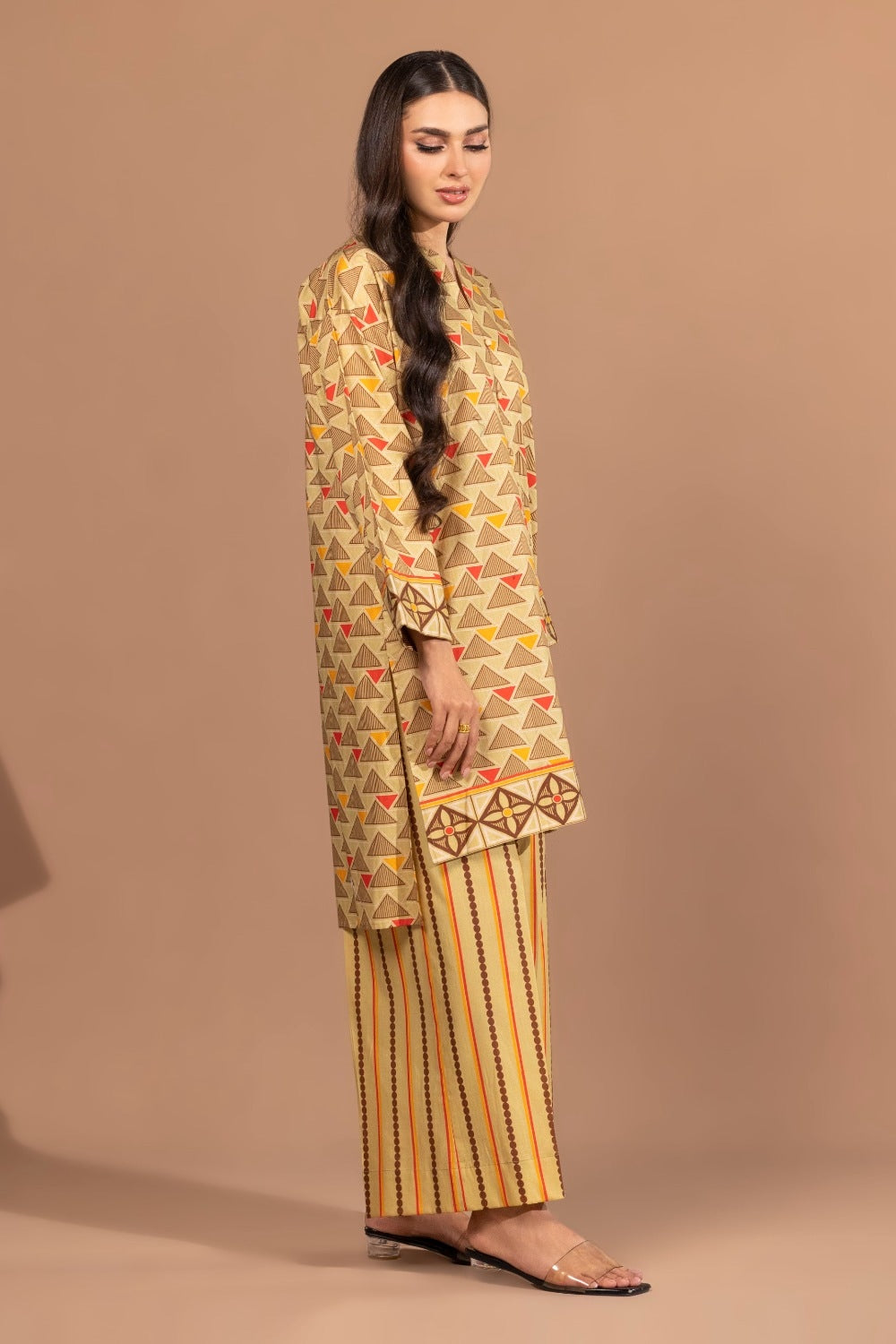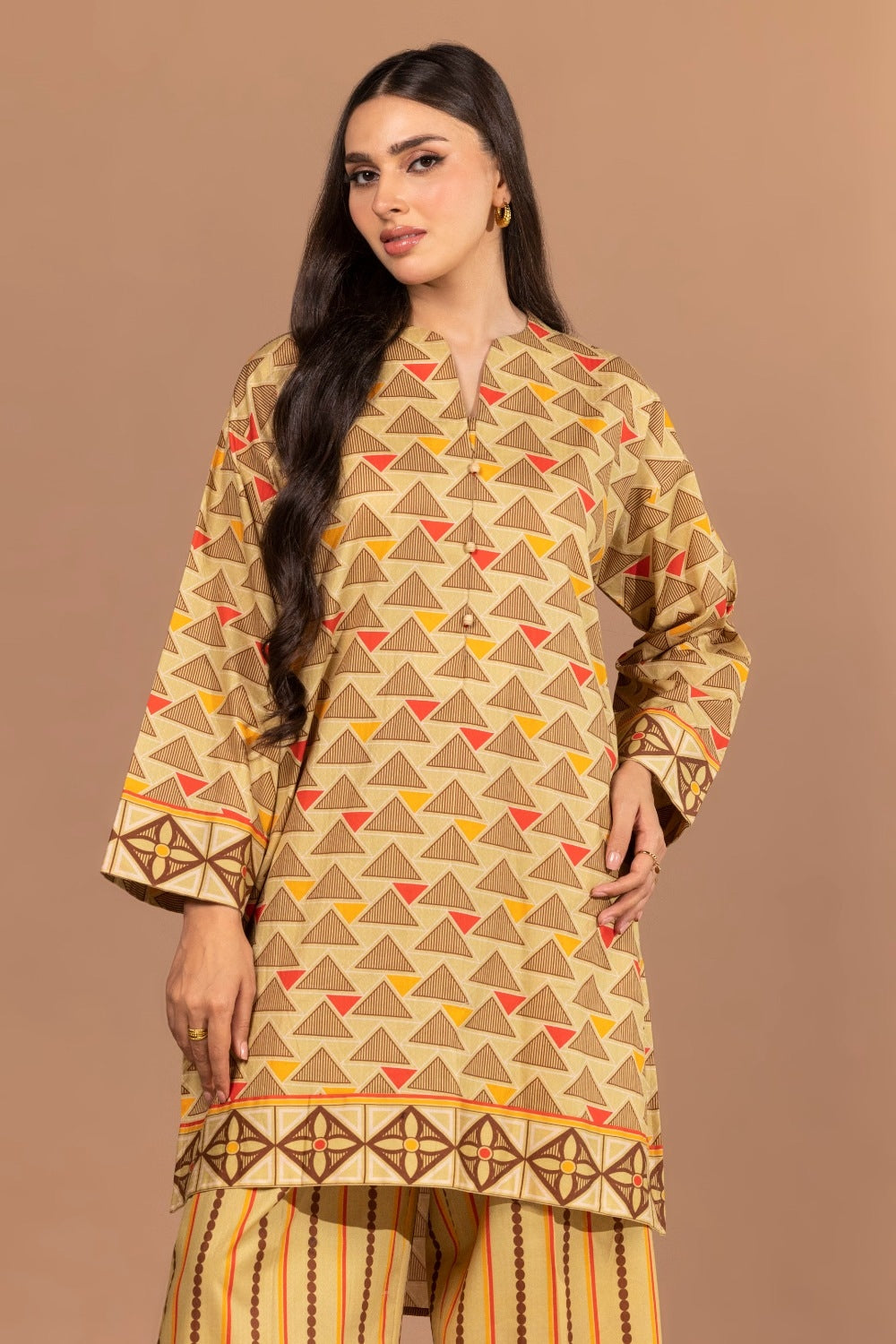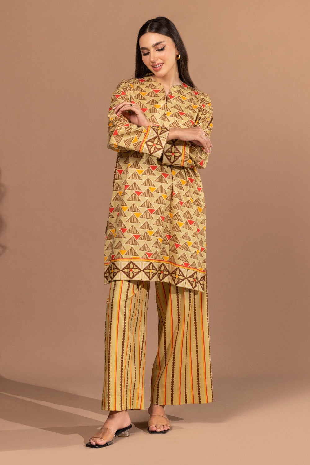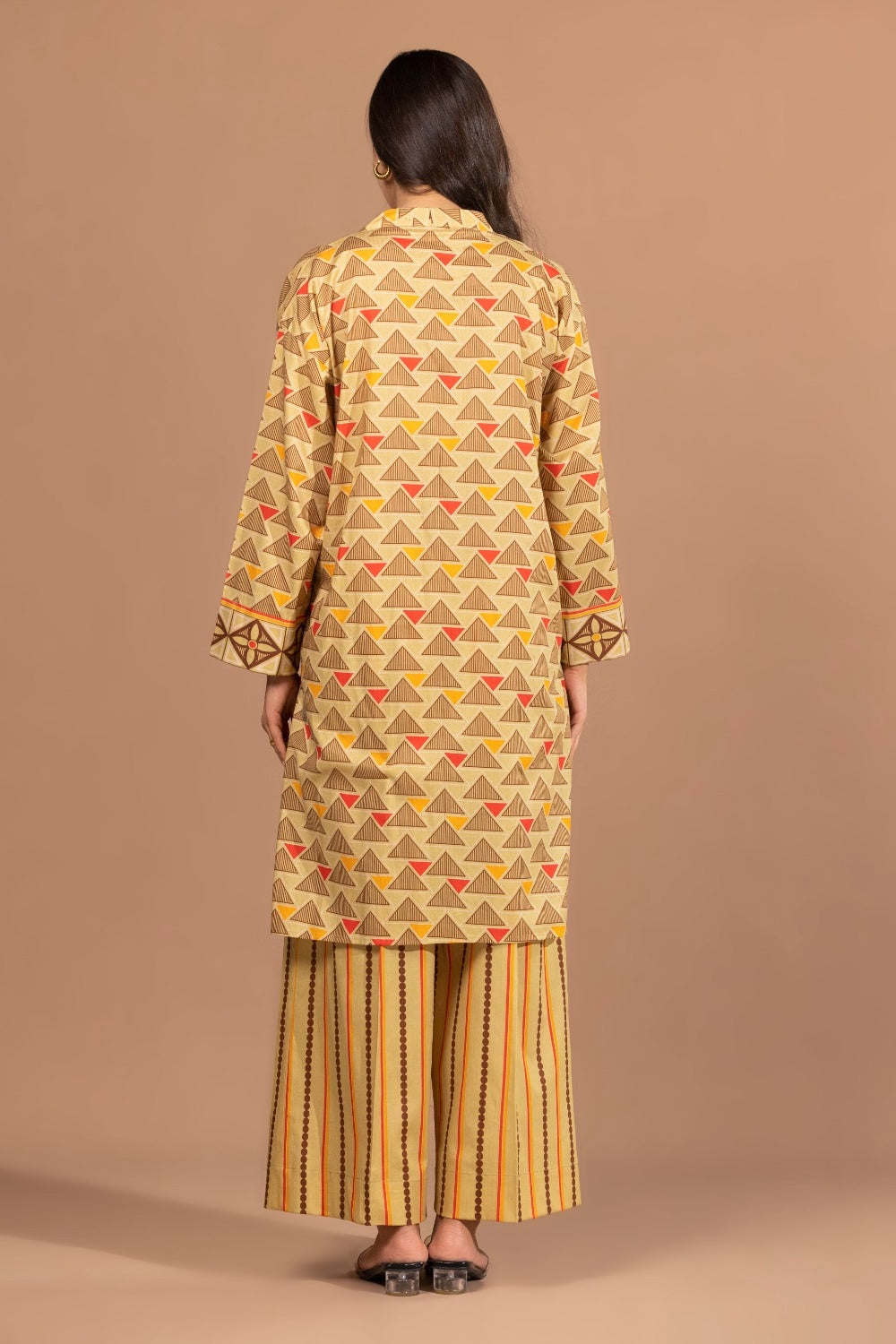 Ready to wear Elevate your style with this 2PC beige geometric print kurta, featuring a mandarin collar and full sleeves. Paired with striped wide-leg pants, this ensemble is perfect for adding a touch of sophistication to your casual wardrobe.